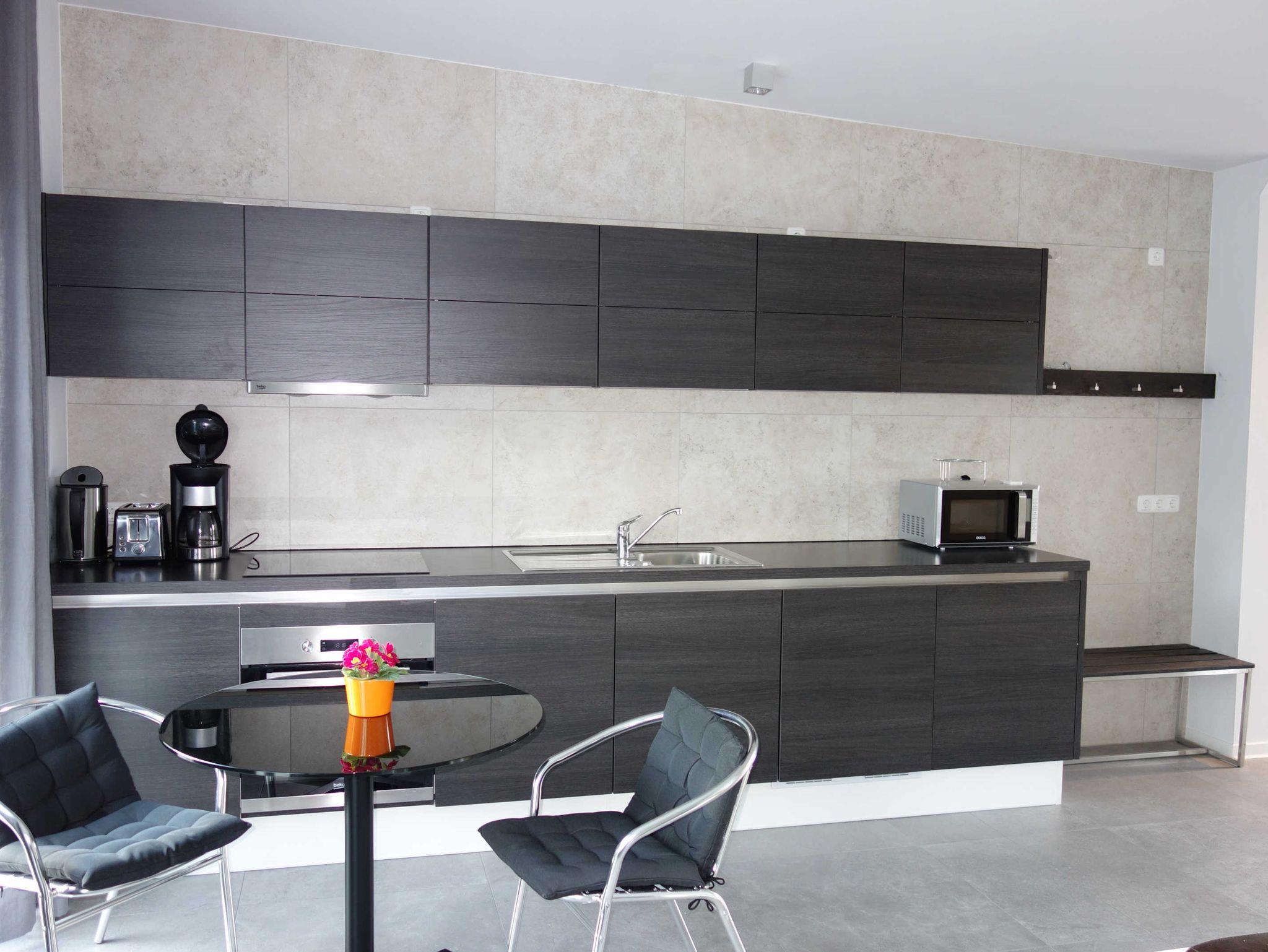 Die komplett ausgestattete Küchenzeile verfügt über einen Kühlschrank, einen Gefrierschrank, einen Induktionsherd mit 4 Kochfeldern, einen Geschirrspüler, einen Backofen, einen Wasserkocher und eine Kaffeemaschine.