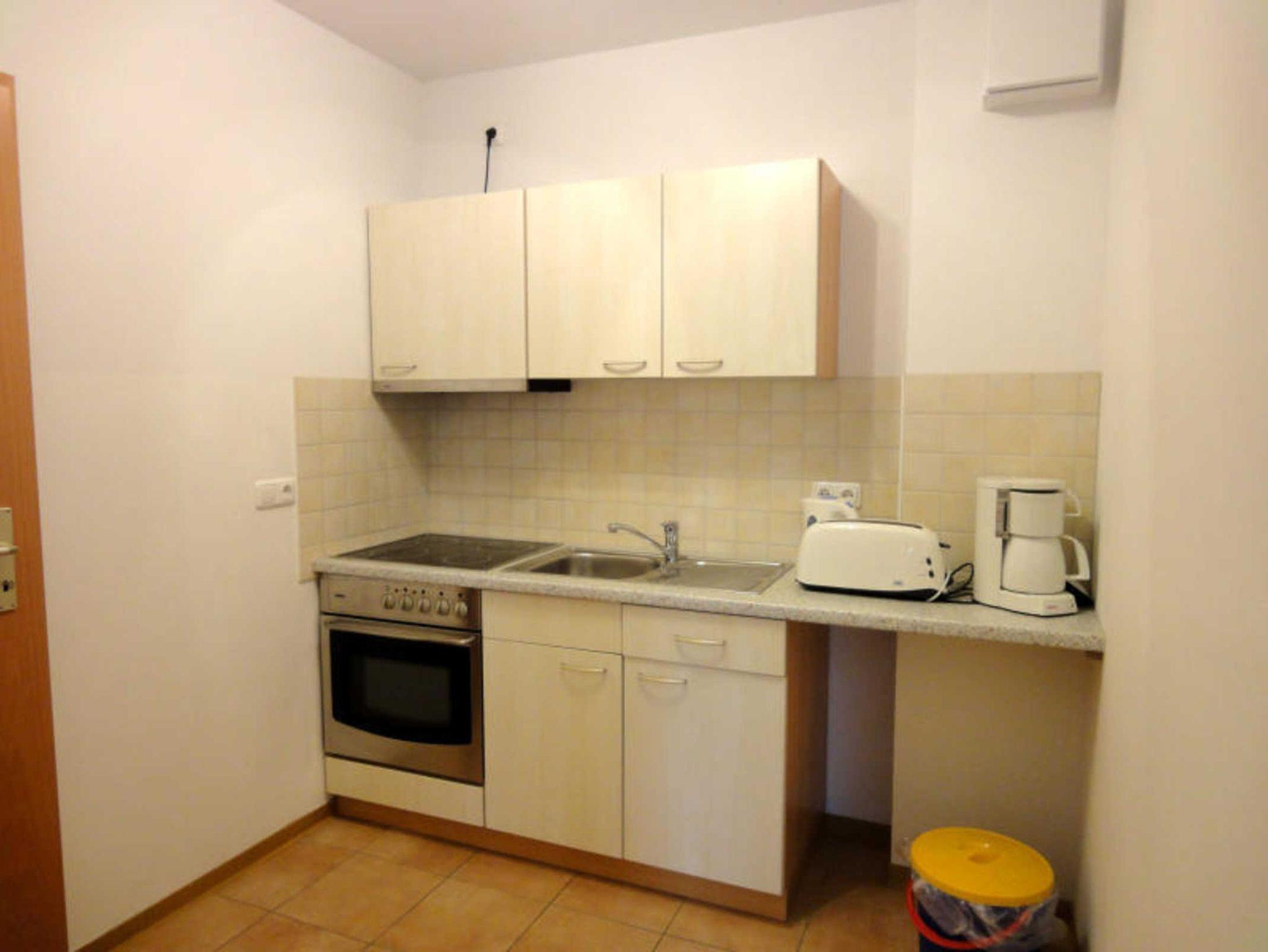 Die halboffene Küche ist vollständig ausgestattet unter anderem mit einem Ceranfeld (4 Kochfelder), einer Backröhre, einer Kaffeemaschine und einem Wasserkocher. Der Kühlschrank steht in einem kleinem Raum neben der Küche.
