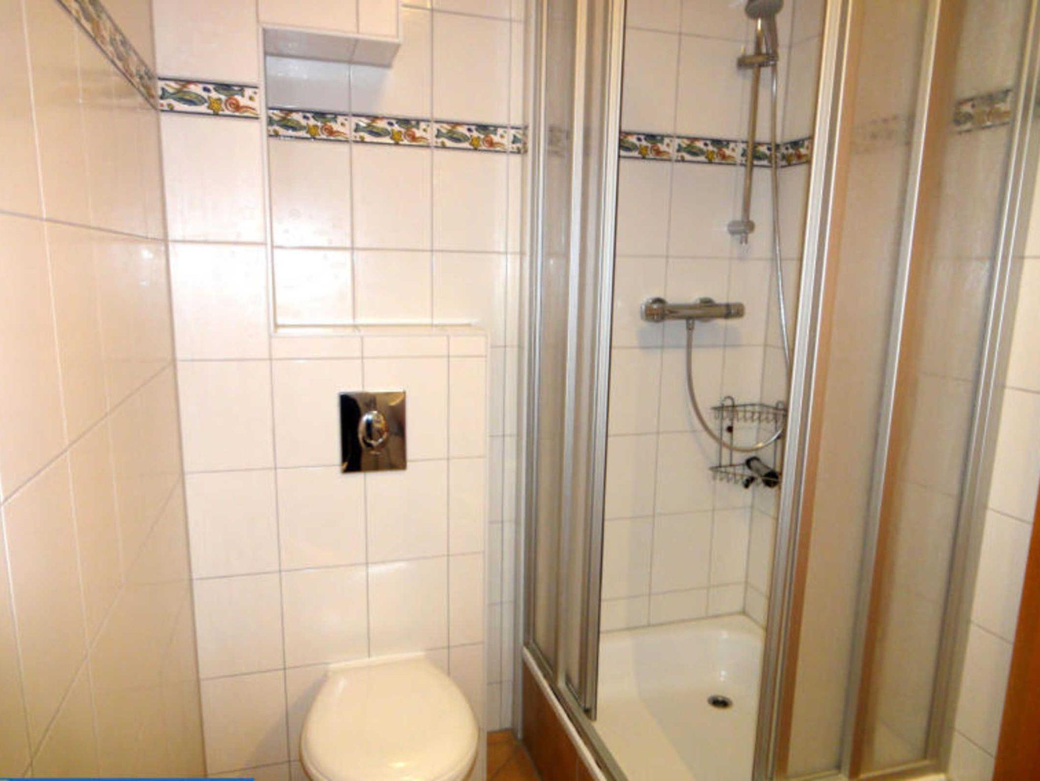Im gefliesten Bad befinden sich die Dusche und das WC.