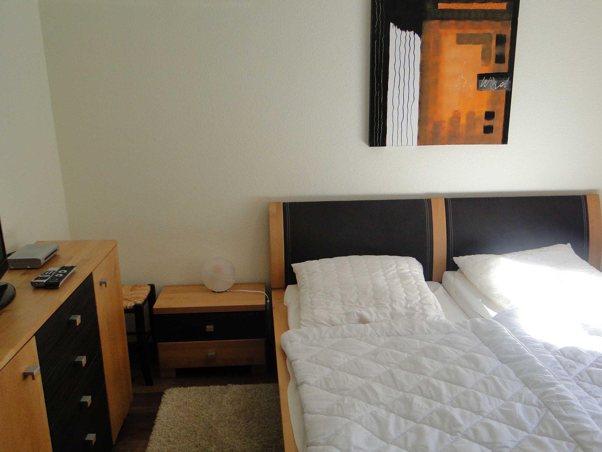 Ein geräumiger Kleiderschrank mit Bügeln und eine Kommode sorgen im Schlafzimmer dafür, dass Sie Ihre Garderobe immer aufgeräumt vorfinden, wenn Sie morgens im bequemen Doppelbett erwachen. Hier gibt es auch einen modernen Flachbildschirm.