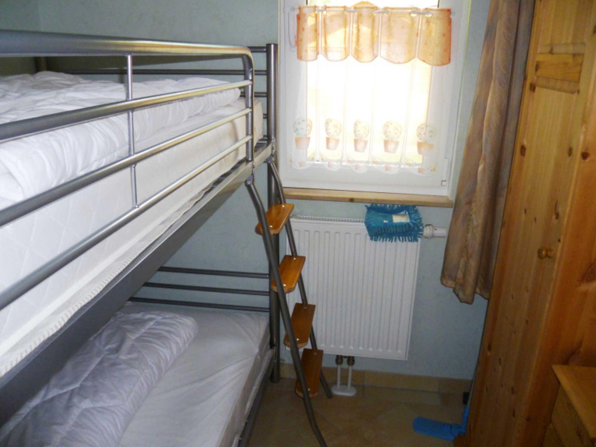 Ein Doppelbett steht in dem einem Schlafzimmer, ein Etagenbett in dem anderem Schlafzimmer.