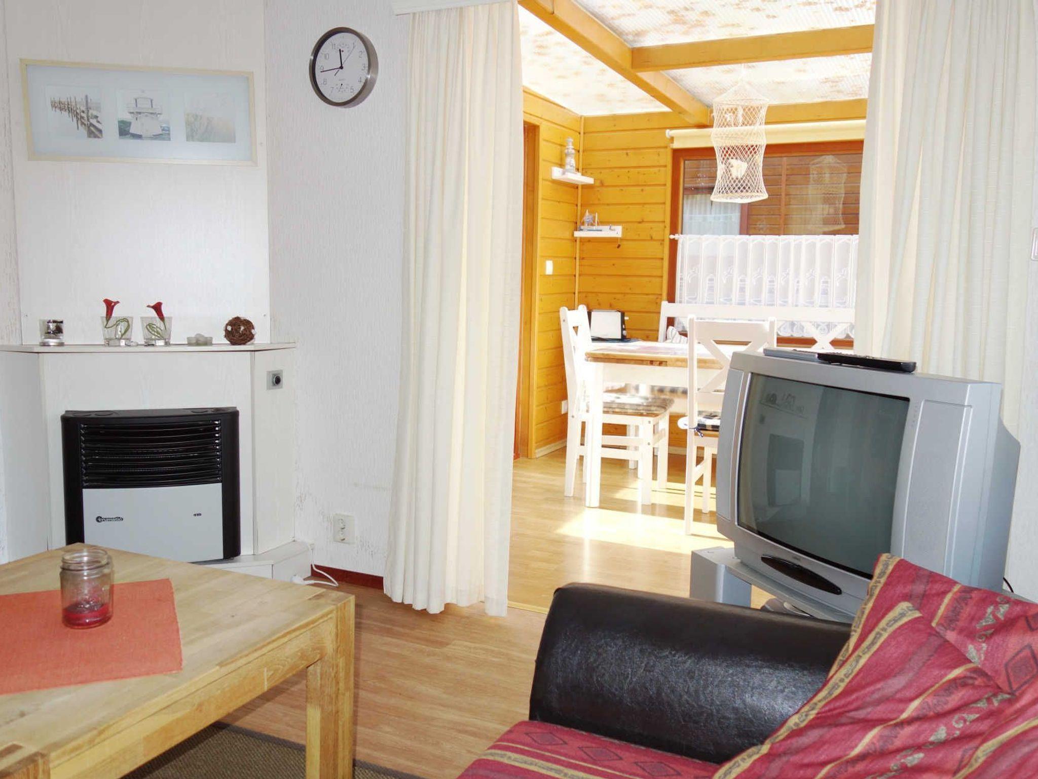 Im Ferienhaus befinden sich 2 kleine Schlafzimmer (eines mit frz. Bett, eines mit Etagenbett), ein Wohnzimmer mit Couch und Fernseher, ein Bad mit Dusche und WC, ein Esszimmer mit Esstisch und Stühle und eine Miniküche mit Kühlschrank.