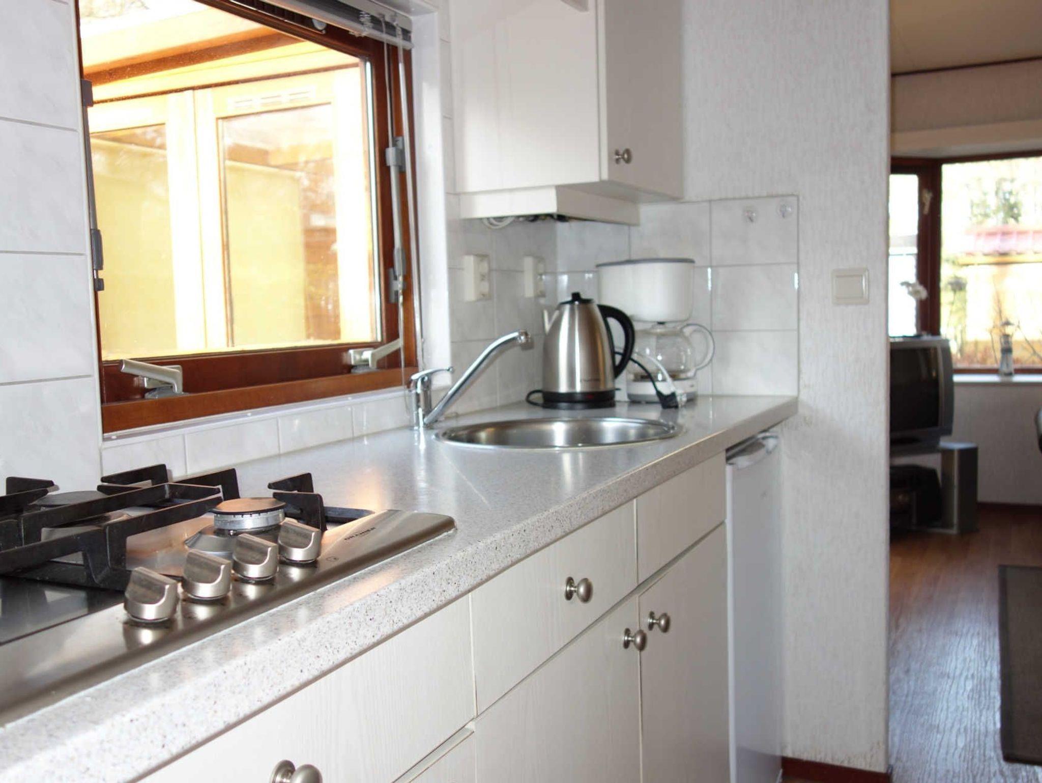 Die Küchenzeile verfügt u.a. über einen Kühlschrank, 4 Gas Kochstellen, eine Kaffeemaschine und einen Wasserkocher.