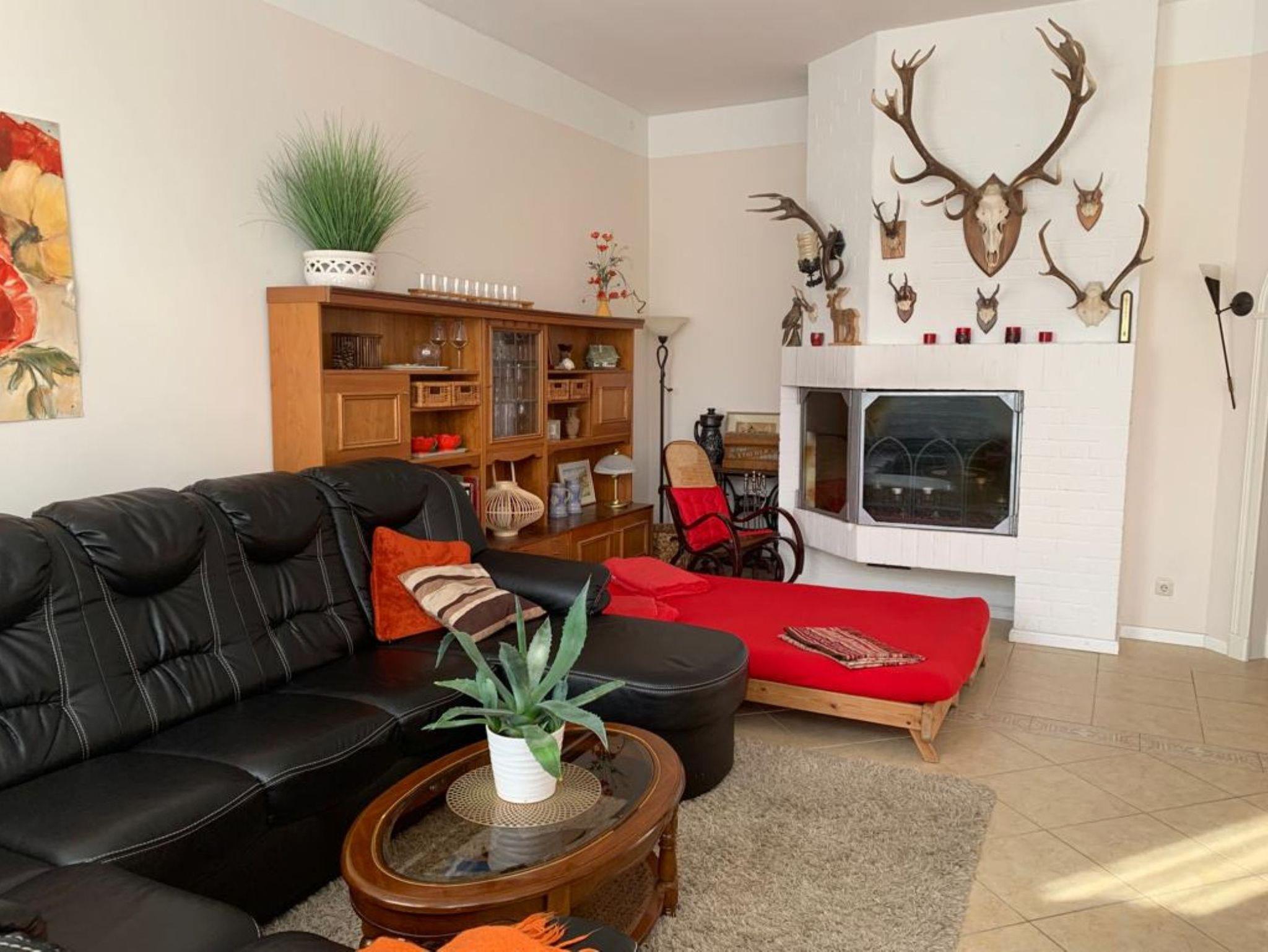 Das große Wohnzimmer verfügt über einen Kamin, einen Esstisch mit 6 Stühlen, einer gemütlichen Couchgarnitur, einem Radio und einem Fernseher. Im Schlafzimmer steht ein Doppelbett.