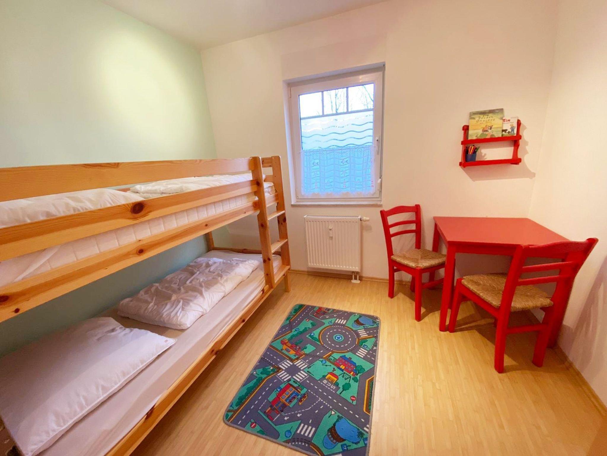 • II Schlafzimmer: Etagenbett mit 90x200 cm Matratze, Spielteppich, Kommode, Kindertisch und 2 Stühle, Spiele, Lampe