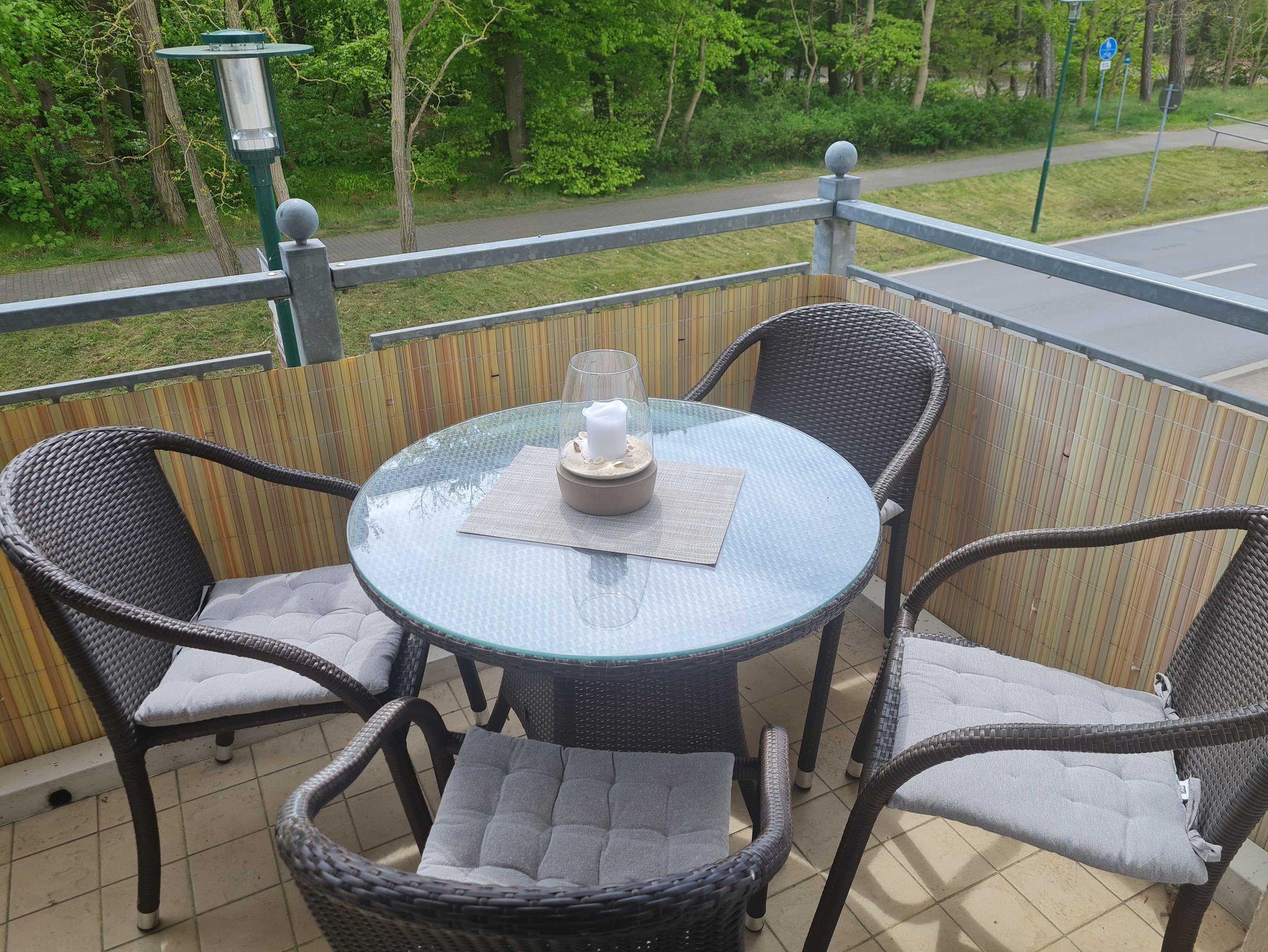 • Balkon: Südausrichtung, Tisch, Stühle, Strandkorb, Balkonumrandung
