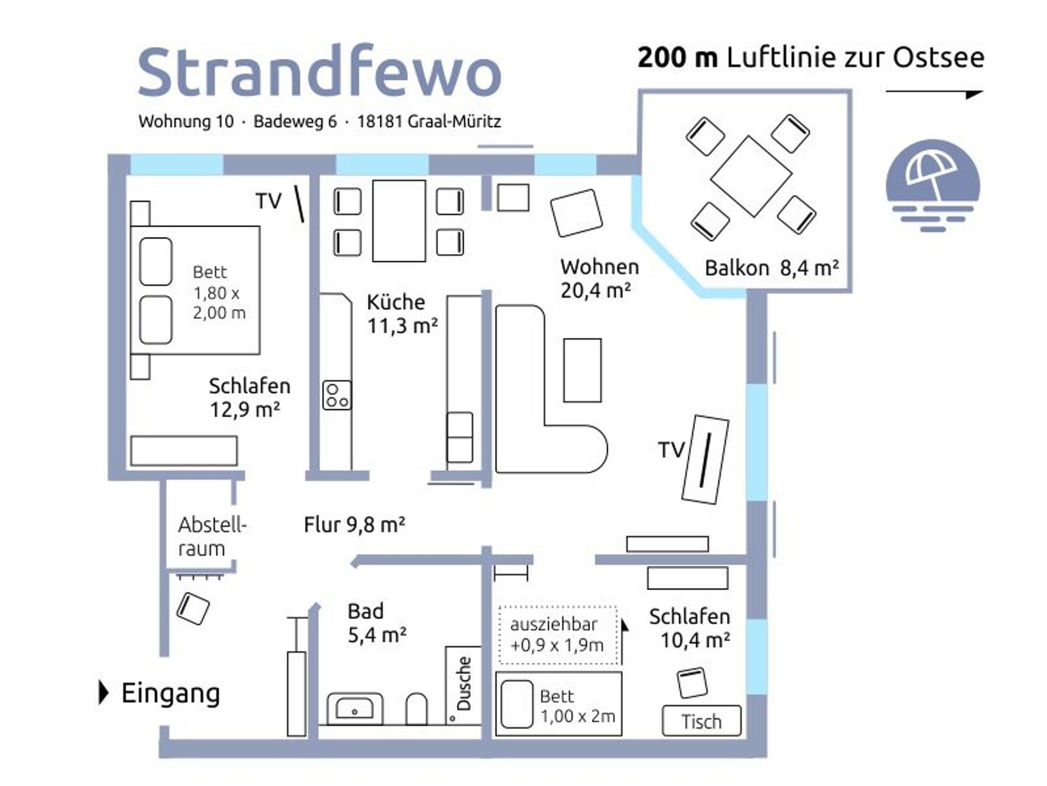 Nur 100m vom Strand entfernt liegt diese gemütlich und modern eingerichtete 3-Raum-Wohnung im 2. OG (mit Aufzug) mit ca. 76 m² Wohnfläche und einem sonnigen Nord-West-Balkon. Die sehr familienfreundliche Wohnung kann mit bis zu 4 Personen genutzt werden. Zwei gemütliche Schlafzimmer bieten hierfür Platz. Praktisch erreichbar befindet sich im Haus ein Keller der Platz für Fahrräder o. ä. bietet. Der Wohnung ist ein kostenloser Stellplatz Nr. 29 zugeordnet. Eine Waschmaschine steht gegen Entgelt im Keller zur Verfügung. Ebenso können Sie hier kostenloses W-LAN nutzen.