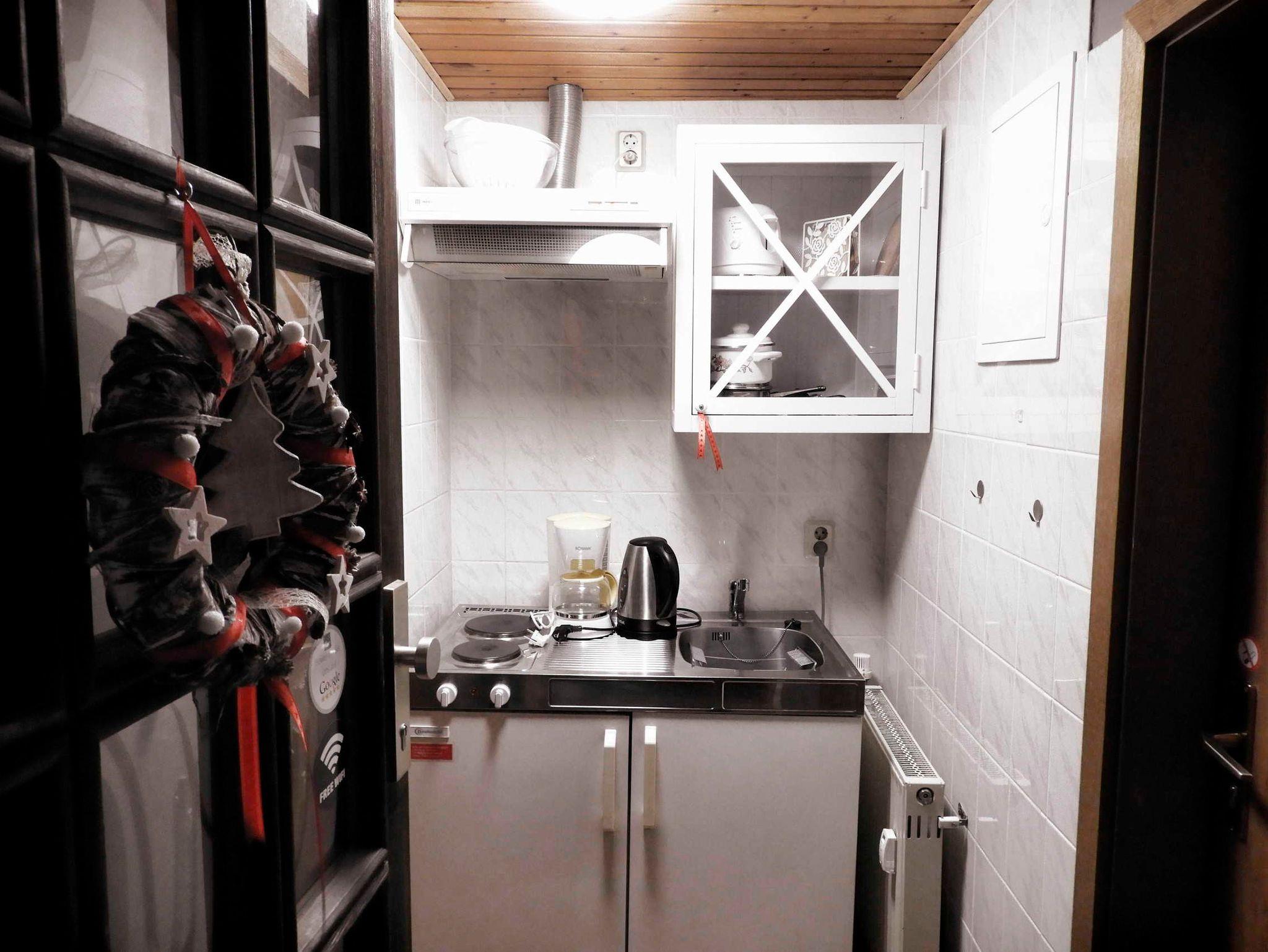 Die separate Gemeinschaftskochnische, die mit dem Ferienzimmer Heidehexe gemeinsam genutzt wird, ist komplett ausgestattet mit Kühlschrank, Tiefkühlfach, Herd (2 Kochfeldern), Kaffeemaschine, Wasserkocher und Toaster sowie ausreichend Geschirr.
