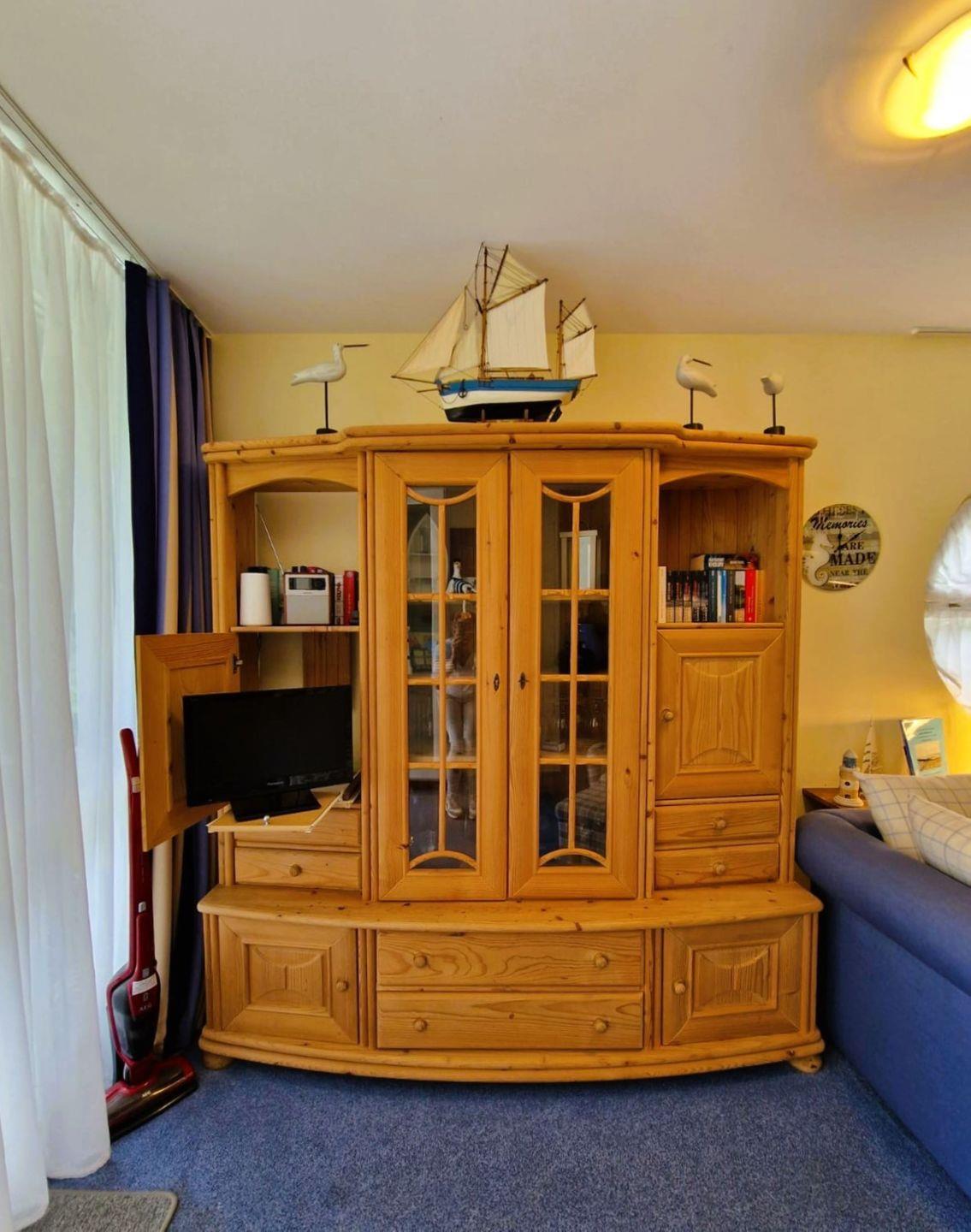 Wohnbereich mit kleinem Fernseher, dezent im Schrank versteckt