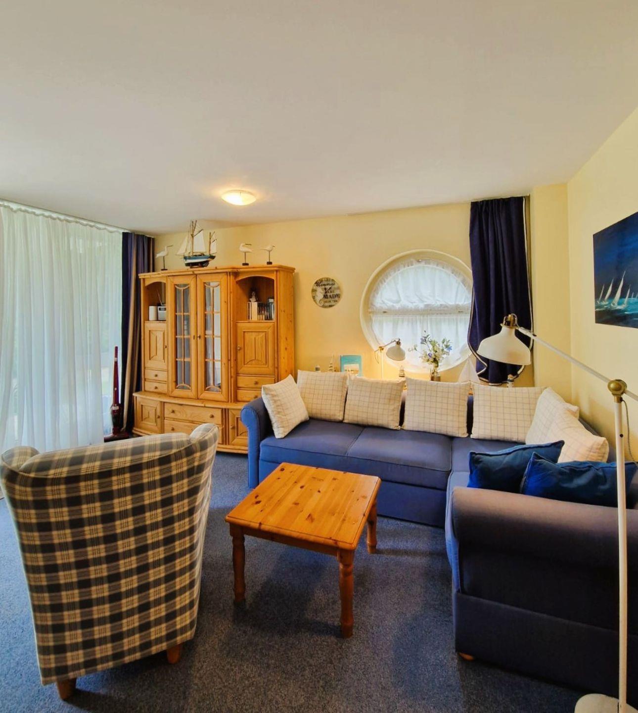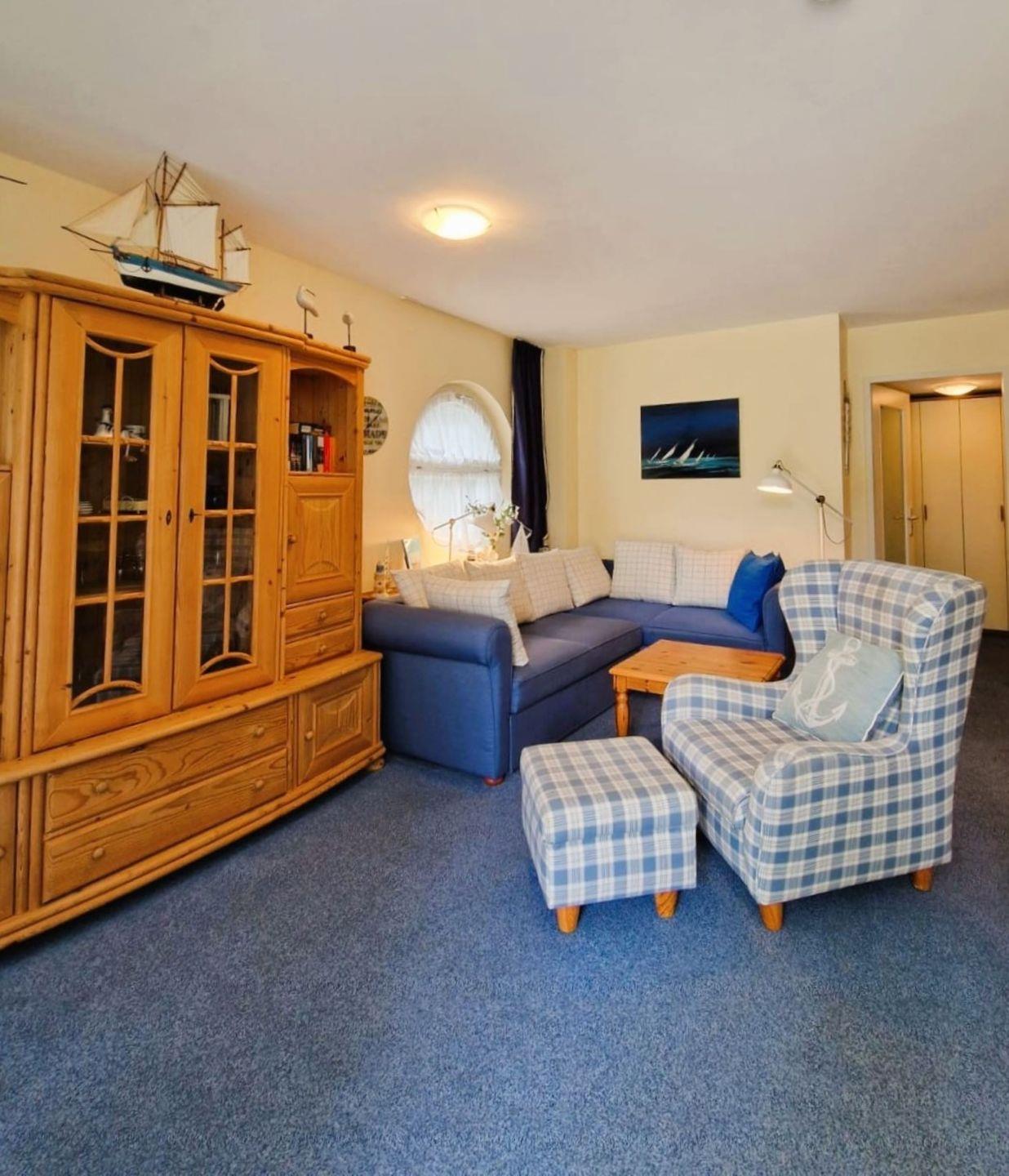 Im Wohnzimmer befindet sich eine Couch, im Schlafzimmer zwei Einzelbetten.