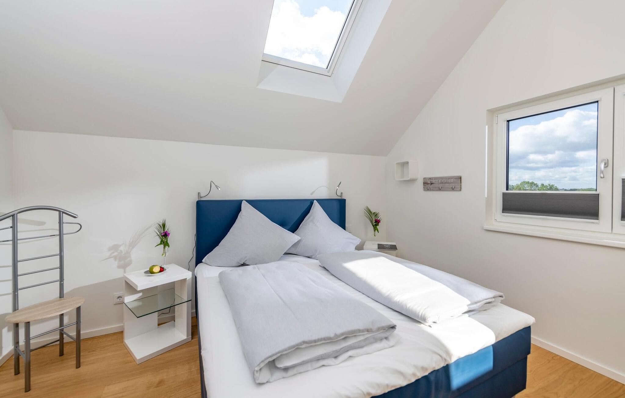 Det hyggelige soveværelse, udstyret med en dobbeltseng med boxspring, byder på en afslappende feriesøvn. Soveværelset har et ekstra fladskærms-tv.