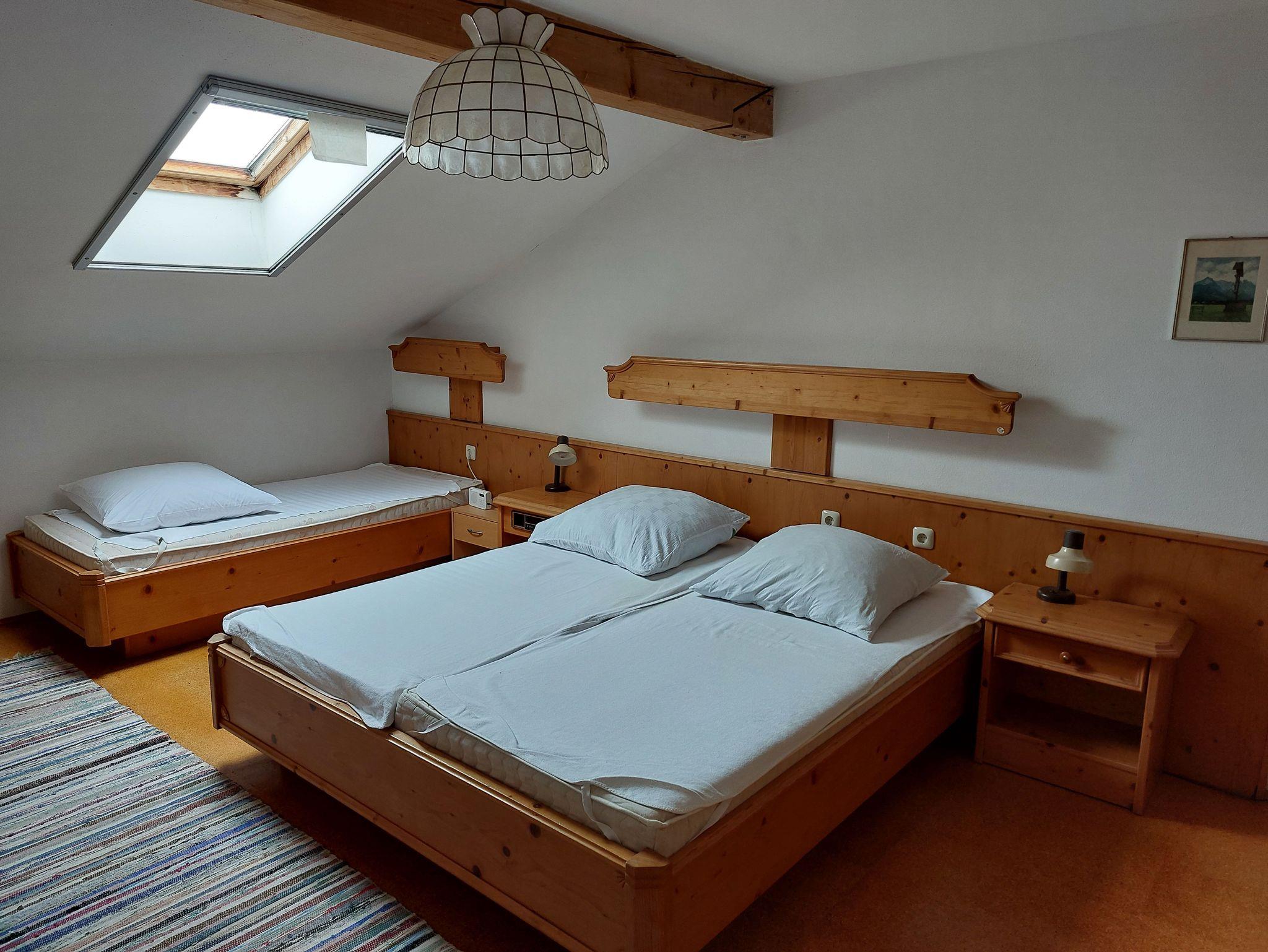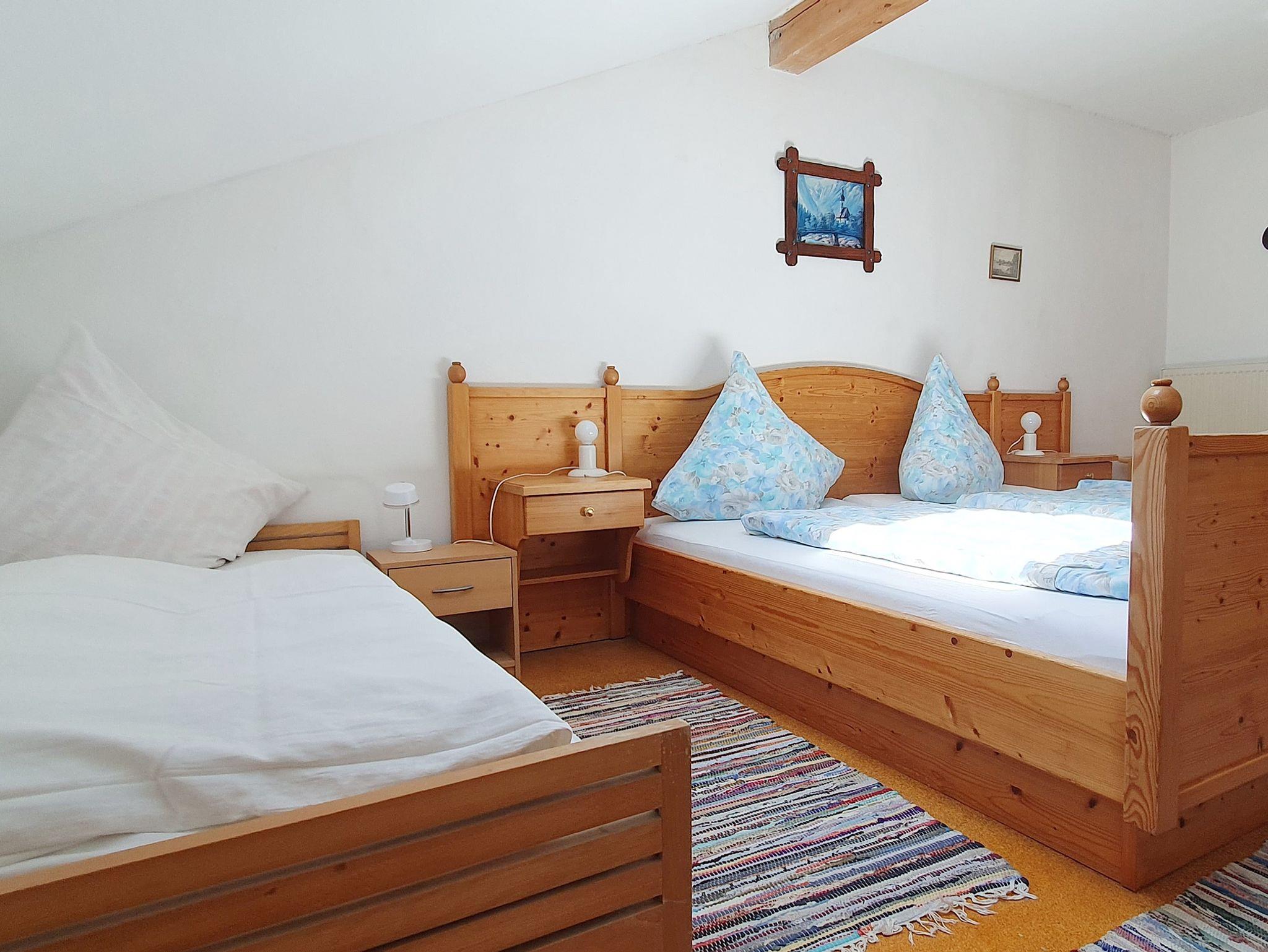 Ferienwohnung im Dachgeschoß mit Ostbalkon, Wohnschlafraum mit Schlafcouch für 2 Personen, 1 separates Schlafzimmer für 3 Personen. Kochnische mit Küchenzeile und Mikrowelle. Sat-TV und Telefon. Dusche/WC.