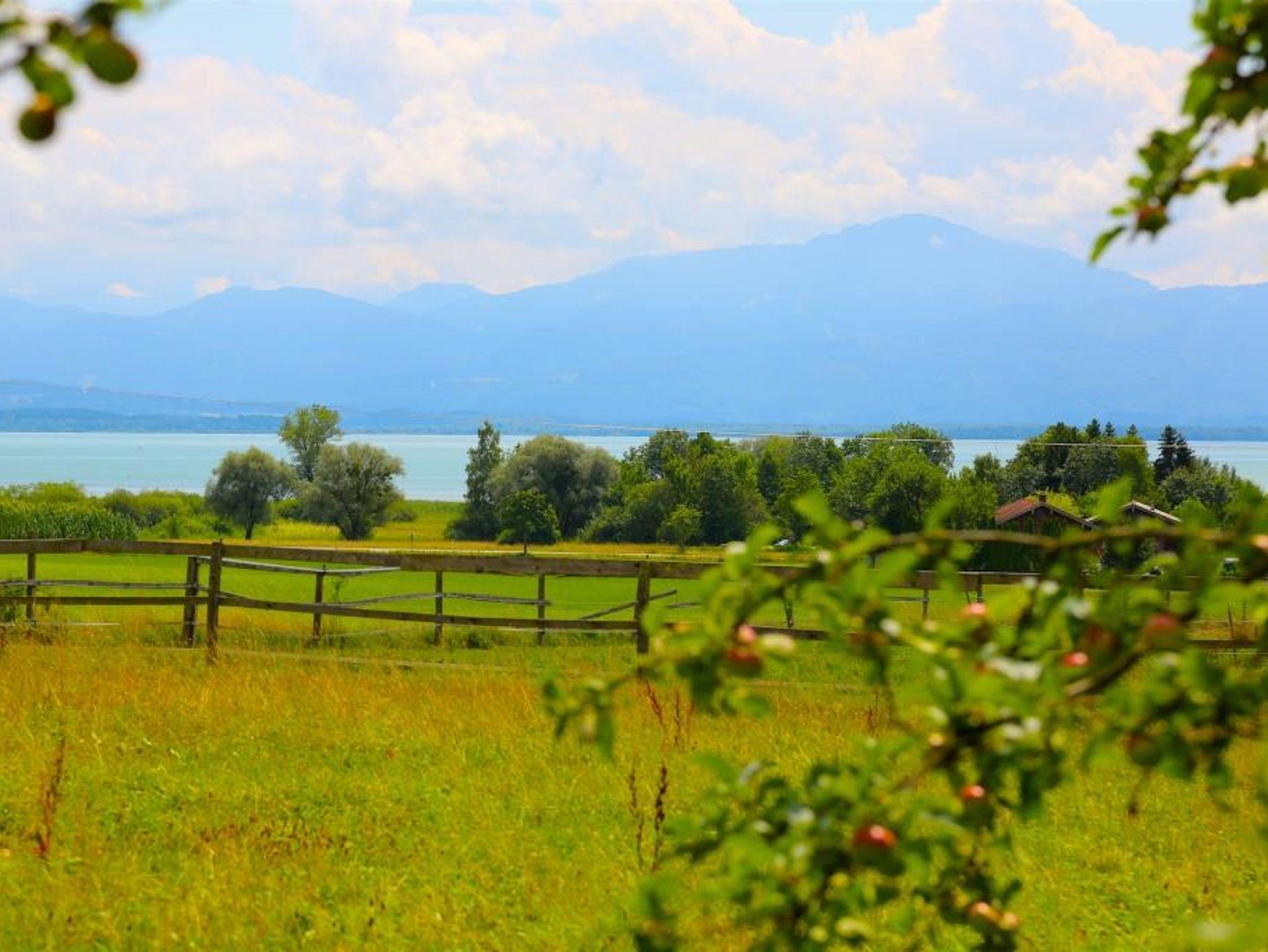 Freundlich eingerichtete Ferienwohnung im 2. OG mit Panoramafenstern, mit Blick auf den Chiemsee und auf die wunderschönen Chiemgauer Alpen. In der Wohnung sind zwei Schlafzimmer, dass Elternschlafzimmer mit einem Doppelbett sowie einem Einzelbett und in dem Kinderschlafzimmer, zwei Einzelbetten. Für gemütliches Kochen sorgt eine gut eingerichtete Küche.Zum Schlemmen und Genießen nach dem Kochen, sorgt eine ländlich eingerichteter Ess-/Wohnbereich. Im Badezimmer befindet sich eine Dusche und ein WC.- Bodenbeläge werden/wurden im Winter 21/22 im Wohbereich + Schlafzimmer saniert -
