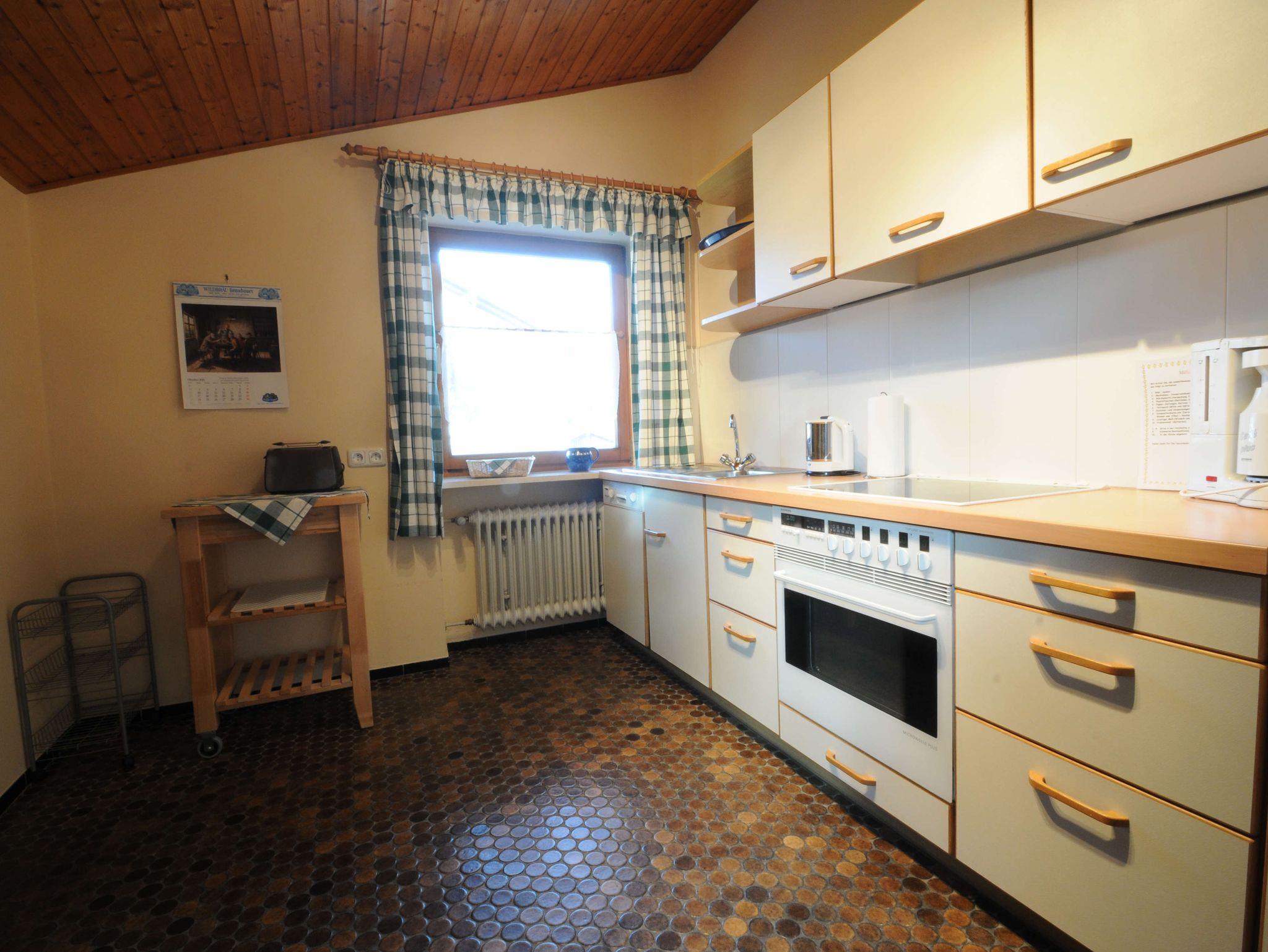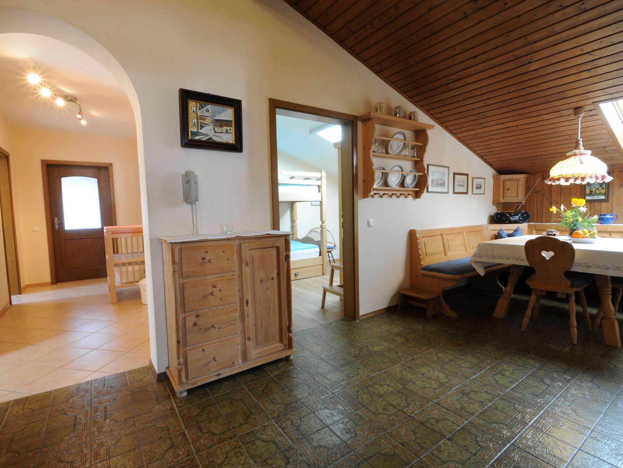 Die Ferienwohnung ist sehr großzügig und liebevoll eingerichtet und bietet durch das gemütlich-bayerische Ambiente und den vielen Extras höchsten Wohnkomfort.Zu den Räumlichkeiten auf der ganzen 1. Etage gehören: Eine große Wohndiele mit Essecke und Bauerntisch, sowie ein rustikaler offener Kamin und eine Diele mit Garderobe. Die voll ausgestattete große Küche verfügt über einen Geschirrspüler, Kühl- und Gefrierschrank, Wasserkocher, Kaffeemaschine, Eierkocher, Handrührgerät, Pürierstab und Toaster. Ein kleiner Vorratsraum ist ebenfalls vorhanden. Ein gemütliches Wohnzimmer mit großer Couchecke, TV und Zugang zum großen Südbalkon, überdacht mit Sitzgruppe, steht unseren Gästen zur Verfügung. Schlafmöglichkeiten gibt es in einem Schlafzimmer mit Doppelbett und Balkon, einem weiteren Schlafzimmer mit Doppelbett (in Überlänge 2.20 m) mit Balkon und einem Kinderzimmer mit Etagenbett und Einzelbett (für 7. Person). Das Badezimmer ist mit Dusche/WC, zwei Waschtischen, Haarfön und Kosmetikspiegel ausgestattet. In der Wohnung befindet sich auch eine zweite Dusche mit WC.