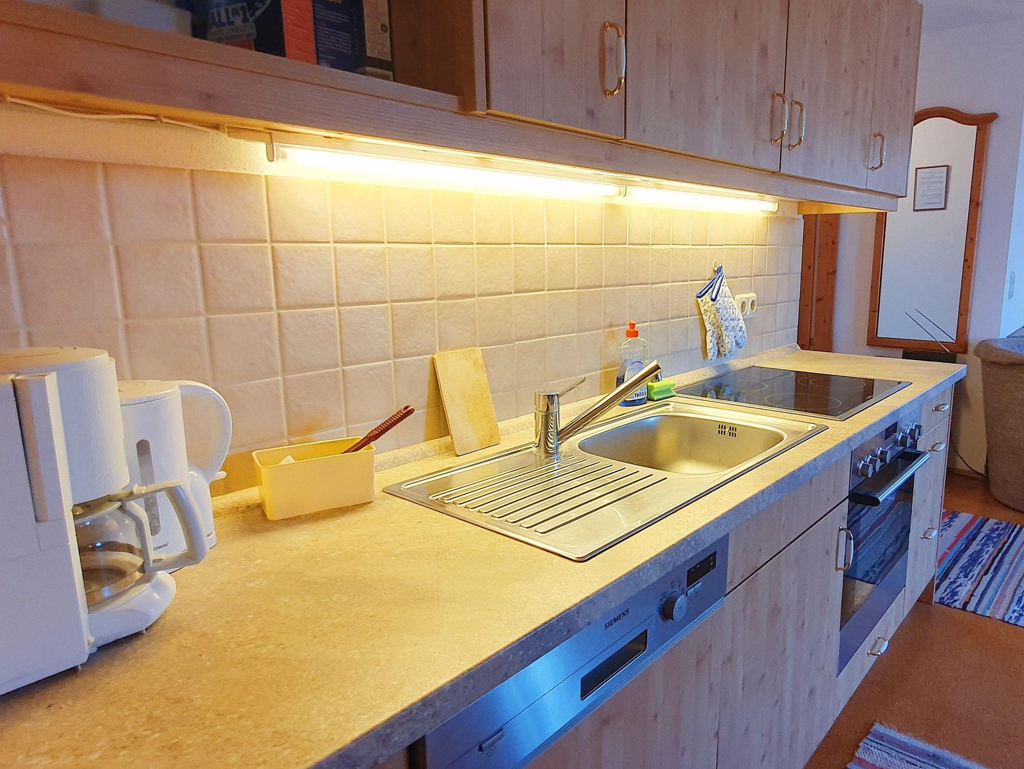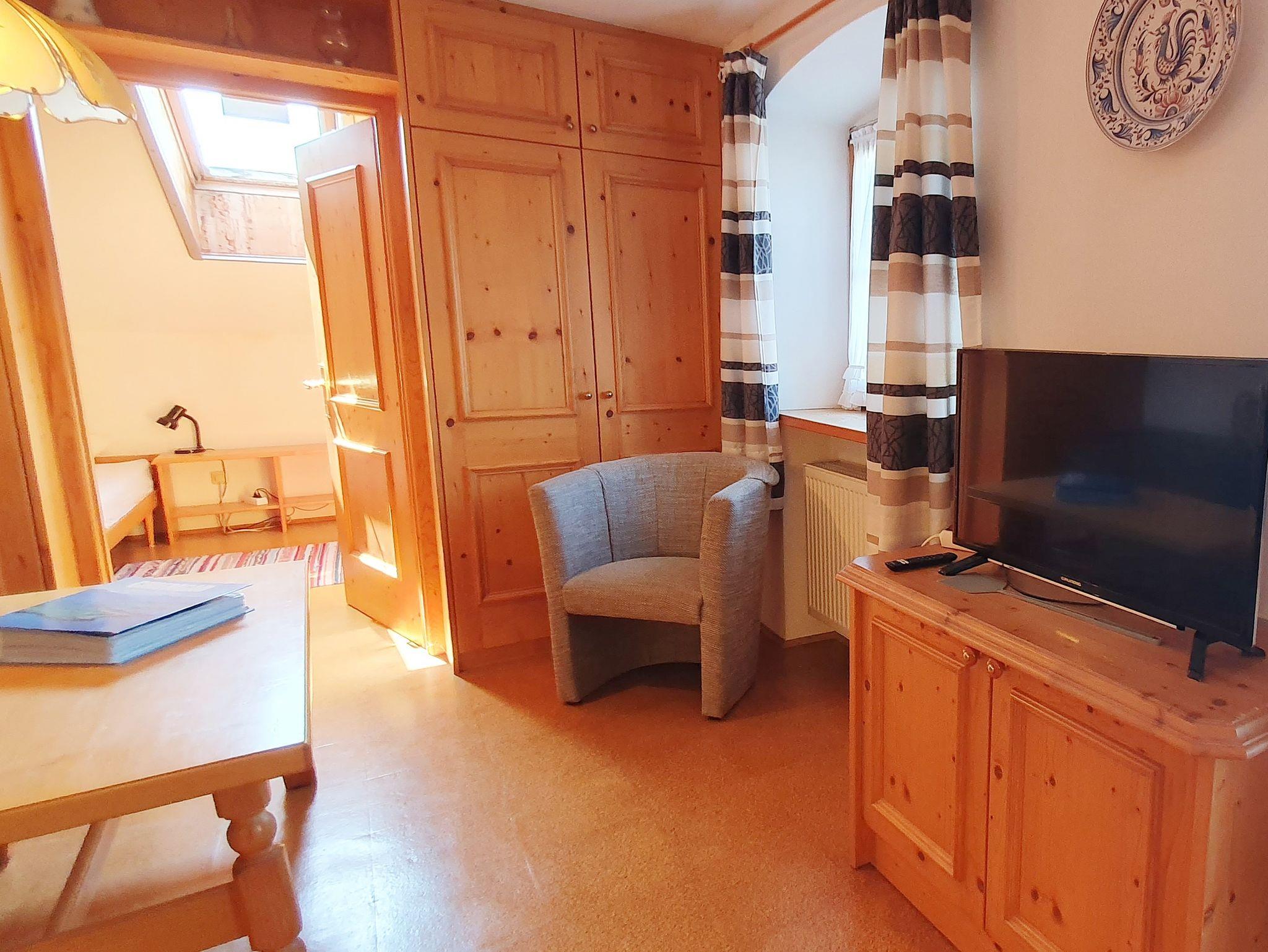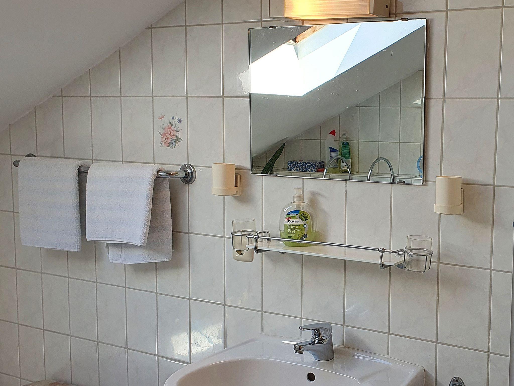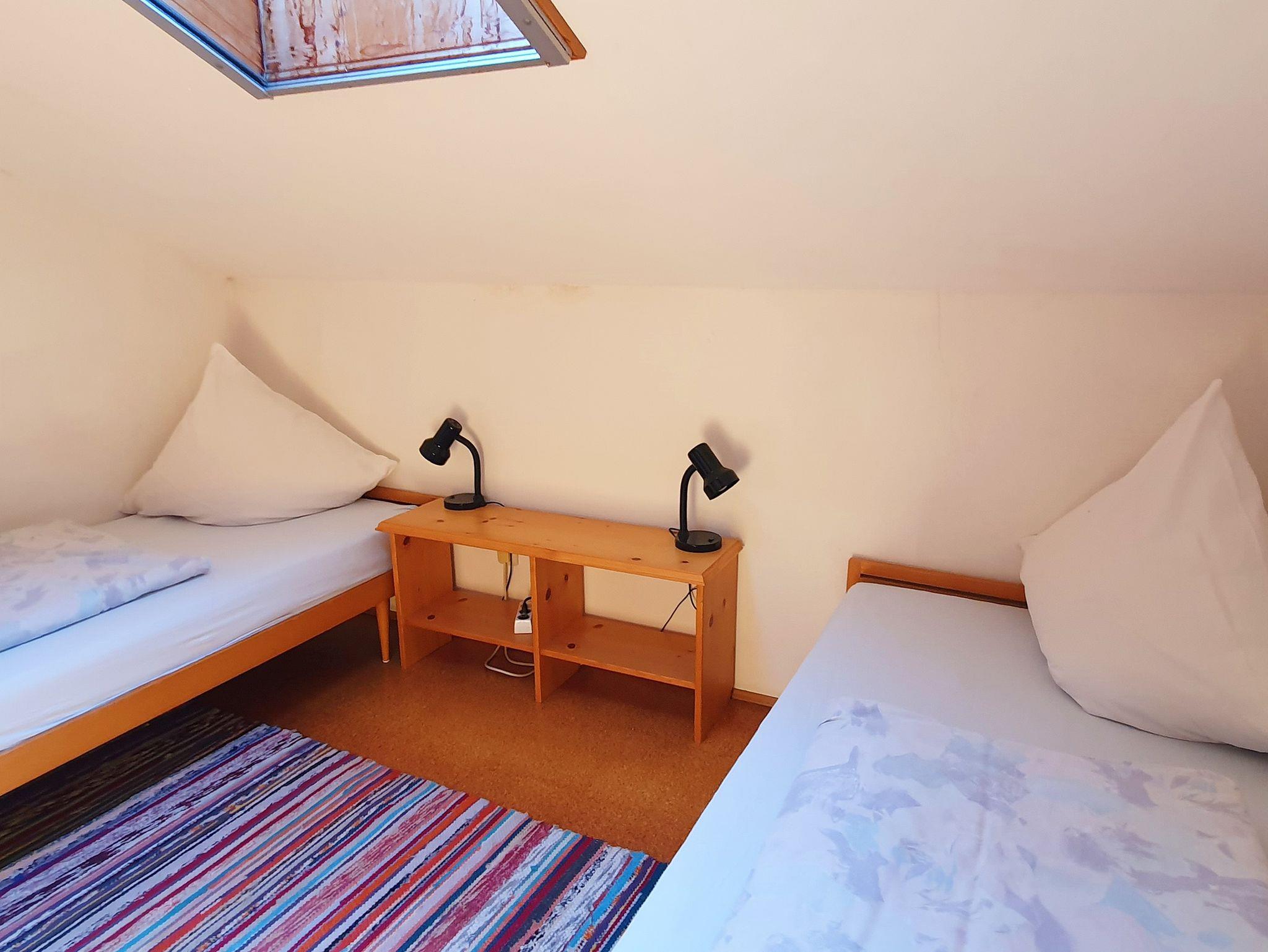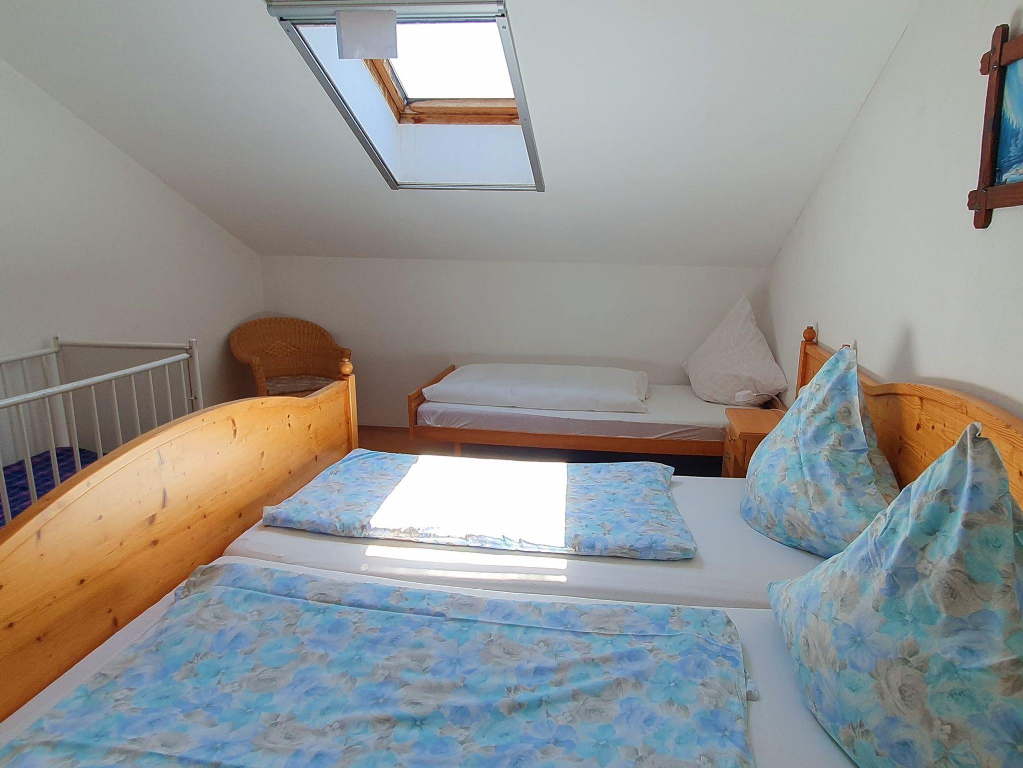 Große Ferienwohung im Dachgeschoß mit kleinem Westbalkon, Wohnküche mit Essecke und Sitzgruppe, Microwelle, Sat-TV, Telefon, 1 Schlafzimmer für 2 Personen und 1 Schlafzimmer für 3 Personen. Kinderbett und Hochstuhl vorhanden. Dusche/WC.