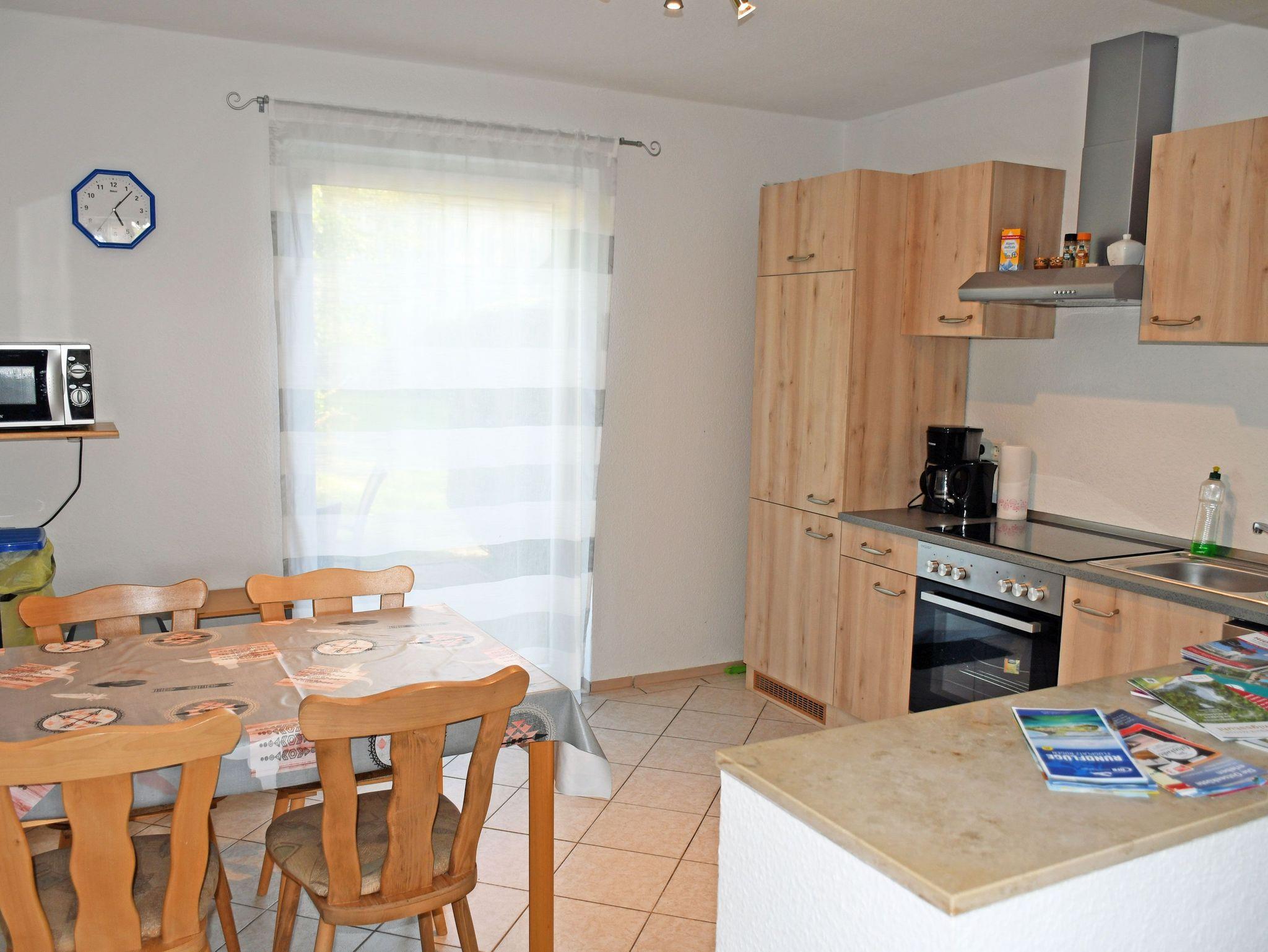 Der separate große Küchenbereich bietet einen Esstisch mit Stühlen und eine Küchenzeile. Diese ist mit einem Backofen, Herd mit Abzugshaube, Spülmaschine, Wasserkocher, Kaffeemaschine, Mikrowelle, Toaster, Wasserkocher und Kühlschrank komplett ausgestattet.