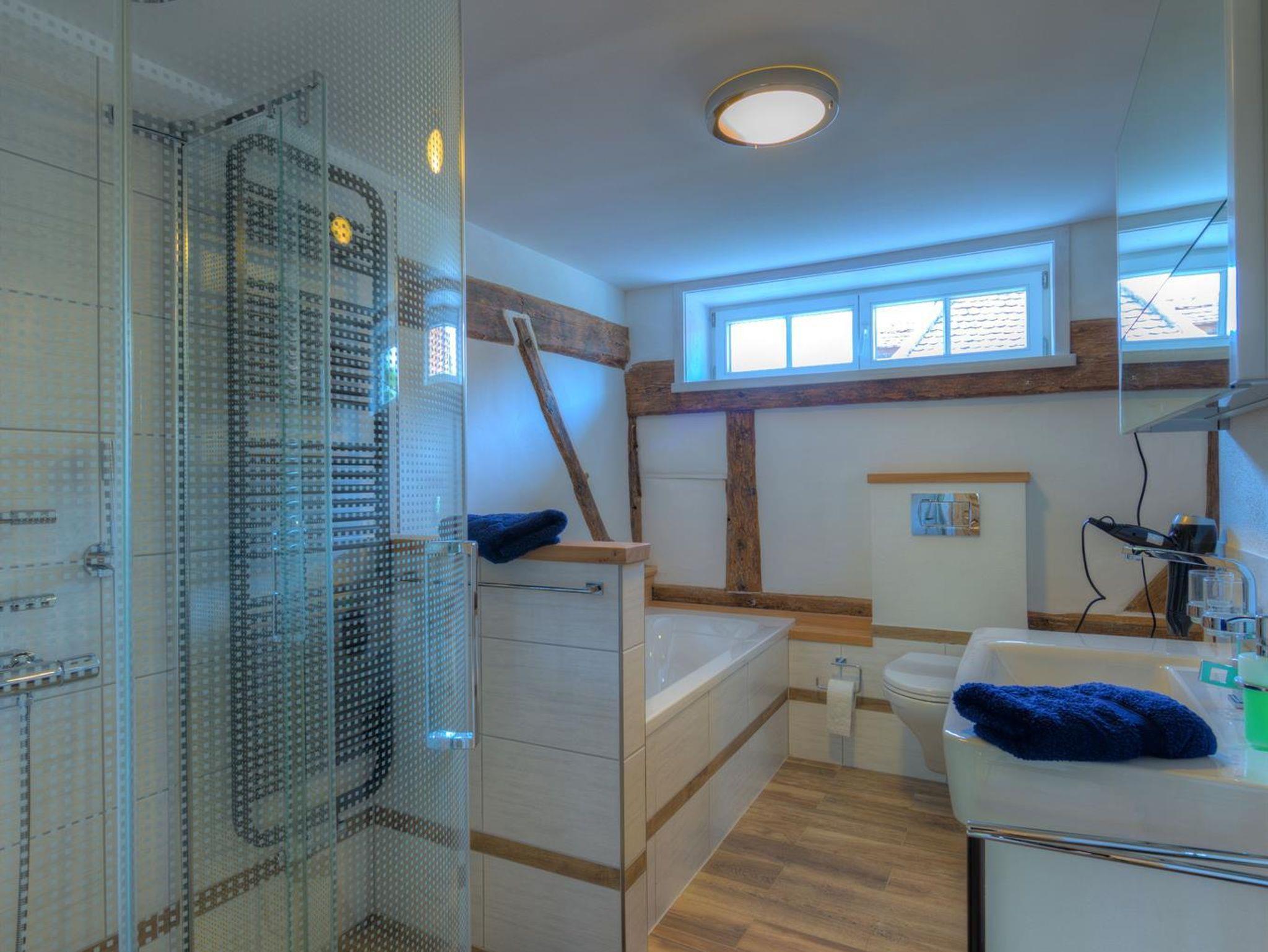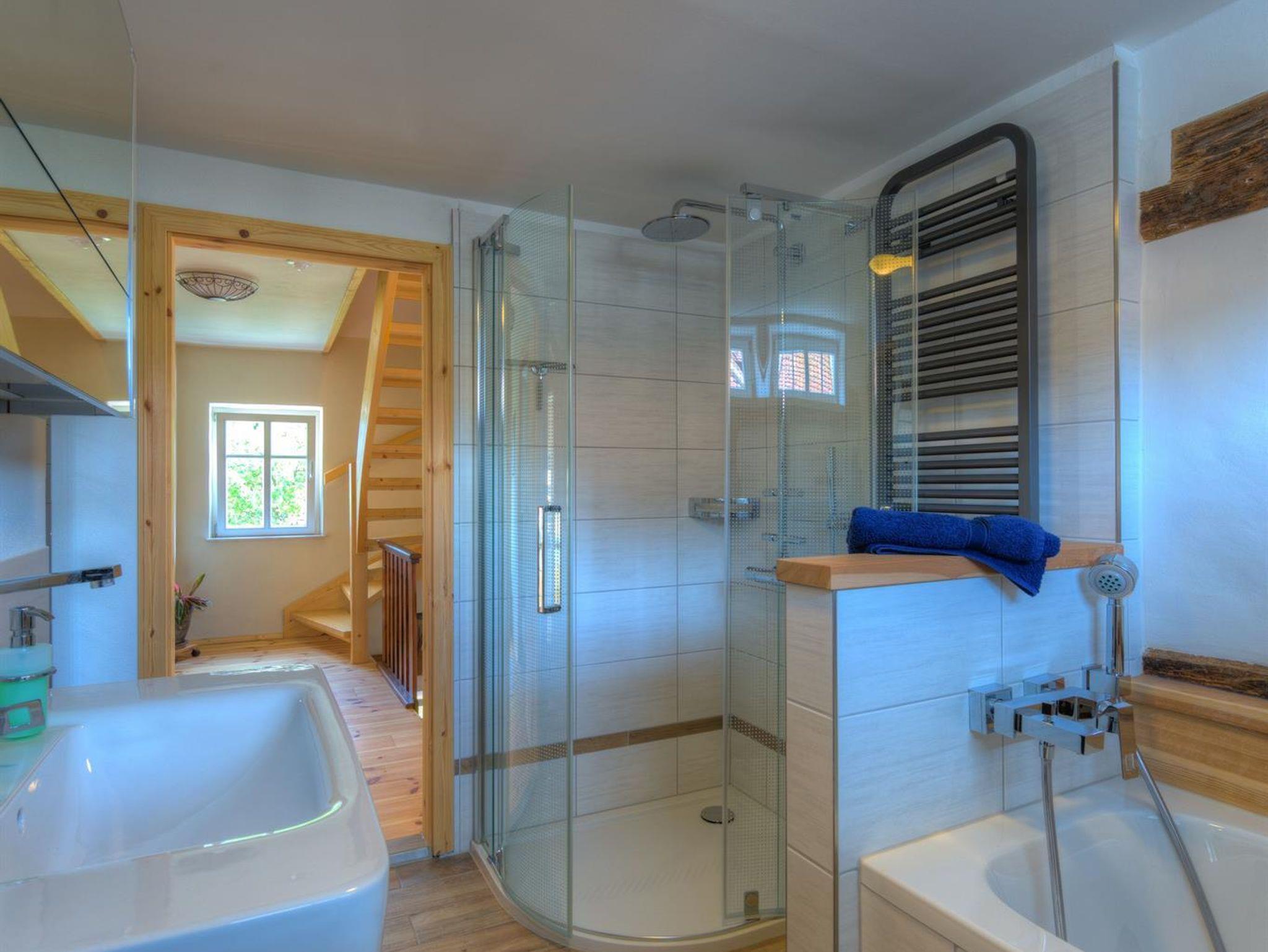 Das traditionelle Umgebindehaus beherbergt einen kleinen, separat abschließbaren Wohnbereich, bestehend aus einem Doppelzimmer mit Bad. Das Bad hat eine modernen Duschkabine mit Thermostatarmatur, WC und Waschplatz.