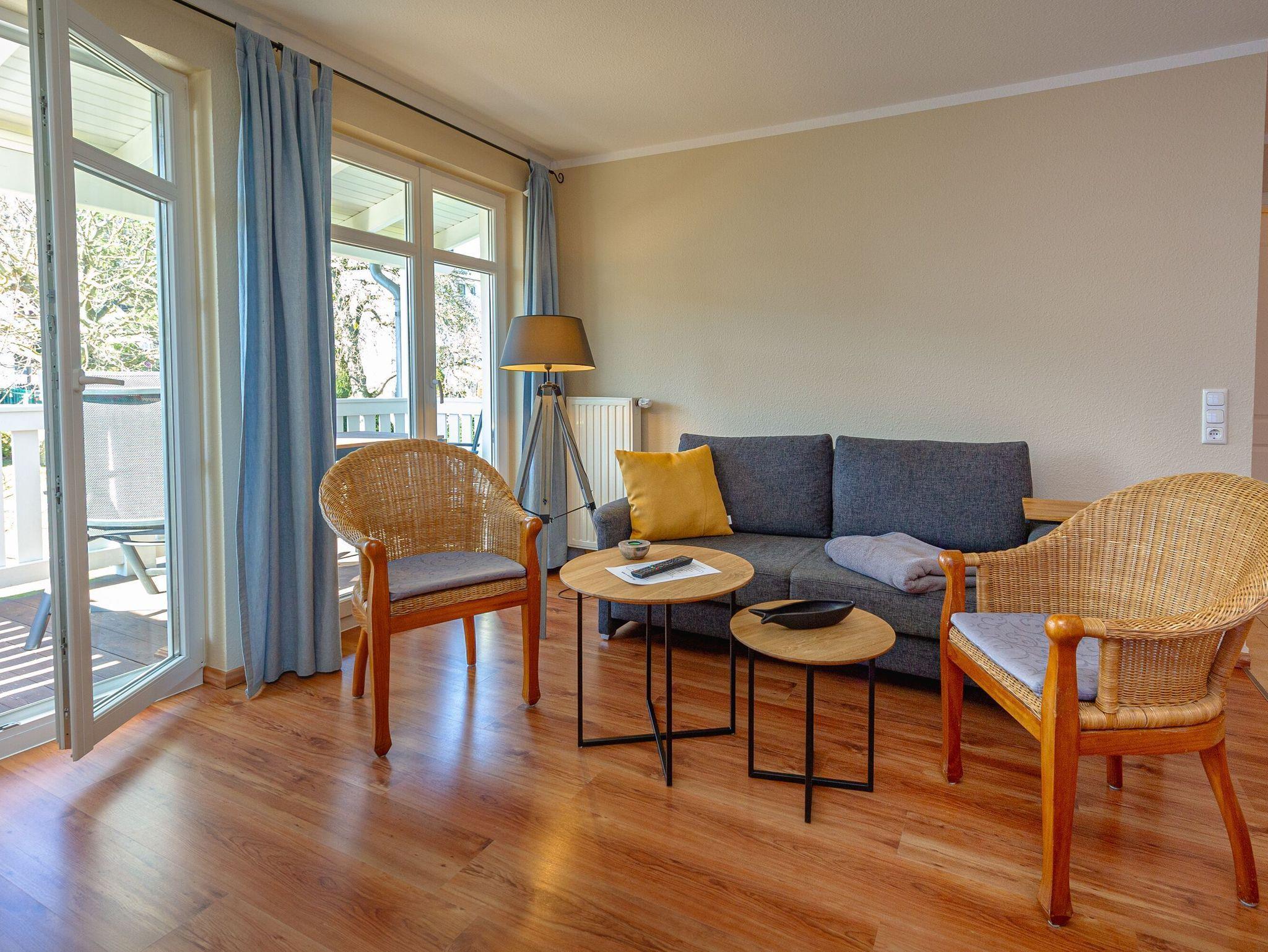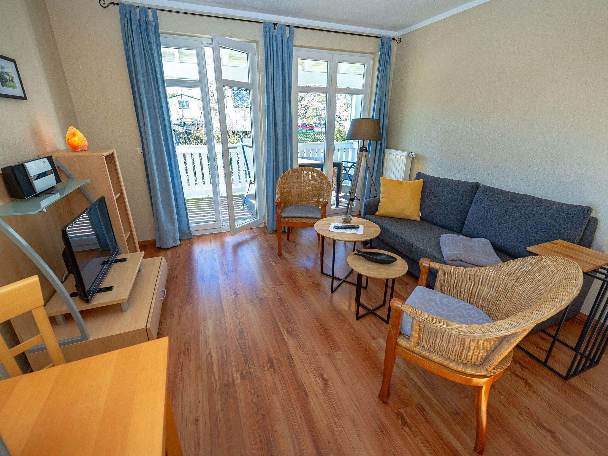 Der helle, freundliche Wohnraum ist mit einer bequemen Schlafcouch (Aufbettungsmöglichkeit für 2 Personen), zwei Sesseln, einem Flachbild-TV, einer Mini-Stereoanlage mit CD-Player und einem Esstisch eingerichtet. Die harmonisch im Wohnbereich integrierte Küchenzeile ist ausgestattet mit einem Kühlschrank mit Gefrierfach, einem 4-Platten-Cerankochfeld, einem Backofen, einer Geschirrspülmaschine, einer Mikrowelle, Wasserkocher, Kaffeemaschine, Toaster und diversem Kleininventar, das die Küchenausstattung komplettiert.