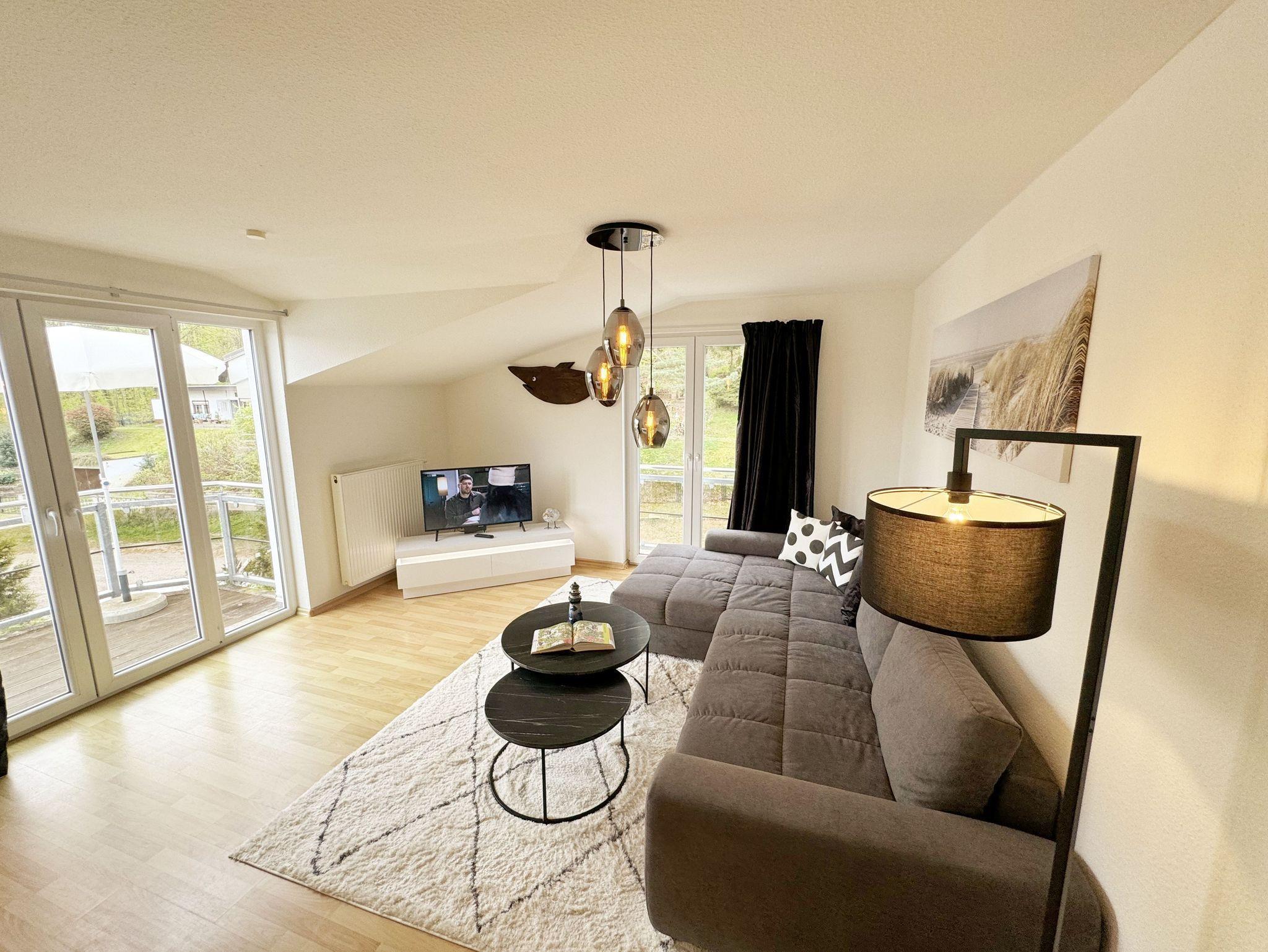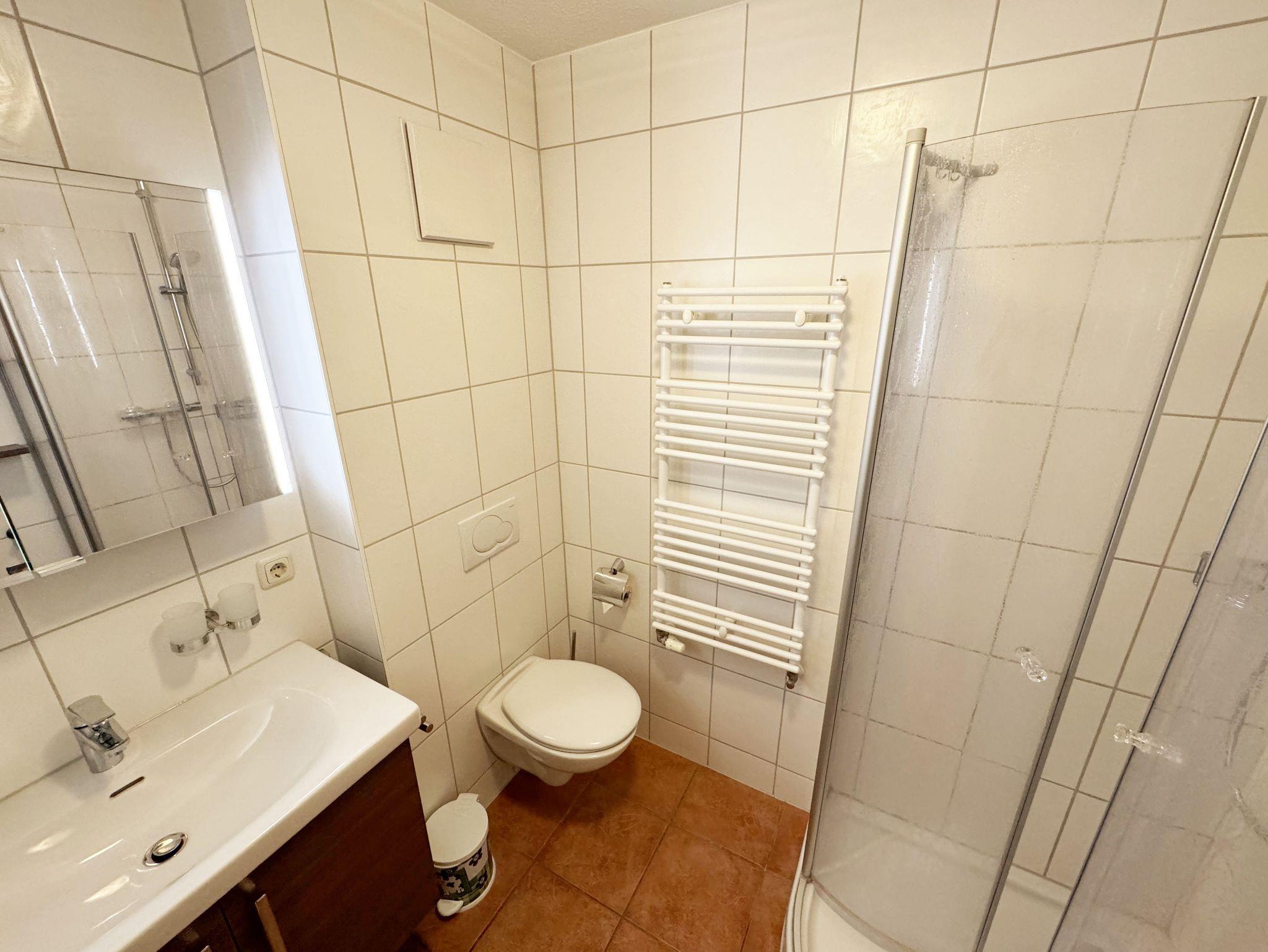 Die ruhig gelegene Nichtraucherwohnung befindet sich in der 1. Etage. Sie bietet Ihnen mit ca. 48 qm ausreichend Platz für 3 Erw. und 1 Kind bis 3 Jahre im Kinderreisebett. Der mit Laminat verlegte Wohnbereich ist durch seine bodentiefen Fenster sehr hell und verfügt über eine Couchecke (Aufbettung für 3. Person /1,30m x 1,90m) mit Couchtisch, einen Sessel, eine Anrichte sowie einen TV-Schrank mit Flachbildschirm. Von hier aus gelangen Sie auf den bestuhlten Balkon (Süd/Ost). Ein Internetanschluss (WLAN) ist für Sie vorhanden. Dieser ist inklusive! Das Doppelbett (1,60m x 2,00m) mit Nachttischkonsolen und ein großzügiger Kleiderschrank runden das Schlafzimmer ab. Auch von hier aus können Sie den Zugang auf den Balkon wählen. In der komplett eingerichteten Küchenzeile finden Sie ein Ceranfeld, einen Backofen auf Augenhöhe, Geschirrspüler, Kühlschrank, Kaffeemaschine, Wasserkocher, Toaster und diversen Küchenutensilien sowie einen Esstisch mit 3 Stühlen. Das geflieste Badezimmer weist eine Dusche, Waschtisch und ein WC vor. Ein Tiefgaragenstellplatz (Nr. 14, Einfahrtshöhe 2,00m) ist für Ihren Pkw reserviert. Die Erstausstattung eines Wäschepaketes (komplette Bettwäsche, 1 Duschhandtuch, 1 kleines Handtuch) können Sie bis 14 Tage vor Anreise gegen einen Aufpreis dazu buchen oder durch eigene ergänzen. Ab 2 gebuchten Paketen erhalten Sie einmalig 1 Geschirrhandtuch und 1 Duschvorleger hinzu.