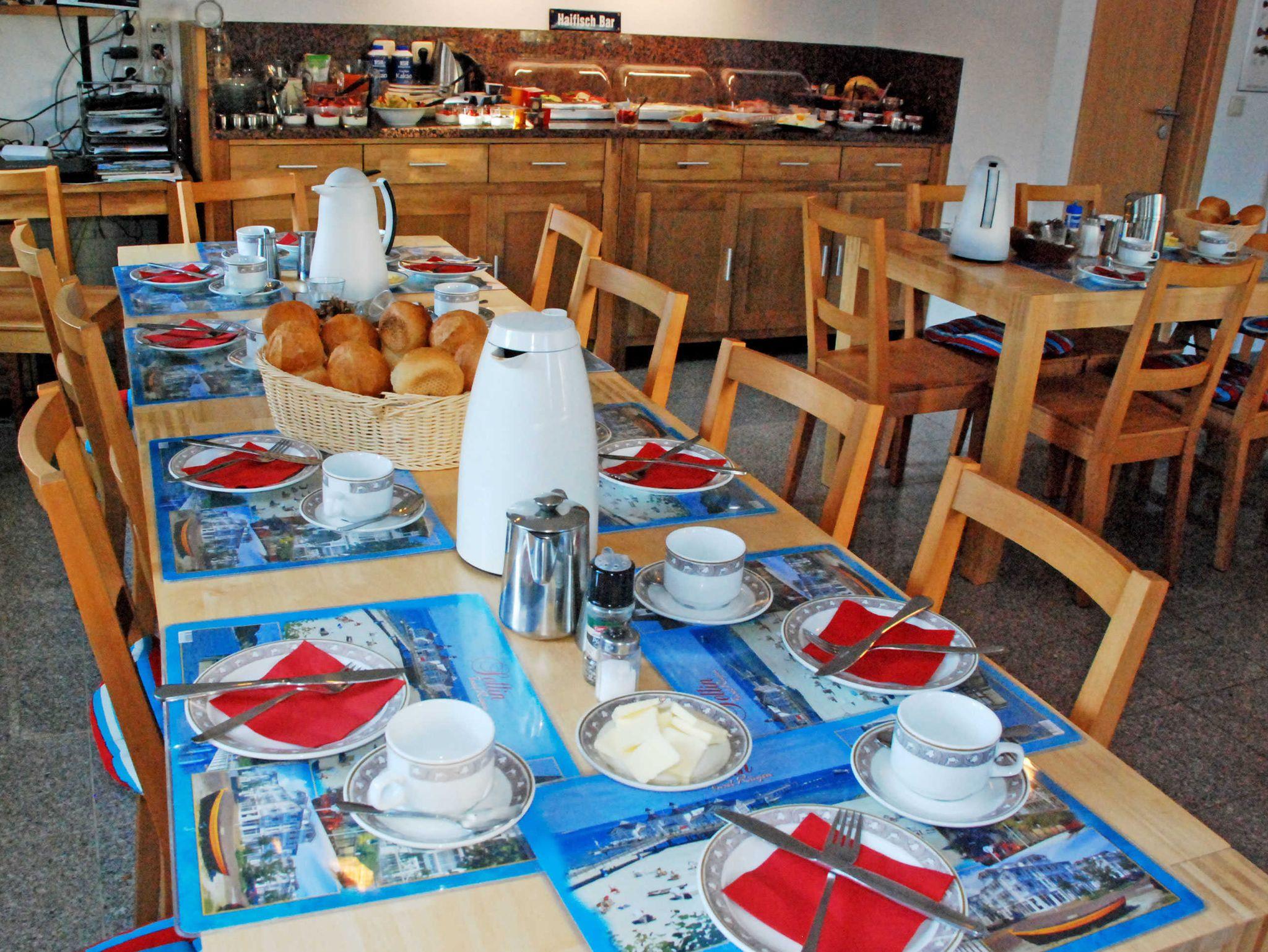 Bei Ihrer Anreise sind Ihre Betten selbstverständlich bereits mit Bettwäsche bezogen. Handtücher können gerne mit dazugebucht werden. Bis zur Bus-Haltestelle des öffentlichen Nahverkehrs sind es ca. 500 Meter. Gerne können Sie auch die beliebte Selliner Bäderbahn nutzen, die Sie zu Ihrem gewünschten Strand kostenlos transportiert. Der Frühstücksraum bietet Platz für ca. 24 Personen und kann gerne auch für Feierlichkeiten (Familienfeiern, Geburtstage, Hochzeiten, Seminare usw.) genutzt werden.