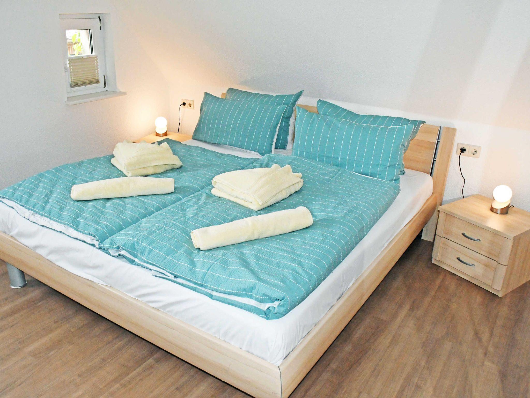 Im Schlafzimmer befinden sich ein bequemes Doppelbett mit Nachttischen und Leselampen sowie ein Kleiderschrank. Auf Wunsch kann hier ein Kinderreisebett und ein Hochstuhl bereit gestellt werden.