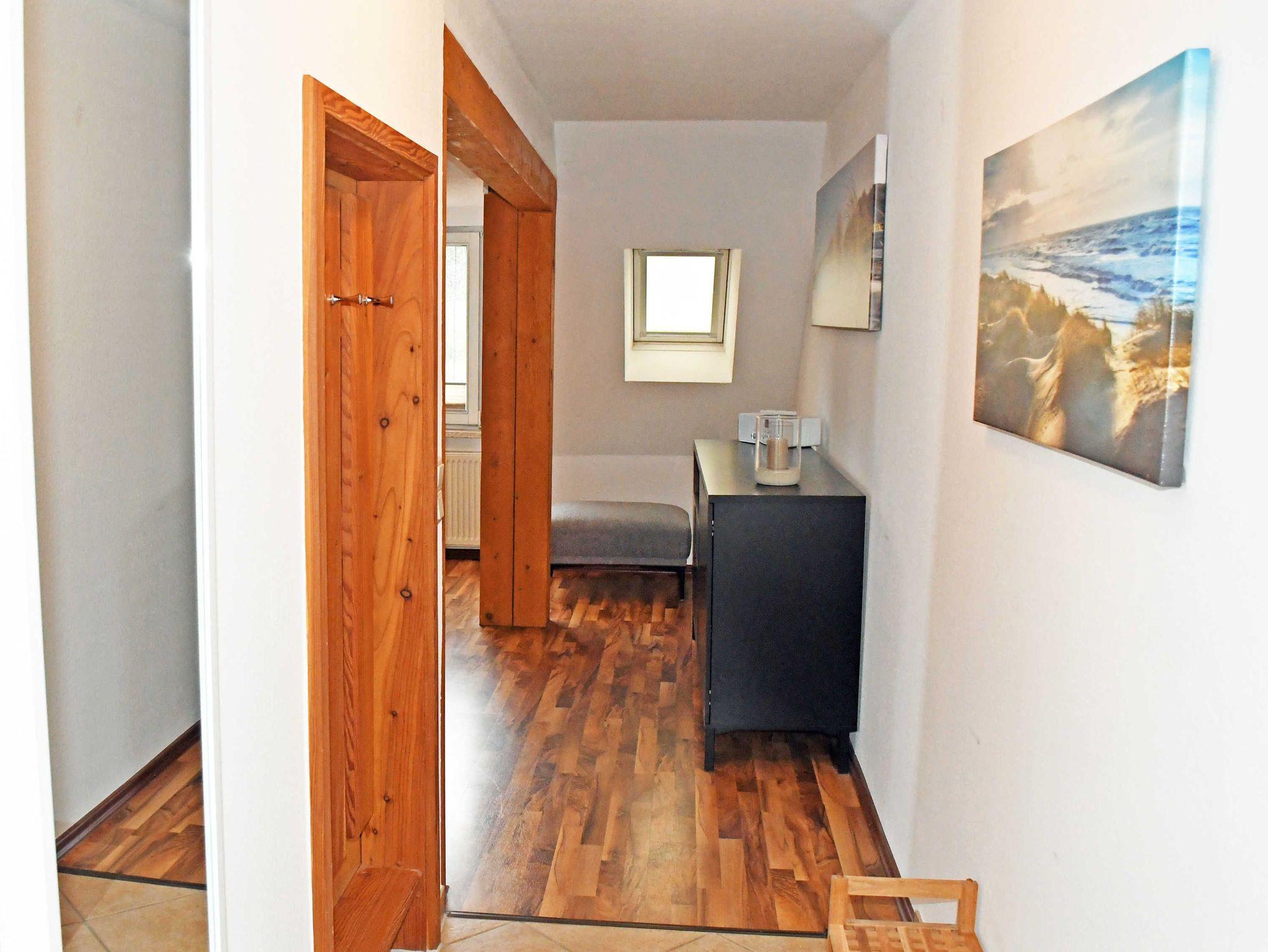 Über einen Flur kommen Sie in den Wohnraum. Hier stehen eine Couch, ein Tisch mit Sesseln und ein modernes Flachbild-TV-Gerät. Die Küchenzeile im Wohnbereich, ist mit Elektroherd mit Ceranfeld, Backofen, Kühlschrank mit Gefrierfach, Kaffeemaschine, Wasserkocher, Toaster komplett ausgestattet. Hier steht auch ein Esstisch mit Stühlen.