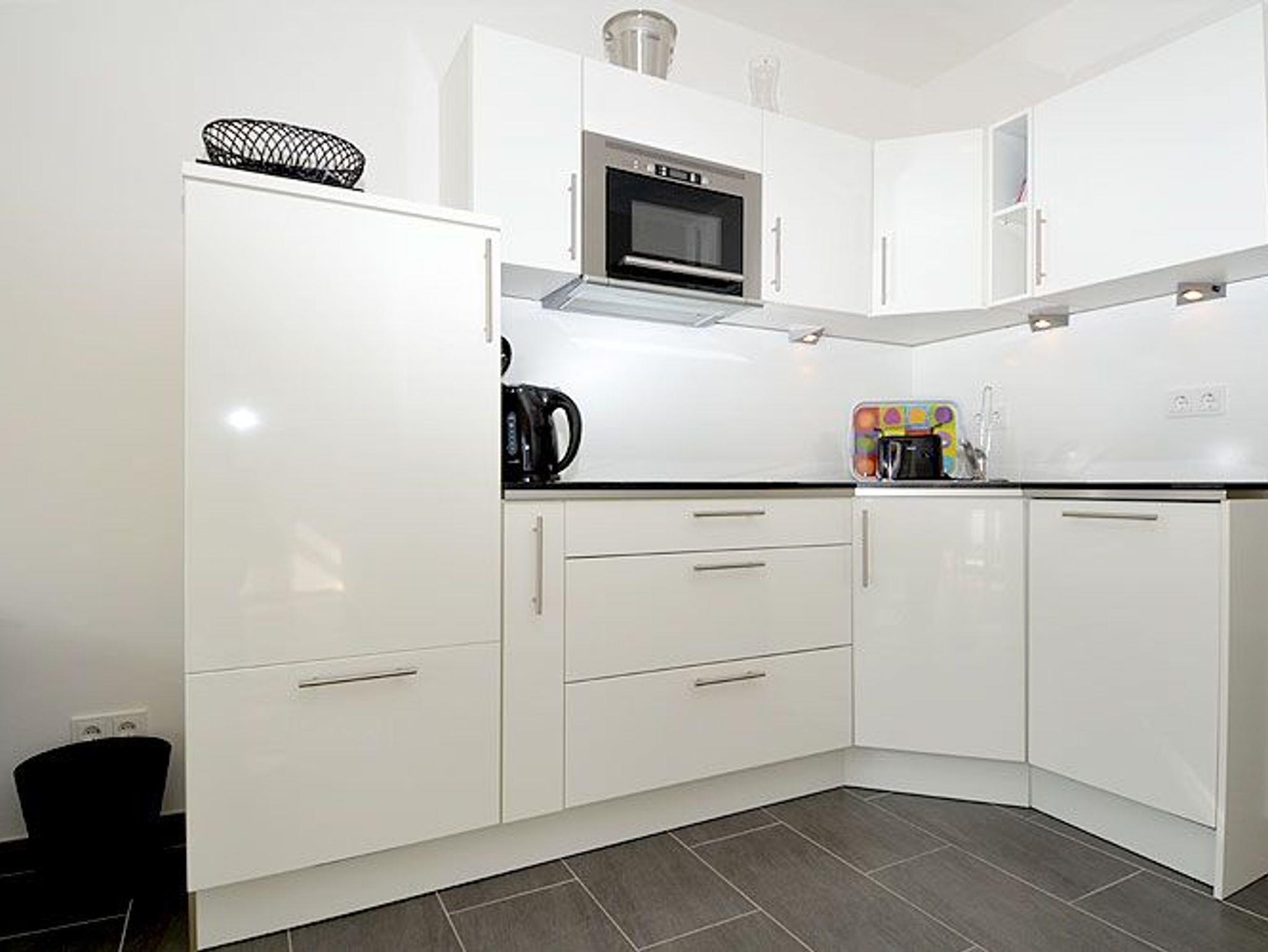 Das Wohnzimmer ist mit einem hochwertigen Ledersofa, Sitzgelegenheiten, Flachbildschirm-TV mit TV/Radio-Kabelanschluss, einem Bose Wave-Musiksystem mit Radio/CD Player, kostenfreiem W-LAN und einem Esstisch für 4 Personen ausgestattet. Die integrierte Küche mit alt-weiß-glänzenden Fronten und schwarzer Granitarbeitsplatte verfügt über 4-Zonen-Glas-Kochfeld, Mikrowelle mit Grillfunktion, Kühlschrank mit Gefrierfach, Geschirrspüler, Toaster und weitere Utensilien, so dass keine Wünsche offen bleiben.