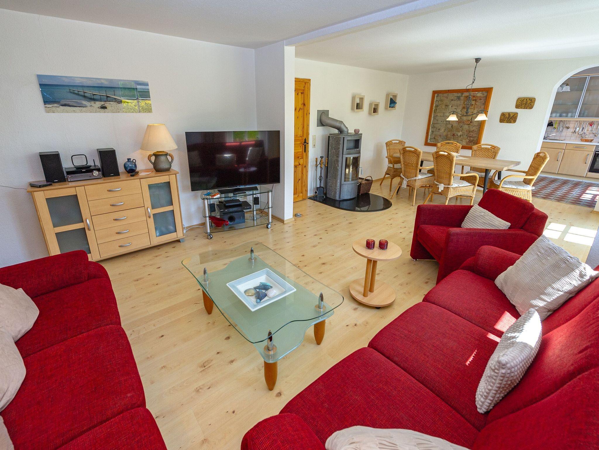 Das weiträumige, zur Küche hin offen gehaltene Wohnzimmer verfügt über eine Essecke mit einem großen Esstisch, eine großzügige Sitzlandschaft mit zwei großen Couchen und einem bequemen Sessel mit Fußhocker. Ein Flachbild-TV, ein DVD-Player und eine kleine Stereonlage mit CD-Player sorgen für Unterhaltung. Kostenfreies W-LAN steht Ihnen natürlich ebenfalls zur Verfügung. Ein schöner Kaminofen verspricht gemütliche Stunden vor dem knisternden Feuer.