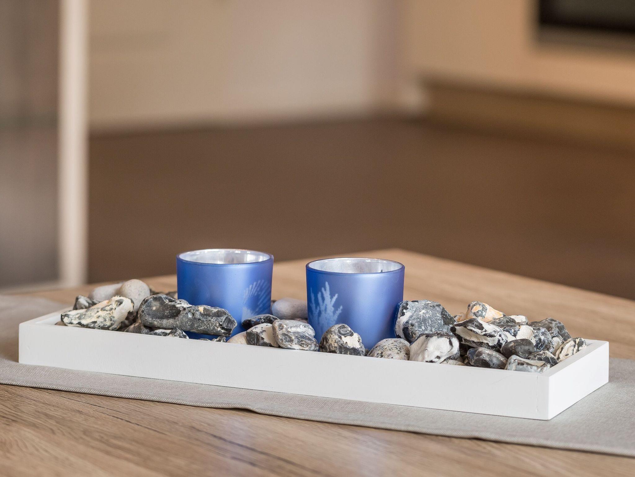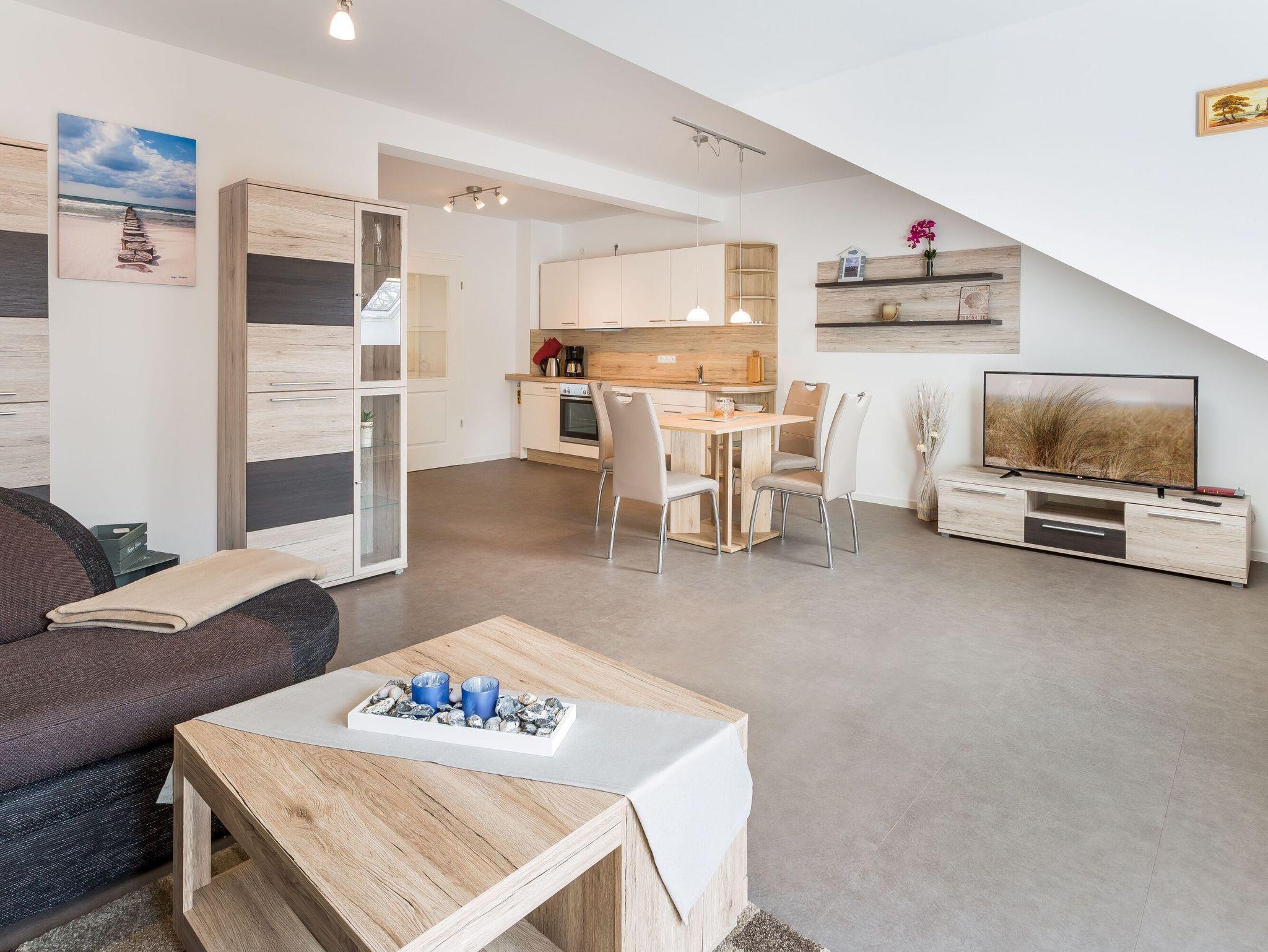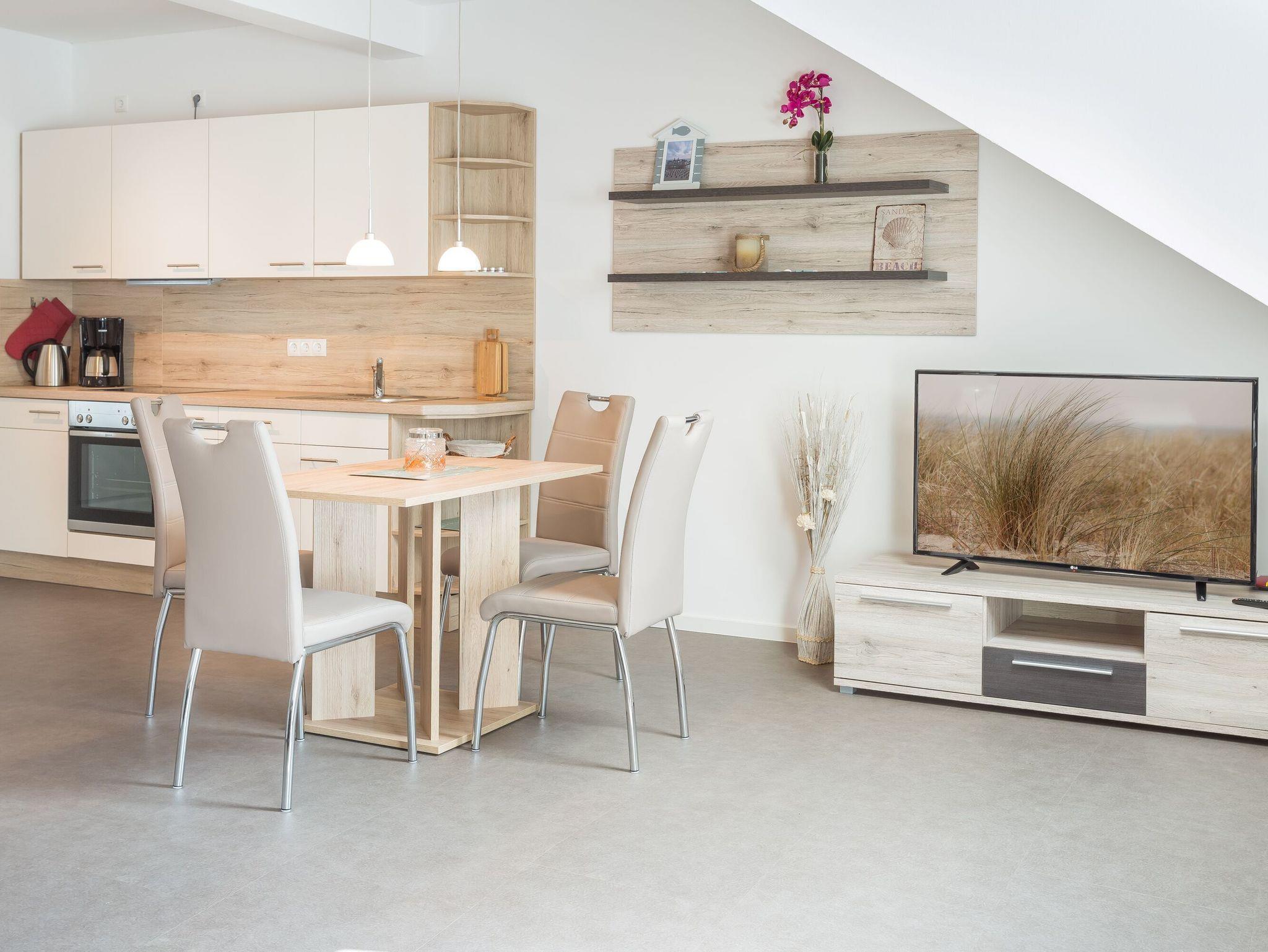 Betreten Sie den offenen, hellen Flurbereich und lassen Sie sich von der maritimen Heimatatmosphäre mitreißen. Der Wohnbereich lädt mit Hilfe der modernen, aber dennoch gemütlichen Couchgarnitur zum Verweilen ein. Hier ist auch eine Aufbettung für zwei weitere Personen möglich. Ein komfortabler Essbereich und ein Flachbild-TV runden das Gesamtbild gekonnt ab. Ein kostenfreier WLAN-Zugang steht für Sie bereit.