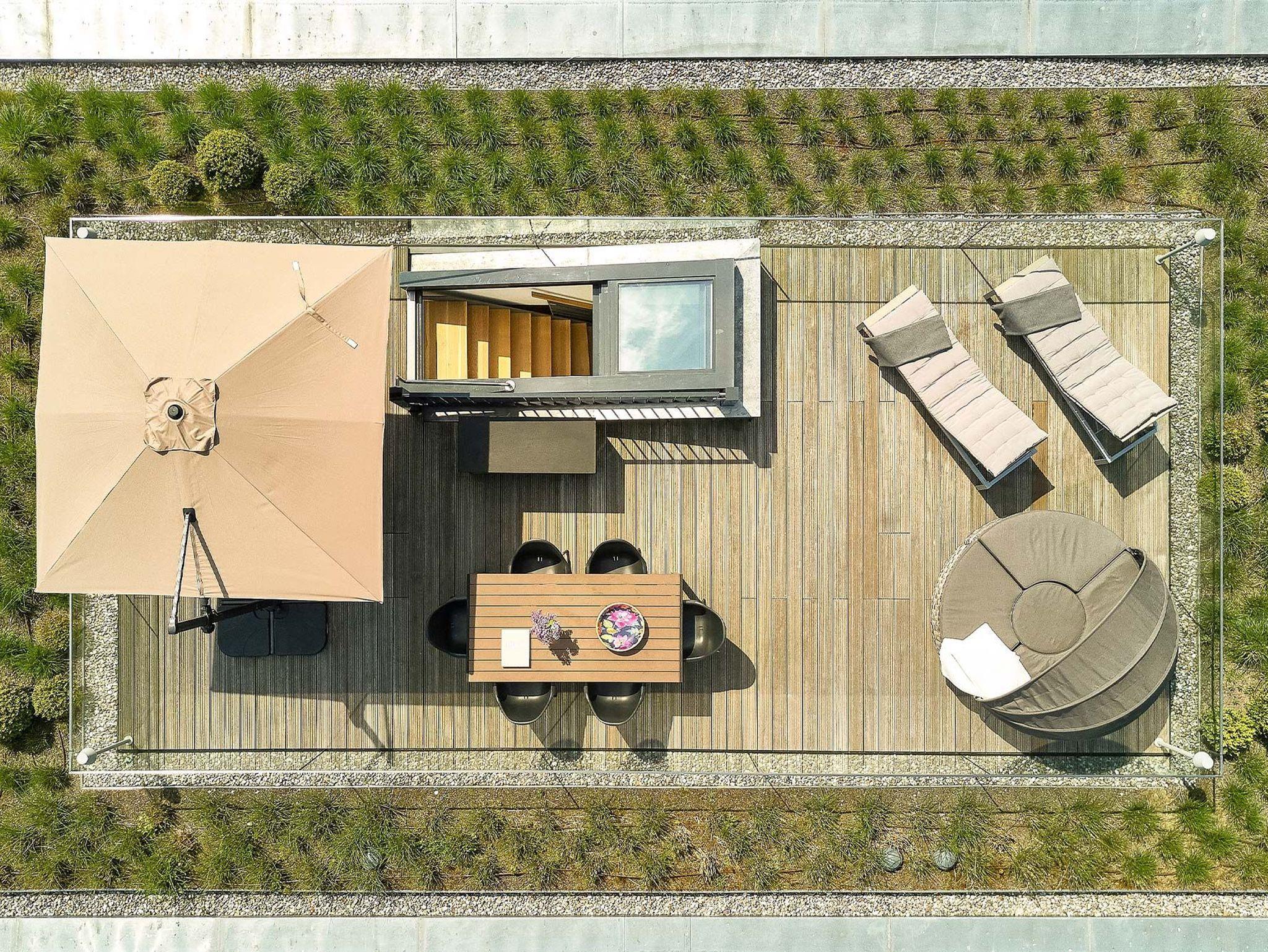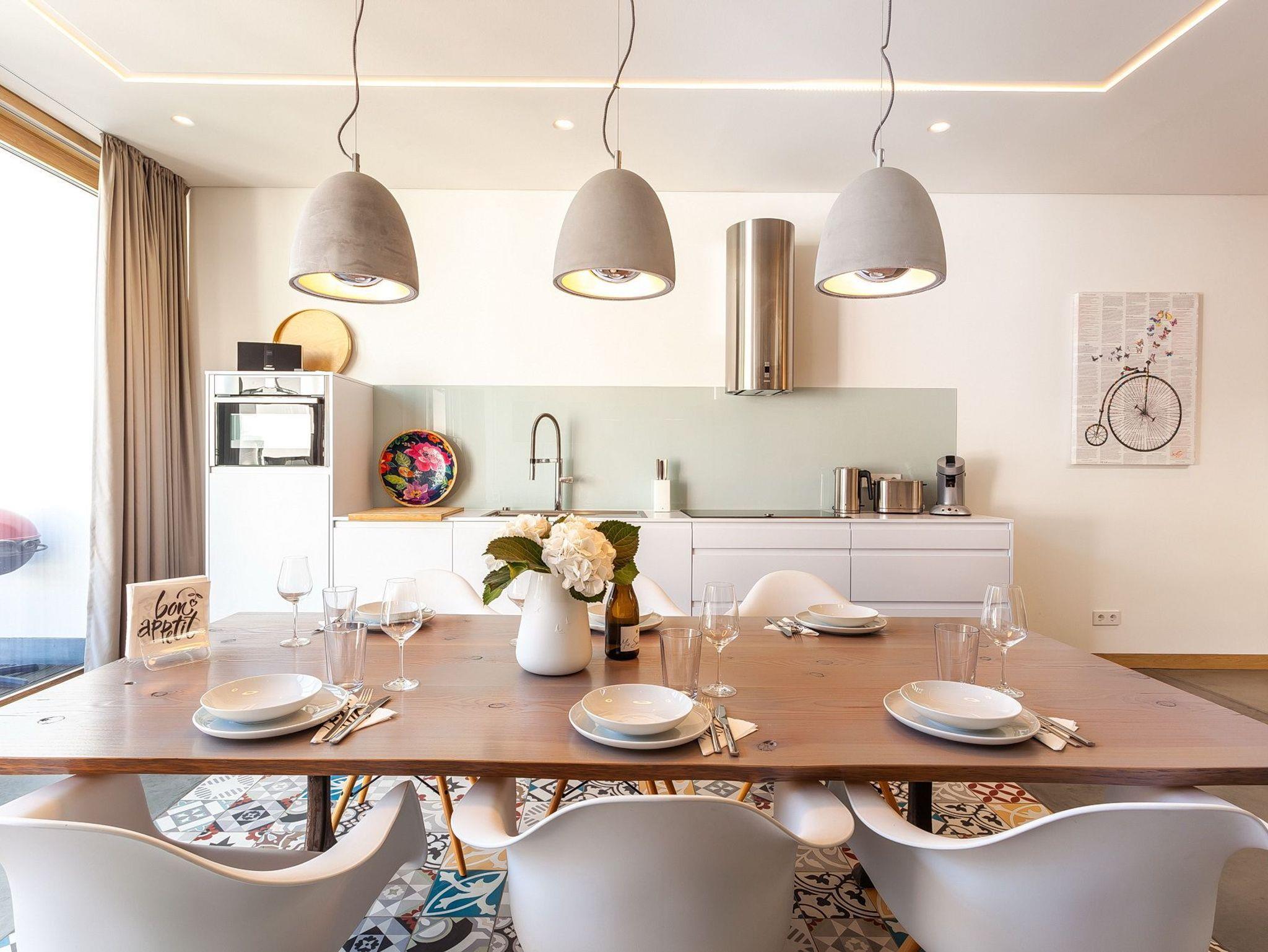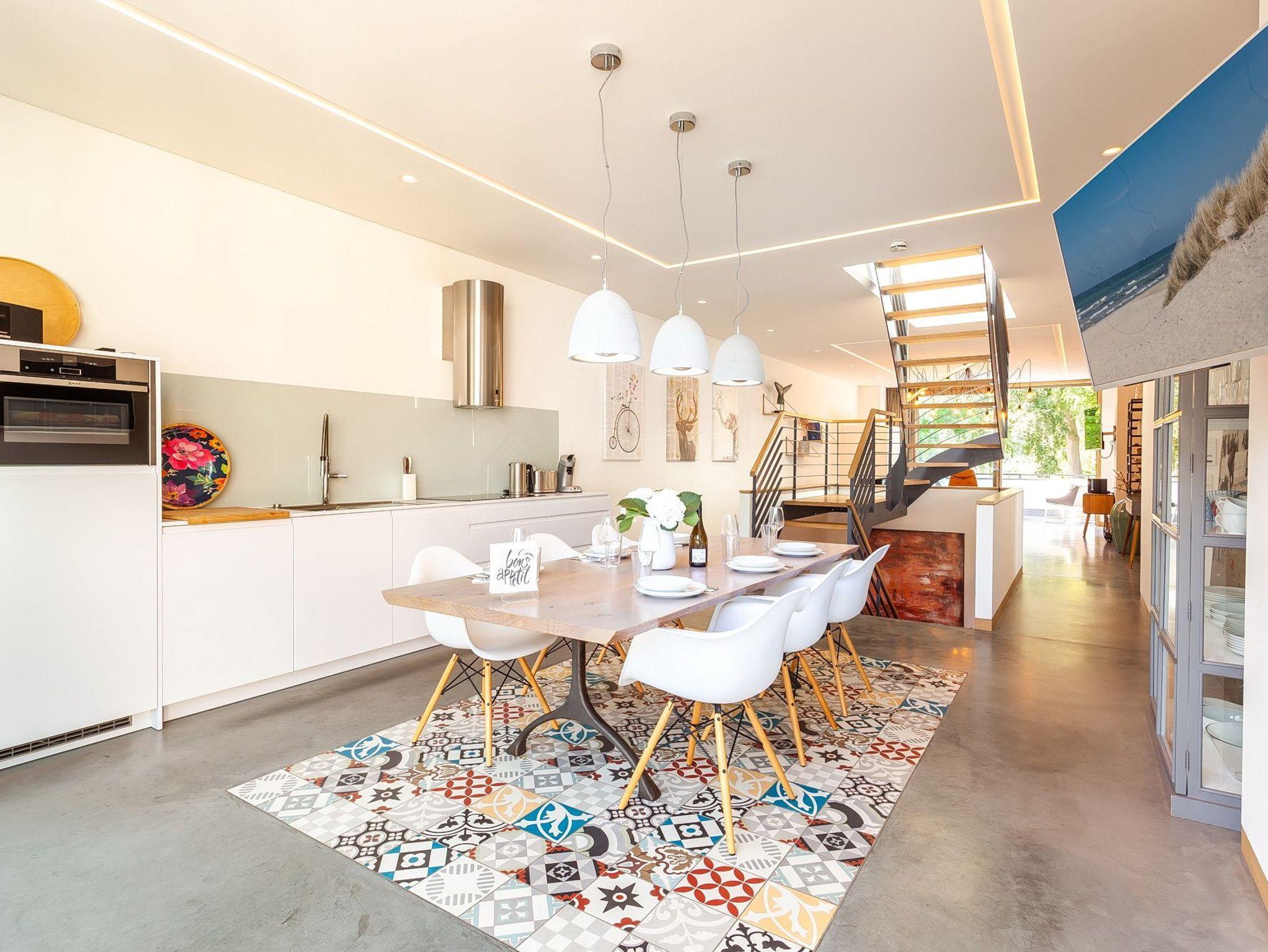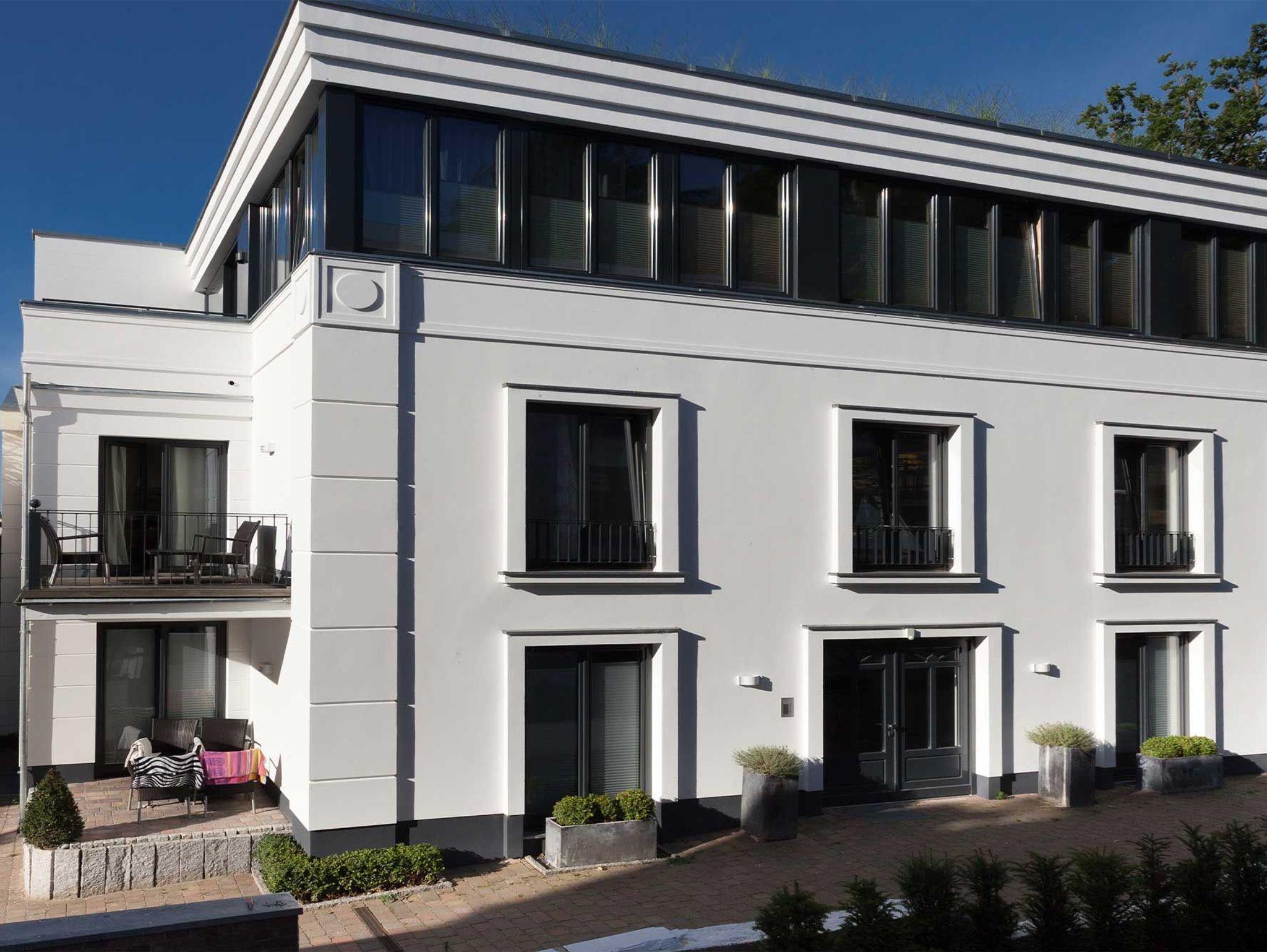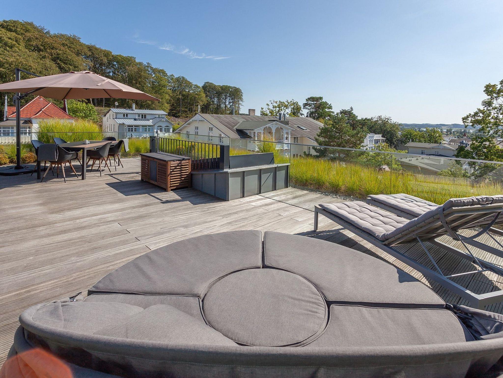 Das Penthouse unter dem Dach der Villa Baltic im Ostseebad Sellin bietet Ihnen und Ihrer Familie auf 150 Quadratmetern Wohnfläche und drei Etagen ein Urlaubsambiente der Extraklasse. Schon auf den ersten Blick begeistern die hochwertigen, perfekt aufeinander abgestimmten Möbel und das überaus harmonische Farbkonzept. Bodentiefe Fenster unterstreichen den von gebeizter Eiche, edlem Glas und poliertem Beton geprägten Loft-Charakter Ihres Urlaubsdomizils. Eine Treppe führt hinauf und man kann es kaum erwarten, in einem der bequemen Lounge-Sessel auf der stolzen 60 Quadratmeter großen und von Dünengras gesäumten Dachterrasse Platz zu nehmen, um die Sonne und den weiten Ausblick über Sellin und den Selliner See bis zu den sanften Hügeln des Umlandes zu genießen. Ja, so lässt es sich leben! Und bis zum Hauptstrand mit der berühmten Seebrücke sind es über die Wilhelmstraße nur rund 150 Meter Fußweg - besser geht es kaum.