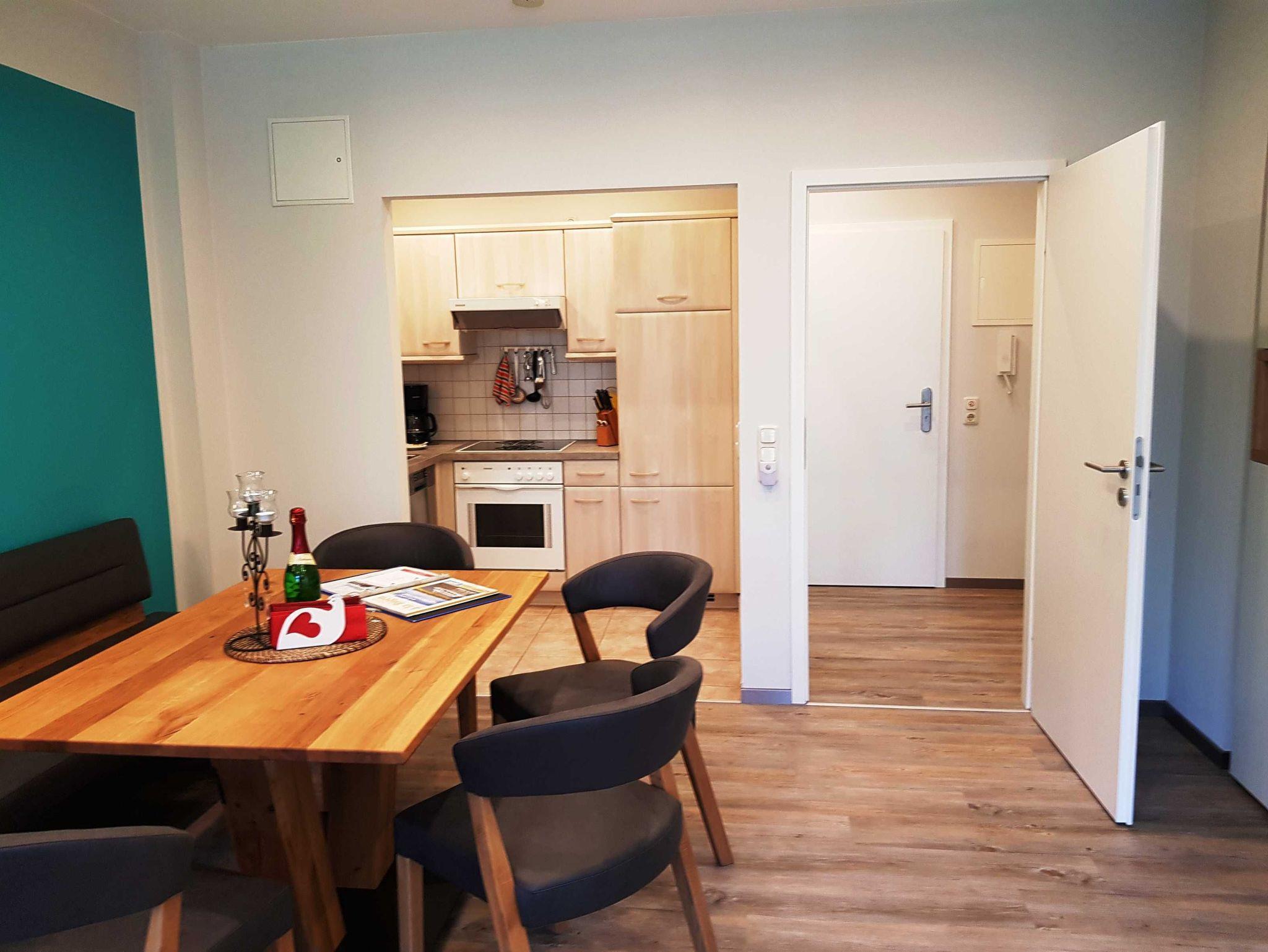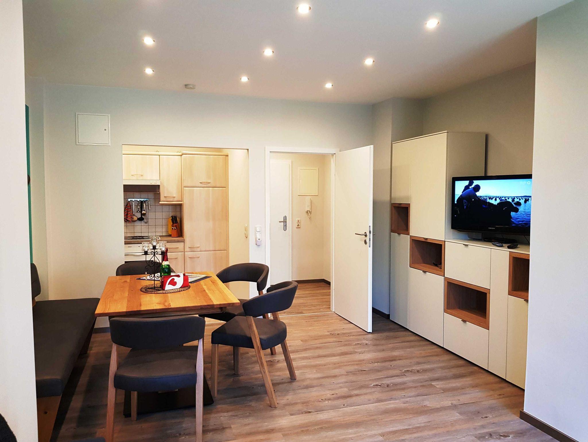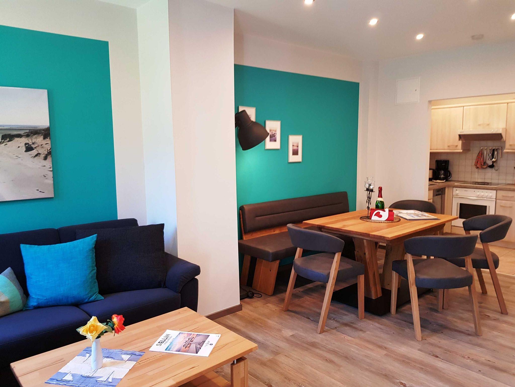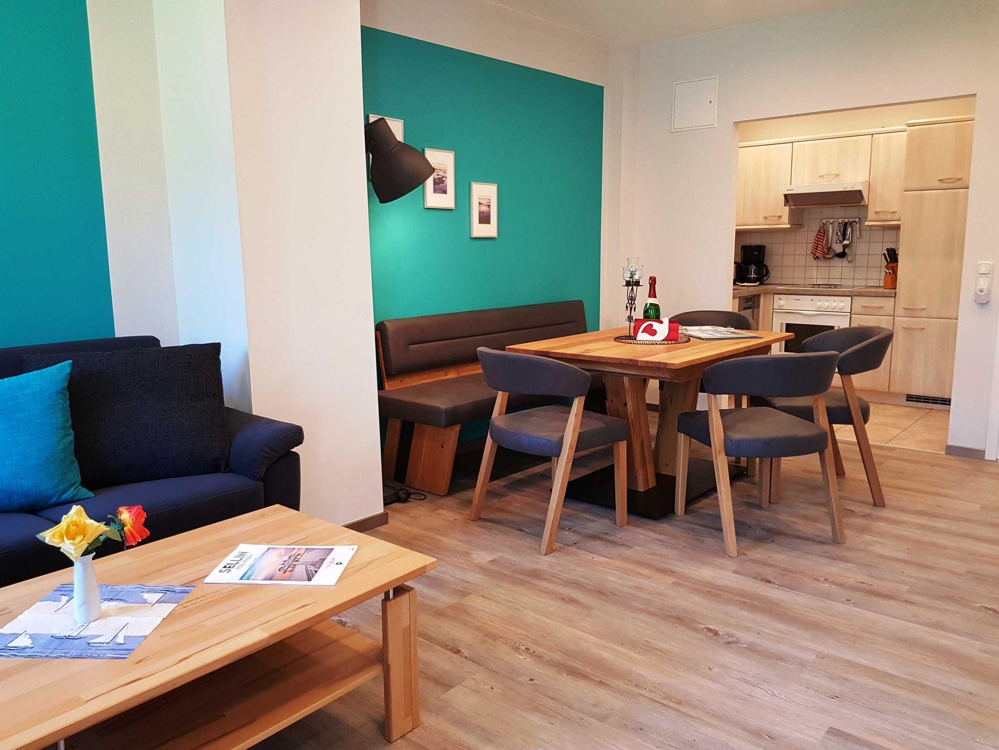 Wohnung mit 2 Schlafzimmern und 2 Boxspringbetten. Großes Wohnzimmer mit Esstisch für 6 Personen.
