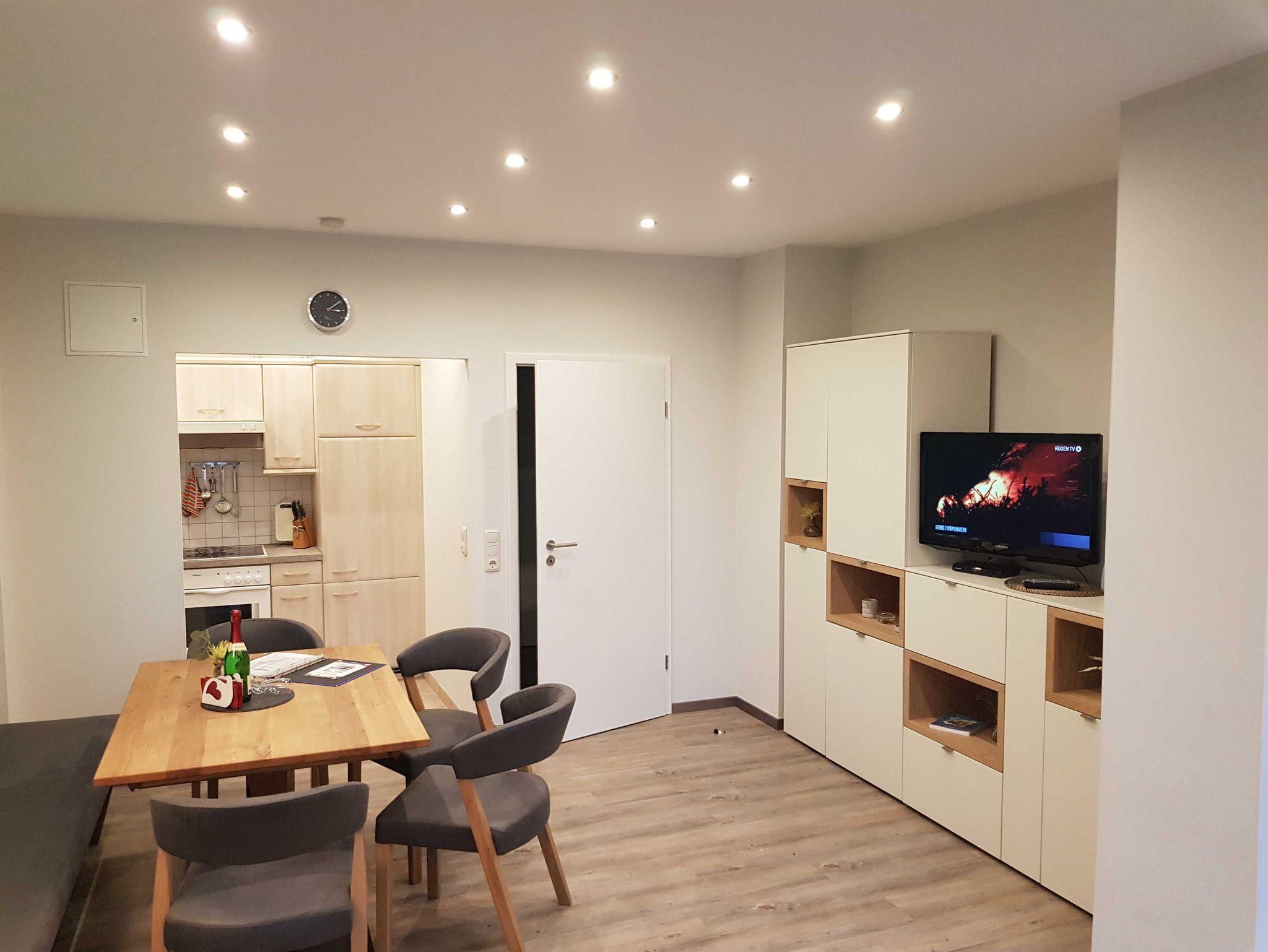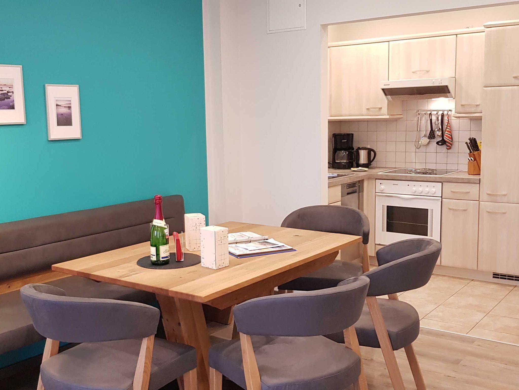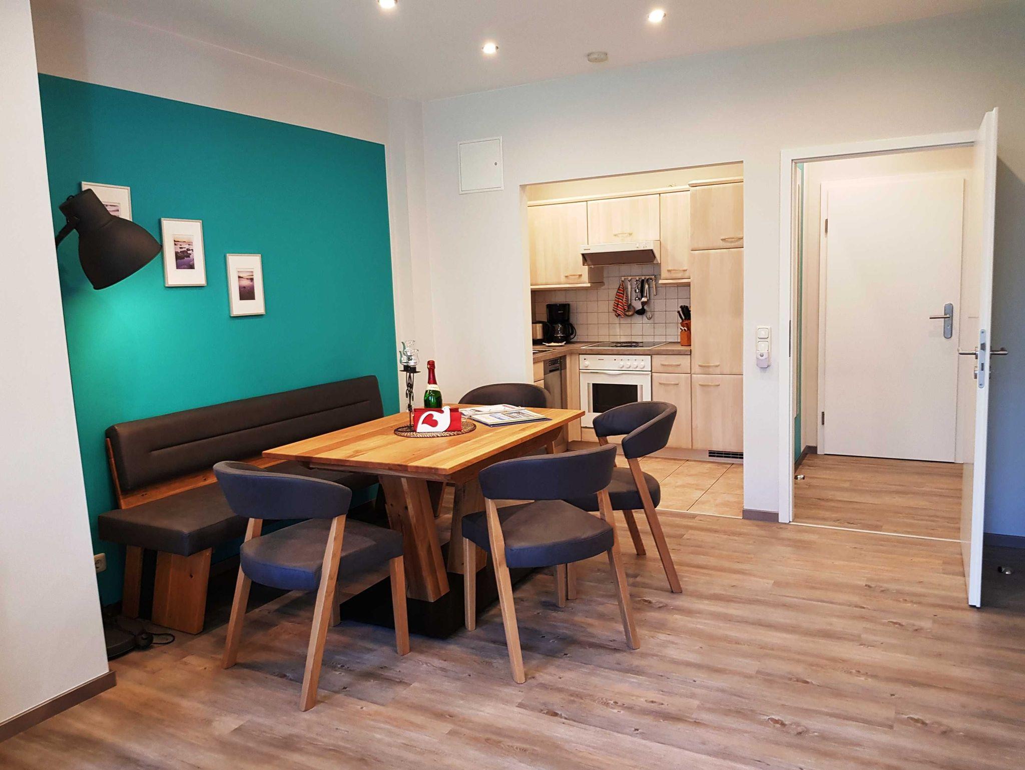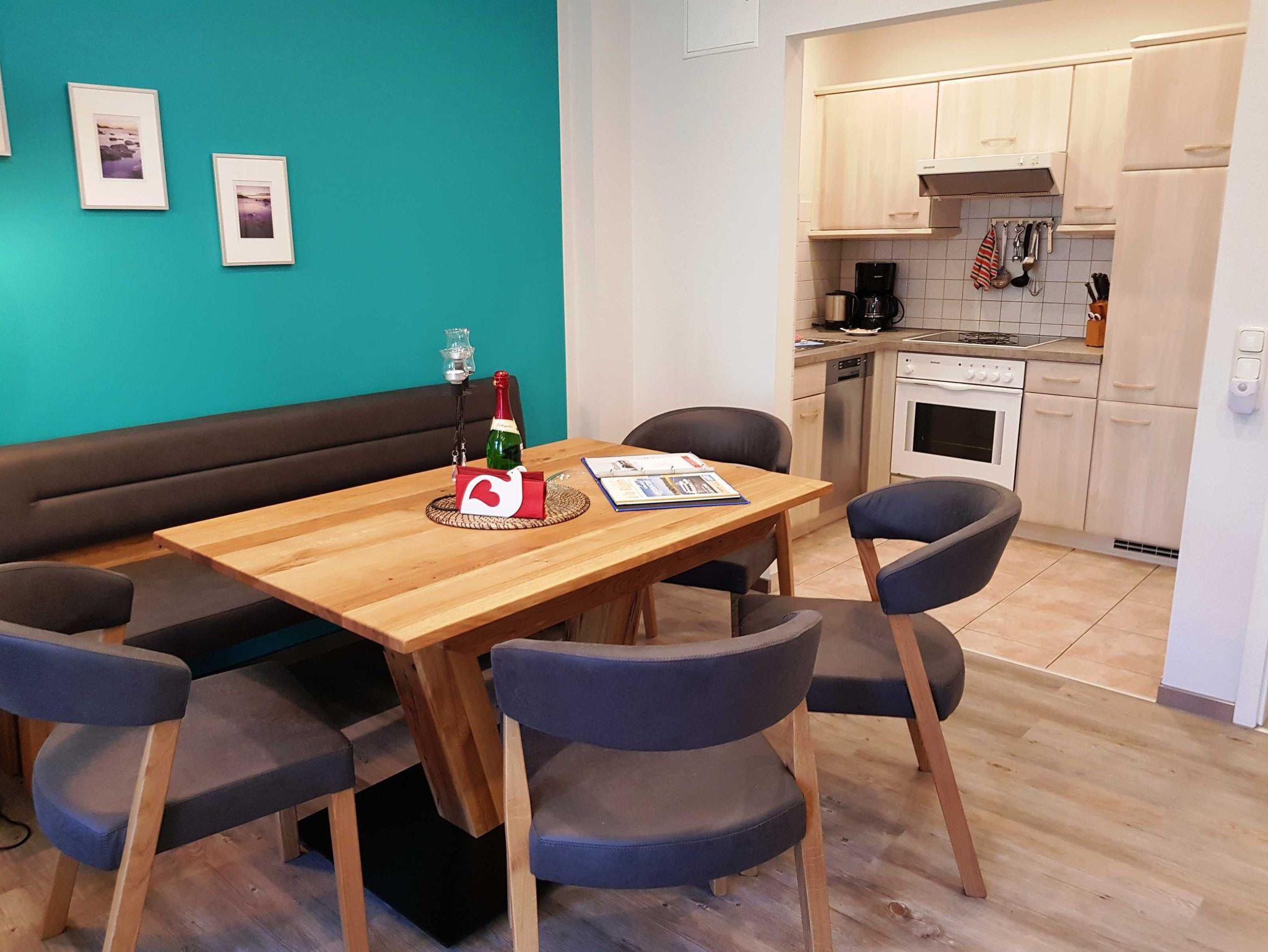 Wohnung mit 2 Schlafzimmern und 2 Boxspringbetten. Großes Wohnzimmer mit Esstisch für 6 Personen.