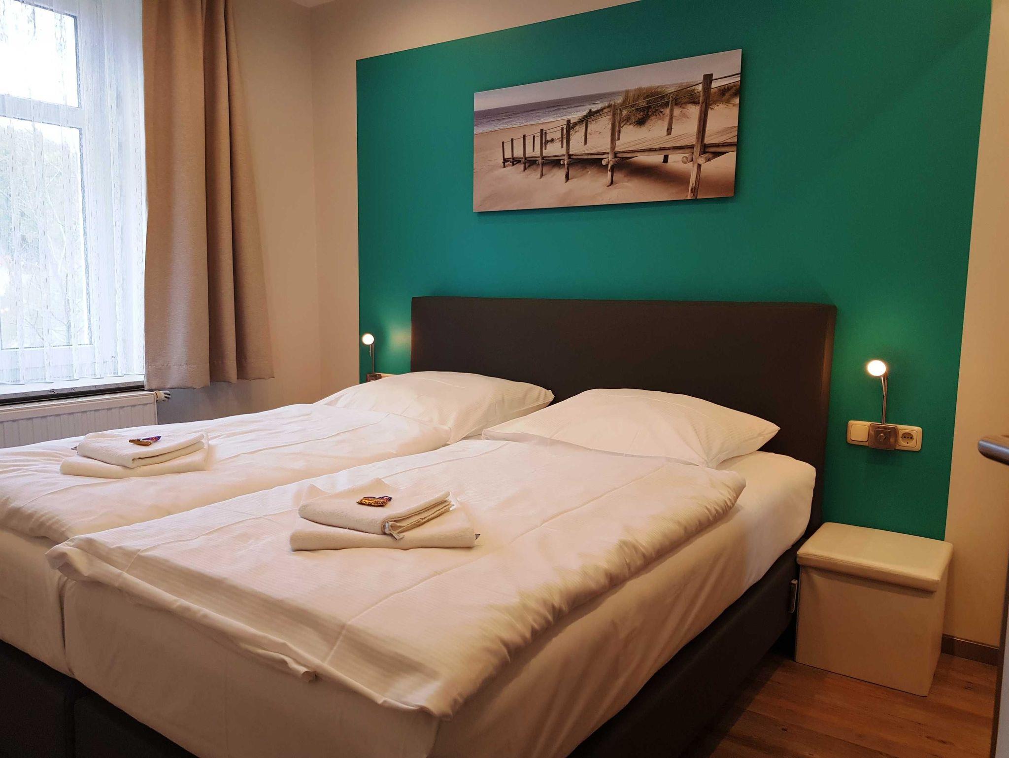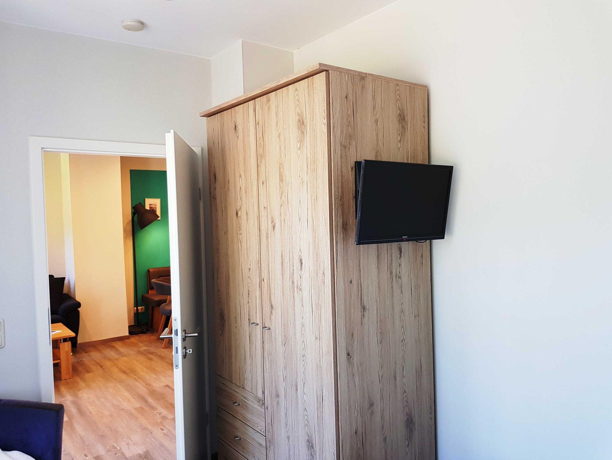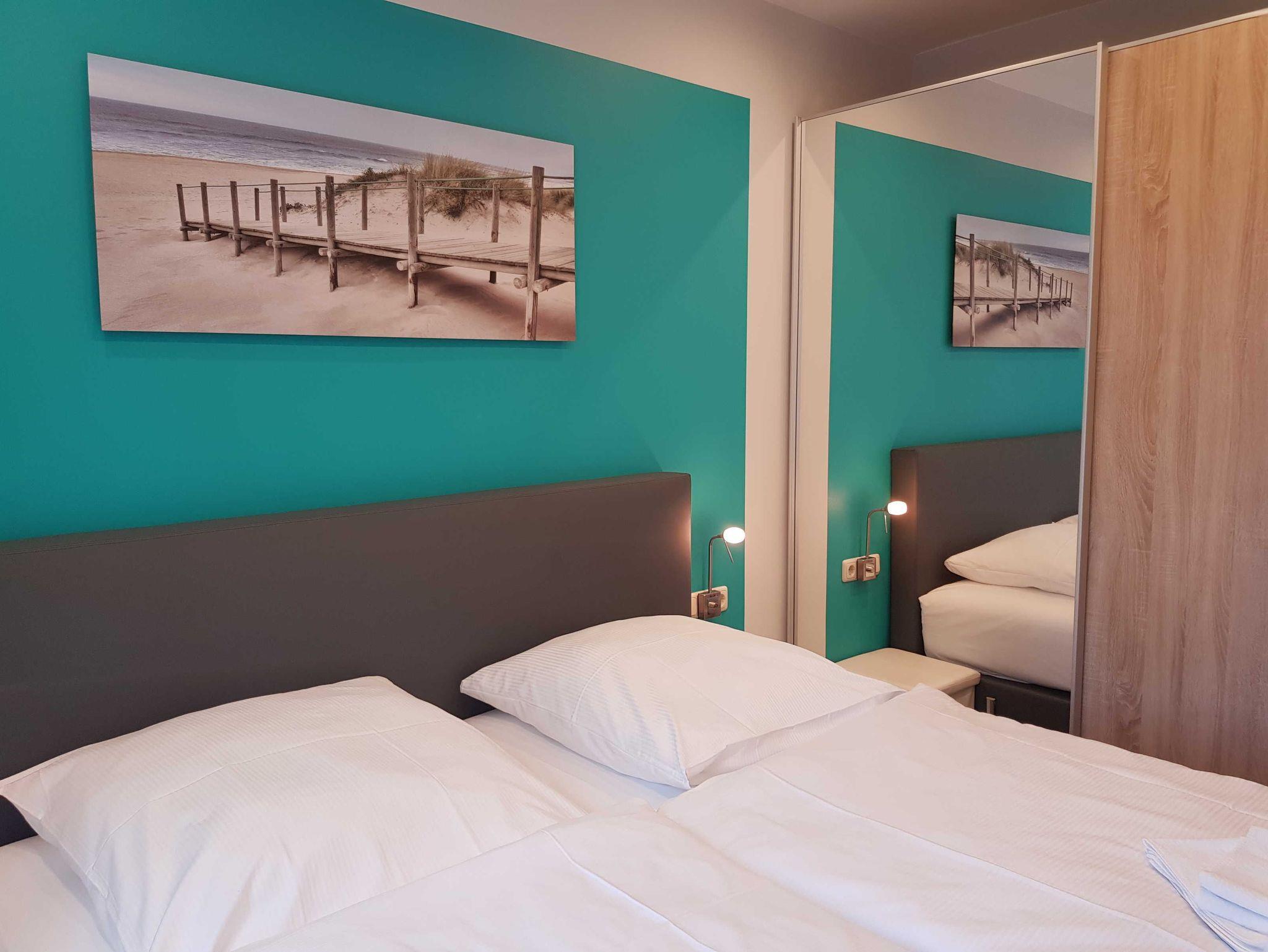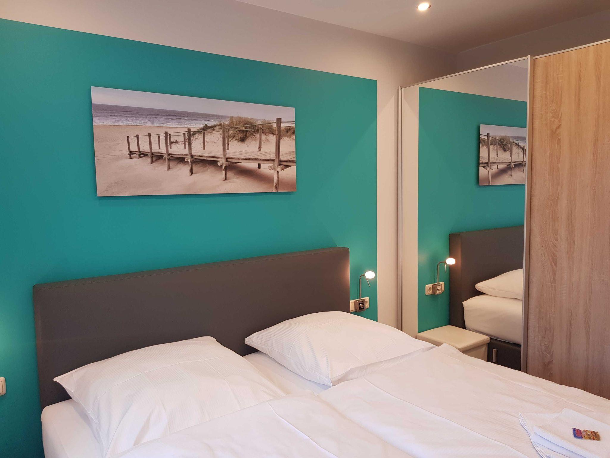 Wohnung mit 2 Schlafzimmern und 2 Boxspringbetten. Großes Wohnzimmer mit Esstisch für 6 Personen.