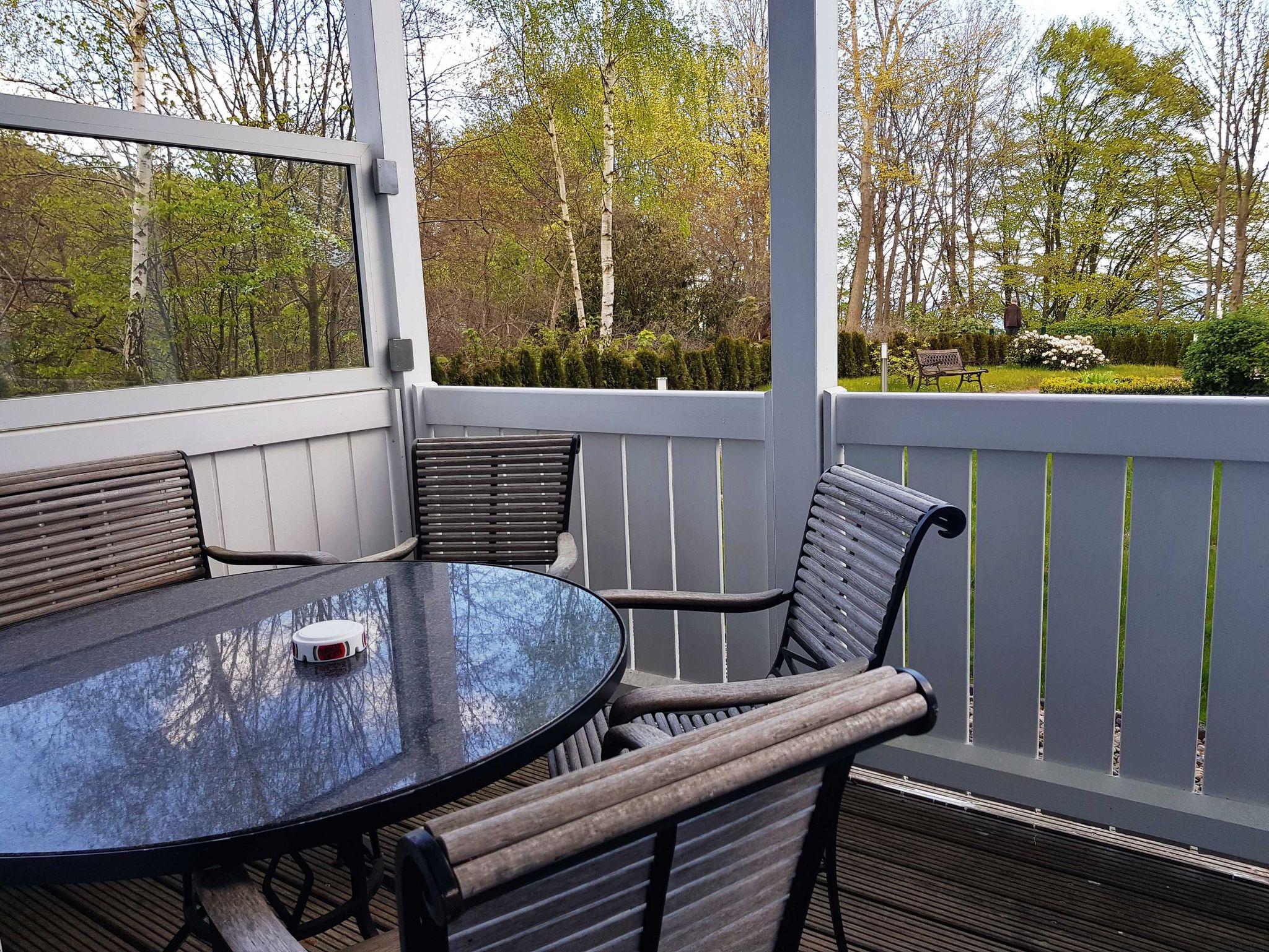 • Balkon mit Tisch und Stühle und Gartenzugang