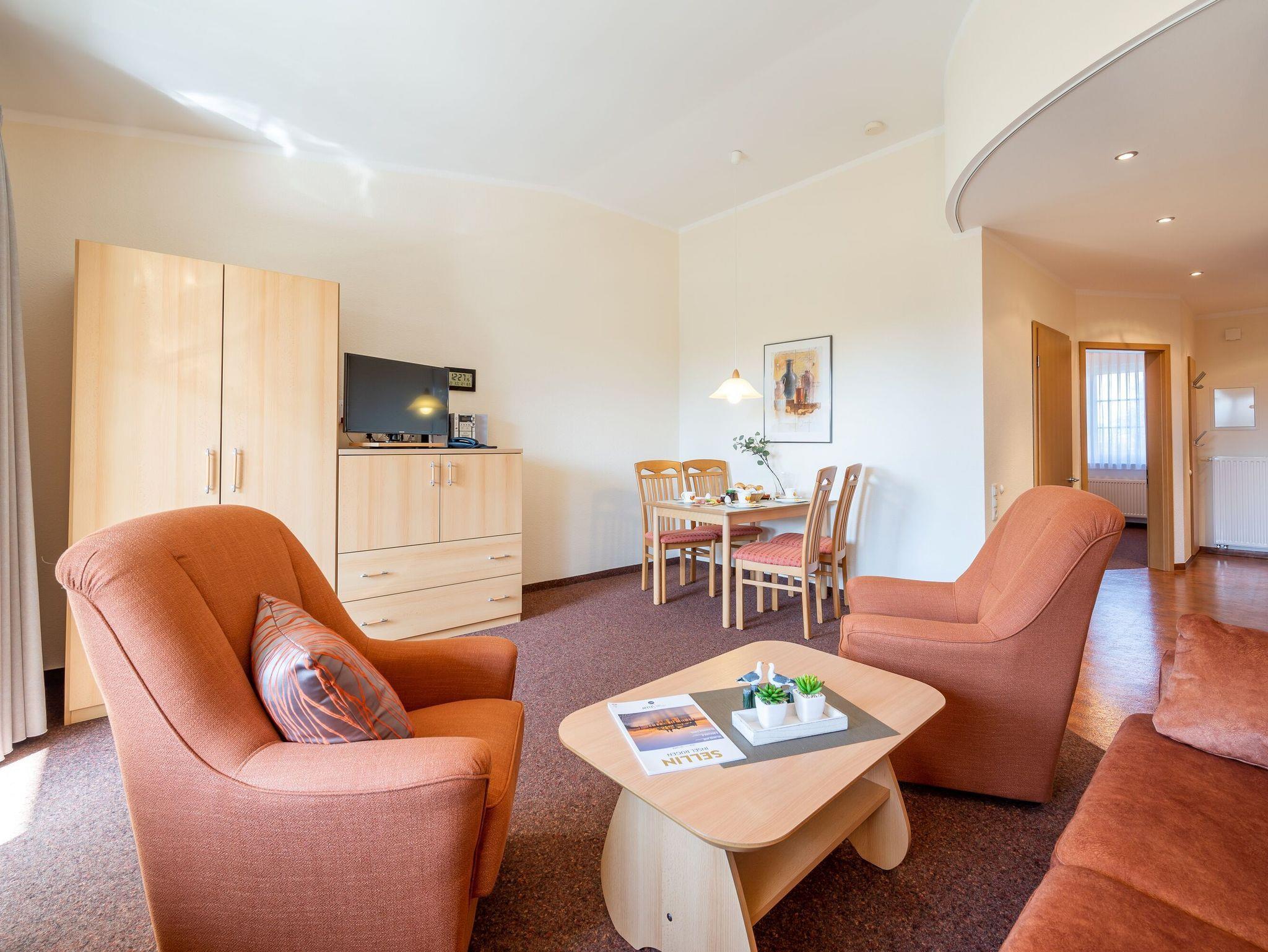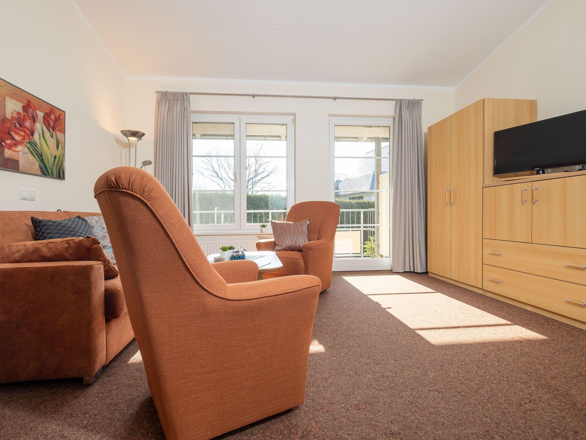 Das helle Wohnzimmer verfügt über eine Couchgarnitur, welche ebenso eine Aufbettung für 2 weitere Personen darstellt. Neben einem TV und einem kostenfreien WLAN-Zugang erreichen Sie von hier aus den sonnigen Balkon inkl. Balkonmöbel.
