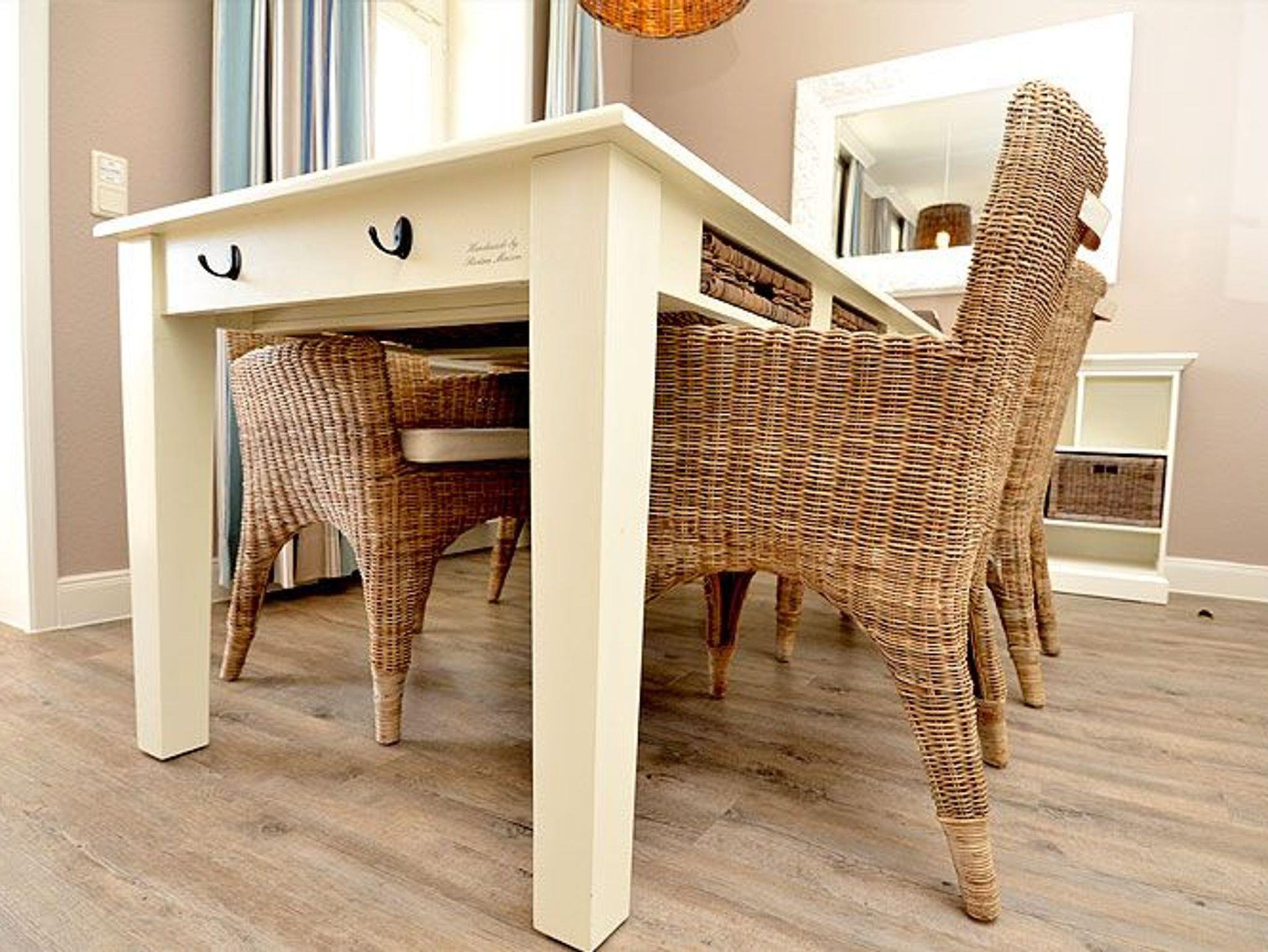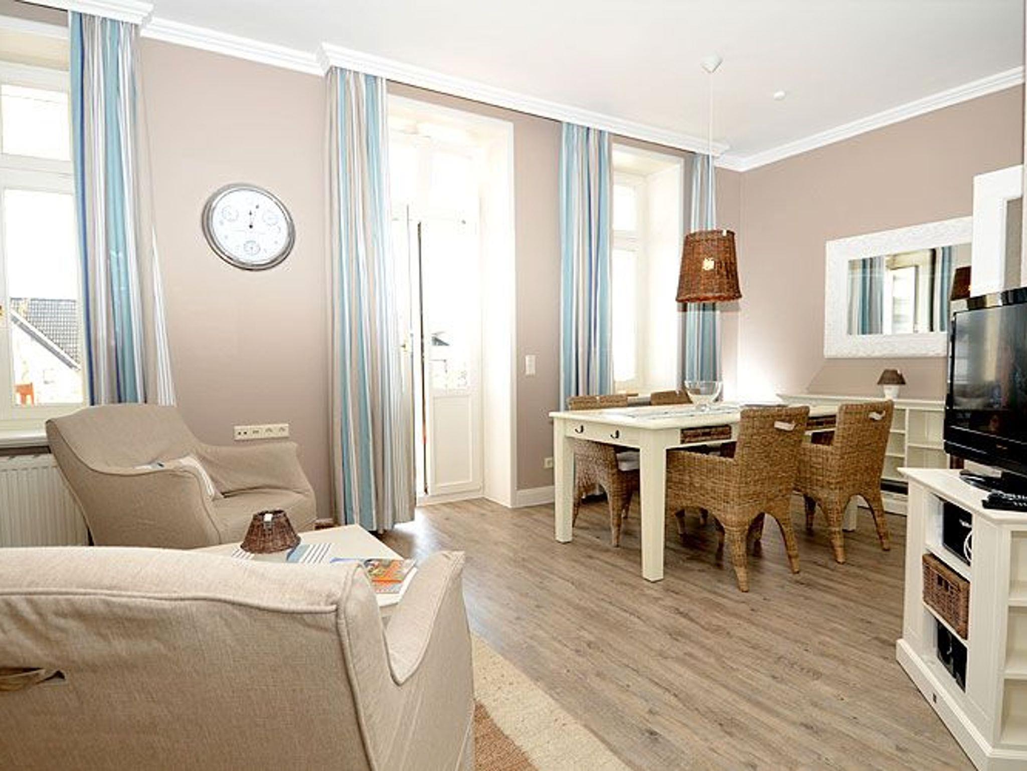 Dieses ca. 70 m² große und sehr stilvoll eingerichtete 3-Raum-Appartement erwartet Sie im 1. Obergeschoss und hat zusätzlich einen ca. 20 m² möblierten Holzbalkon im Bäderstil zur Morgensonne mit Blick auf die Wilhelmstrasse. Dieser Balkon mit Teakholz-Möblierung ist sowohl vom Wohnzimmer als auch vom Schlafzimmer aus zu betreten. Die wunderschönen Landhausmöbel, ausgesuchte Stoffe und die warmen Erdtöne schaffen mit den leicht maritimen Akzenten ein ganz einzigartiges Wohlfühlambiente.