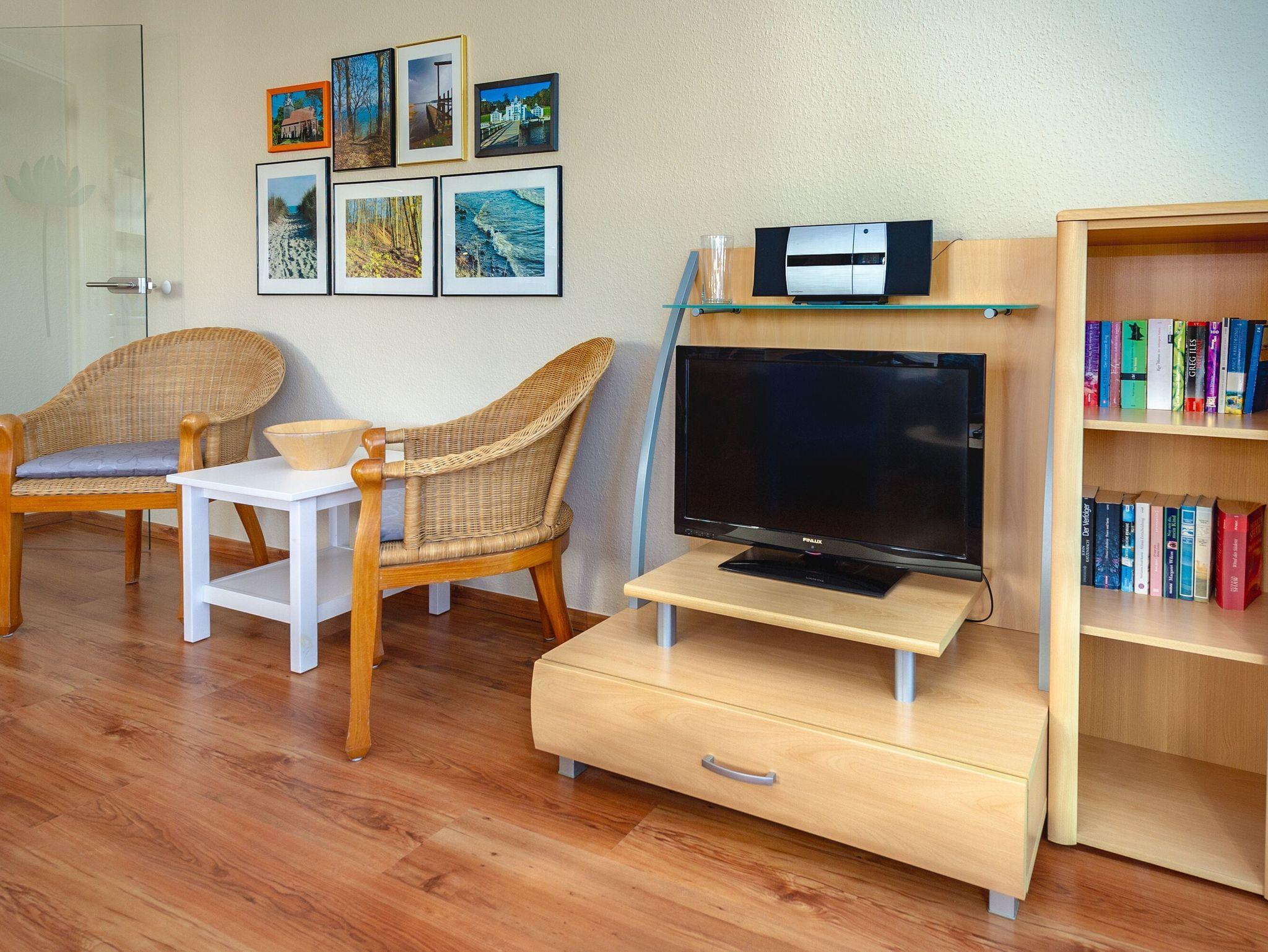 Der helle, freundliche Wohnraum ist mit einer bequemen Schlafcouch (Aufbettungsmöglichkeit für 2 Personen), zwei Sesseln, einem Flachbild-TV, einer Mini-Stereoanlage mit CD-Player und einem Esstisch ausgestattet. Internet per W-LAN steht kostenfrei zur Verfügung.