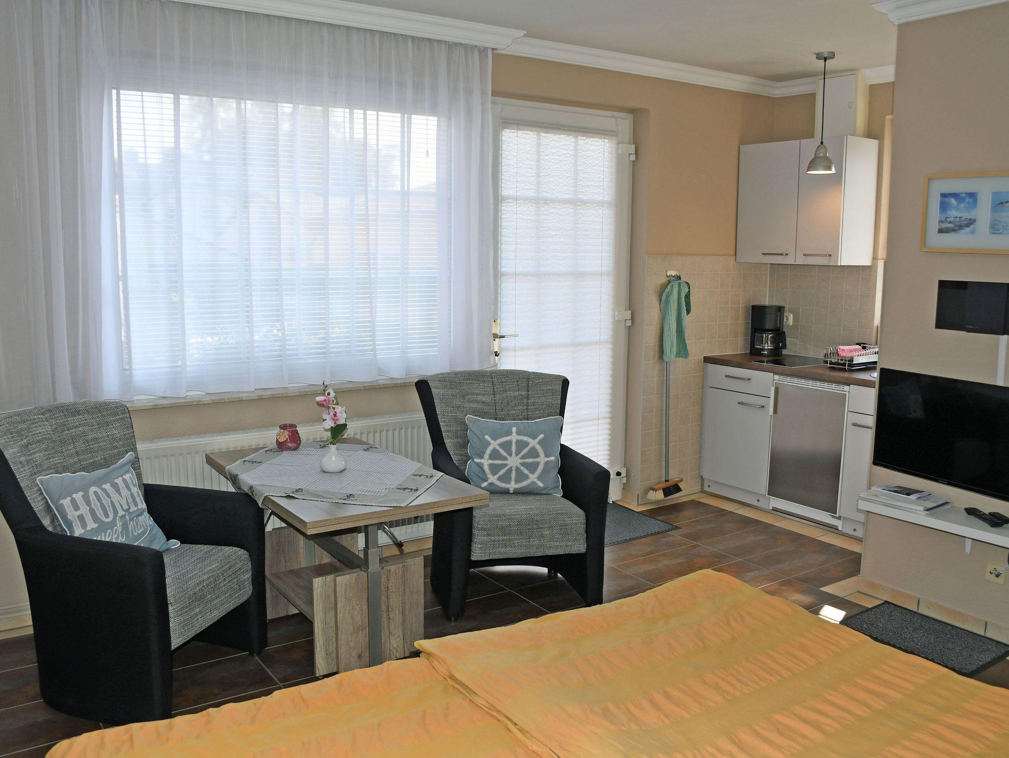 Die Ferienwohnungen Beatrix verfügen über einen kombinierten Wohn- und Schlafraum mit Pantryküche und ein Bad. Im Wohnraum befindet sich ein bequemes Doppelbett, ein Tisch mit Stühlen und ein TV-Gerät. Die kleine Pantryküche ist mit Kühlschrank, Herd, Taoaster, Wasserkocher und Kaffemaschine ausgestattet. Im modernen Bad gibt es eine Dusche, WC und Waschbecken. Bettwäsche wird selbtsverständlich von uns bei Anreise bereitgestellt. Handtücher bitten wir selbst mitzubringen.