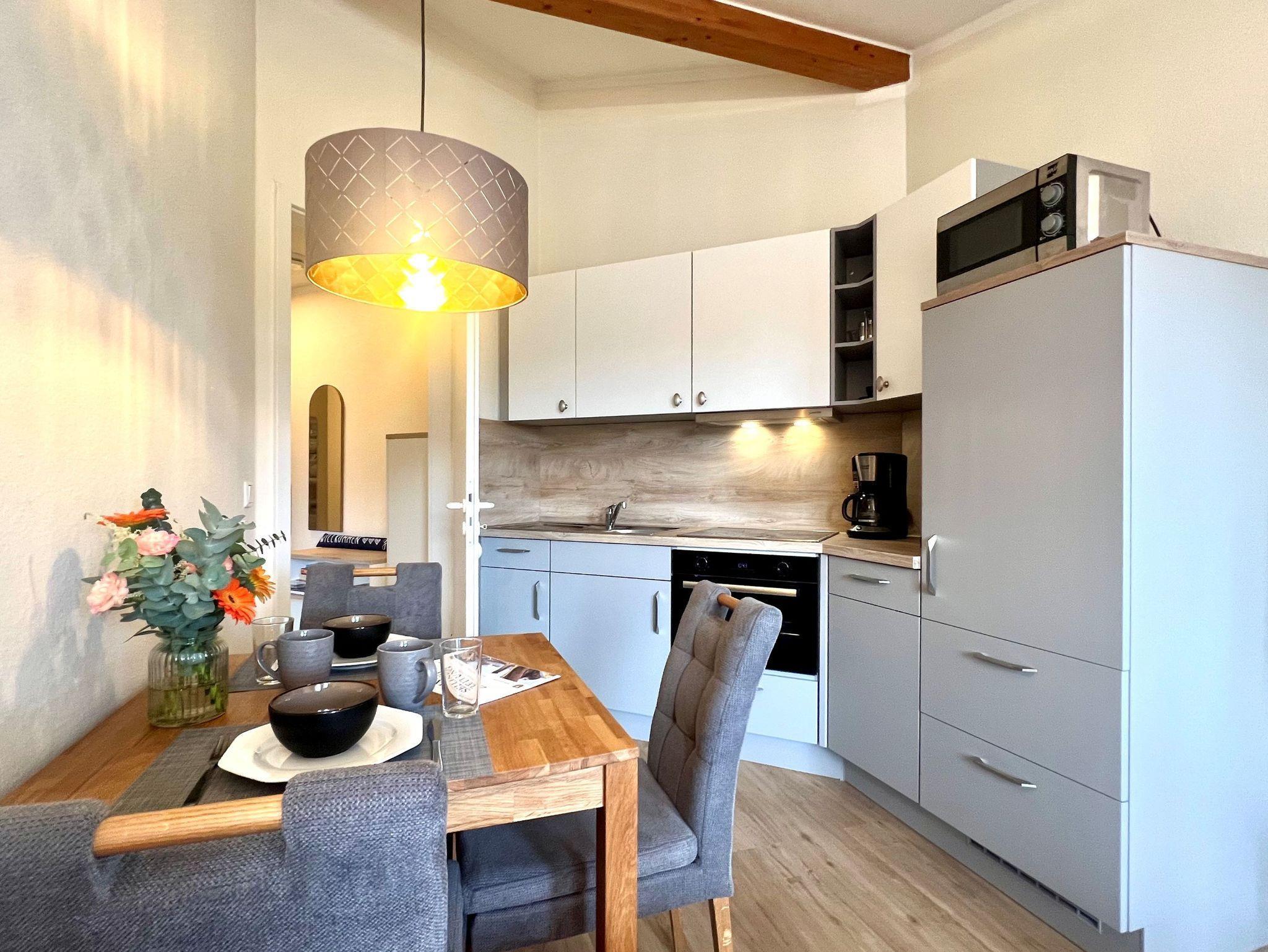 Die Wohnung ist mit zwei Fernsehgeräten (Wohnzimmer-Smart TV und Schlafzimmer), einer Kaffeemaschine (Filter), einer Mikrowelle, einem Geschirrspüler, einem Backofen, zahlreicher zusätzlicher Küchenhelfer und kostenloser Bettwäsche ausgestattet. Auf dem Balkon können Sie entspannte Stunden verbringen und die offene Wohnküche lädt zum gemeinsamen Kochen ein. Für die Aufbewahrung Ihrer Fahrräder steht Ihnen ein Fahrradkeller zur Verfügung und über den WLAN Anschluss bleiben Sie auch im Urlaub online. Auch der TV-Empfang mit Sky-Sendern ist inklusive. Eine Pad-/Kapsel-Kaffeemaschine sowie ein Brötchenservice sind zusätzliche Annehmlichkeiten für einen gelungenen Aufenthalt.