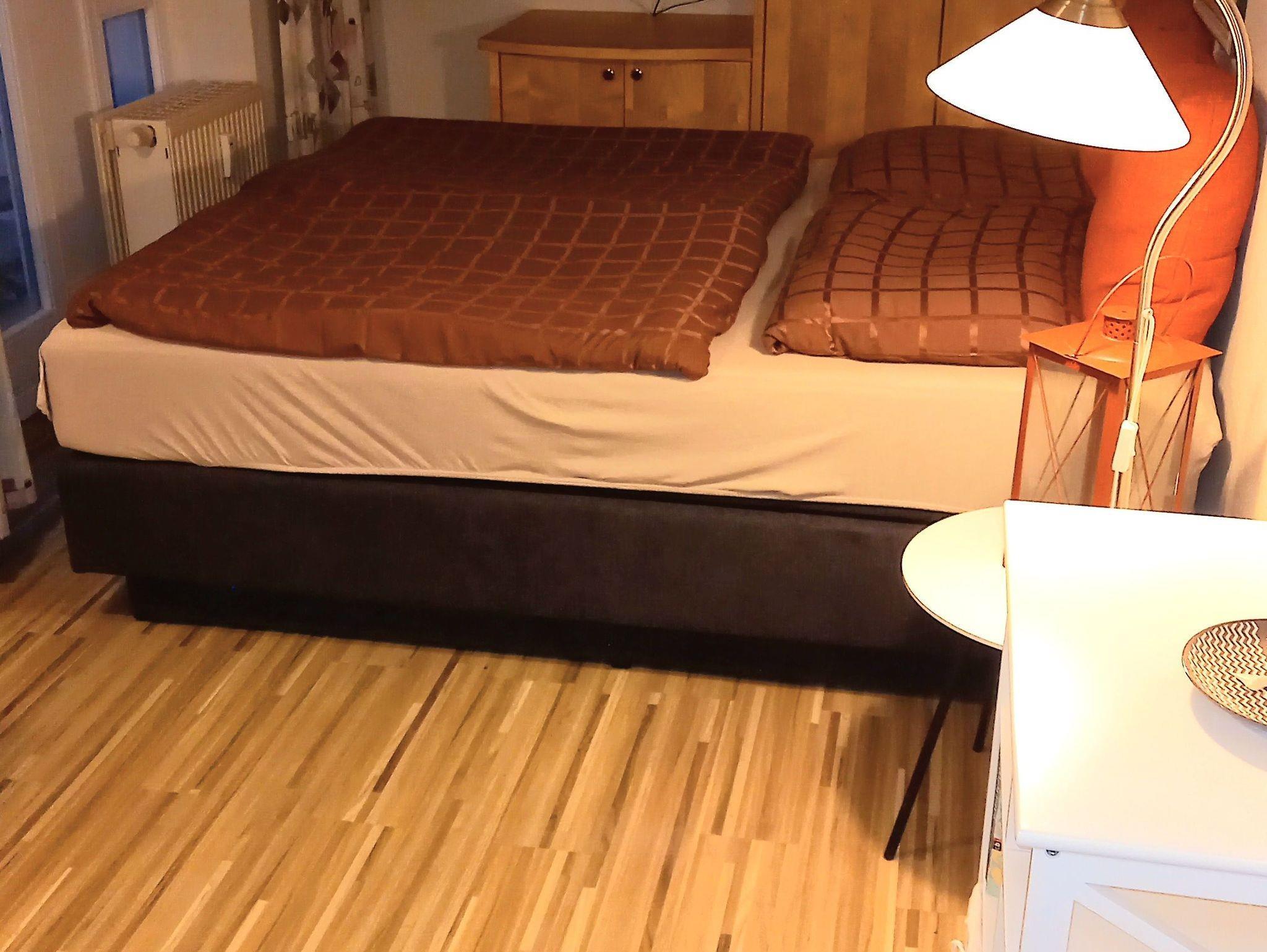 1 kombinierter Wohn-Schlafraum mit Küchenzeile, 1 Bad mit Dusche und WC, 1 Balkon in Südwestrichtung, Küchenzeile mit üblichem Geschirr und Besteck, Töpfe, Kaffeemaschine, Toaster, 2 Ceran-Herdplatten, Mikrowelle, Kühlschrank mit Gefrierfach, Flachbildfernseher, Stereoanlage (CD, Radio),
