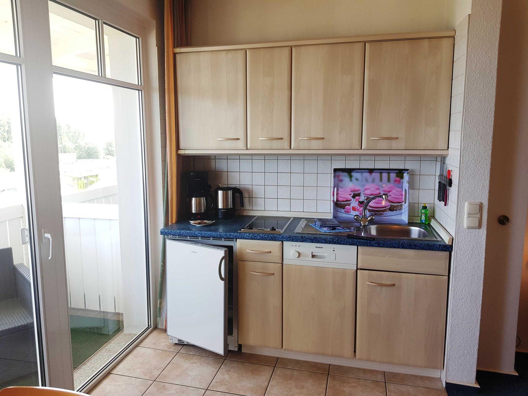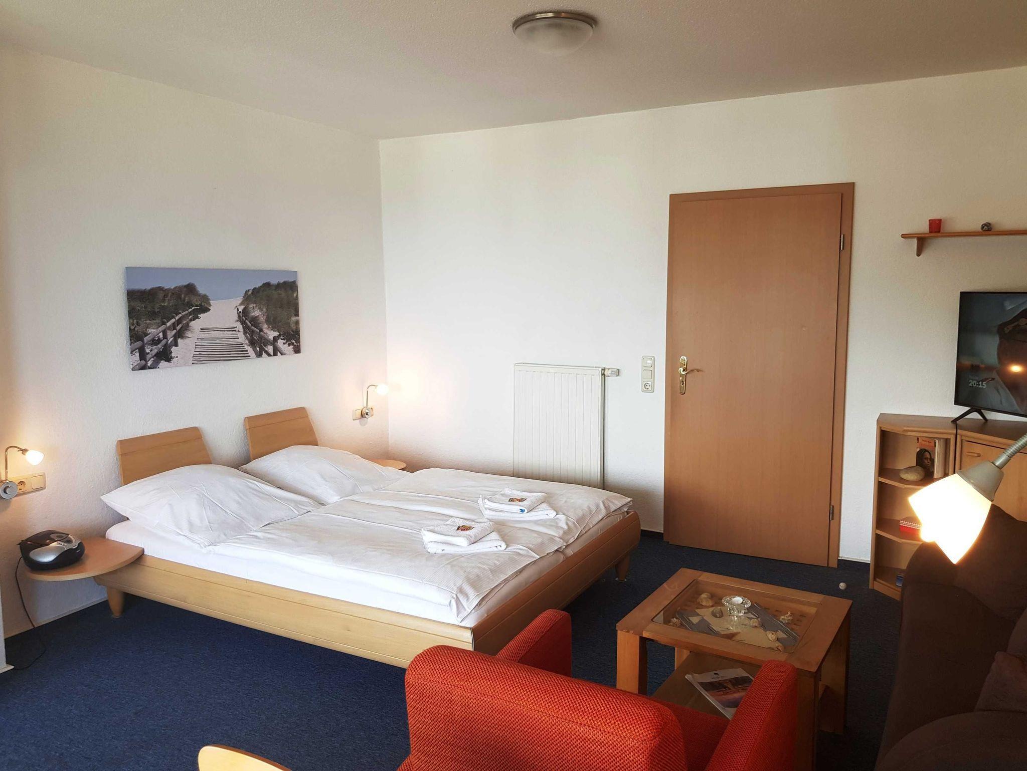 Das 1 Raum Appartement mit Wohn-Schlafraum und Doppelbett für 2 Personen , Esstisch, Kabel-TV,CD Stereoanlage , gut ausgestattete Küchenzeile mit Geschirrspüler, Kaffeemaschine, Toaster und Microwelle. Babybett ( ohne Wäsche )und Hochstuhl für die kleinen stellen wir für10 Euro zur verfügung ( bitte vorbestellen ) .
