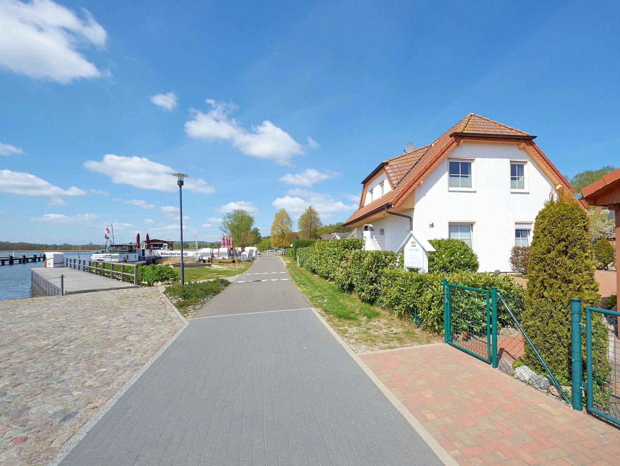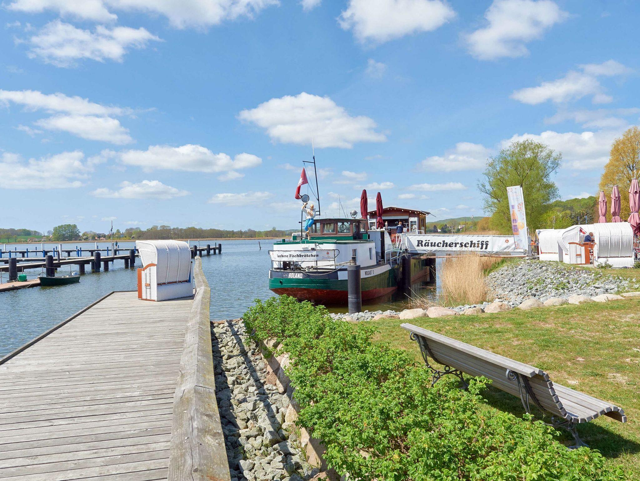 Zu dieser Wohnung gehört eine schöne Terrasse zur West-/Süd-Seite mit einem Grillkamin, einem Tisch mit Stühlen, einem Sonnenschirm und einem herrlichen Blick über den Selliner See.