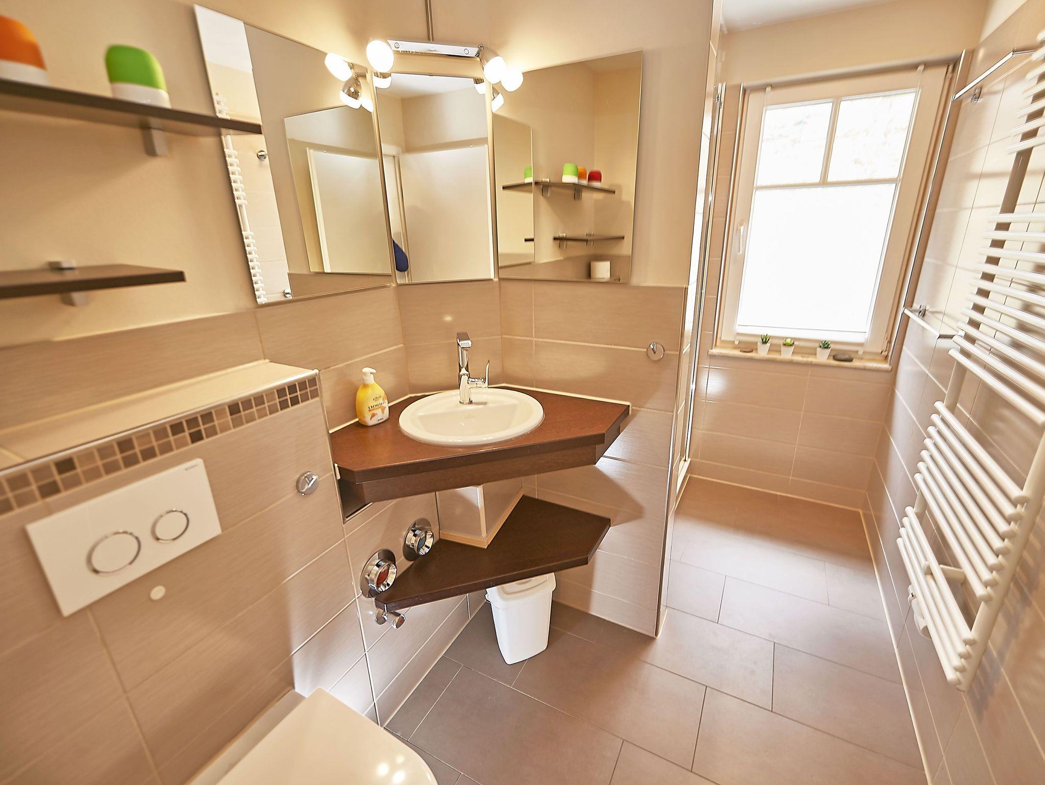 Das elegant geflieste Tageslichtbad überzeugt mit einer großen Dusche, WC, beleuchtetem Waschtisch und beheizbarem Handtuchwärmer. Seit Neuestem komplettiert darüber hinaus eine private Sauna (Münzautomat) den hervorragenden Gesamteindruck der Ausstattung.