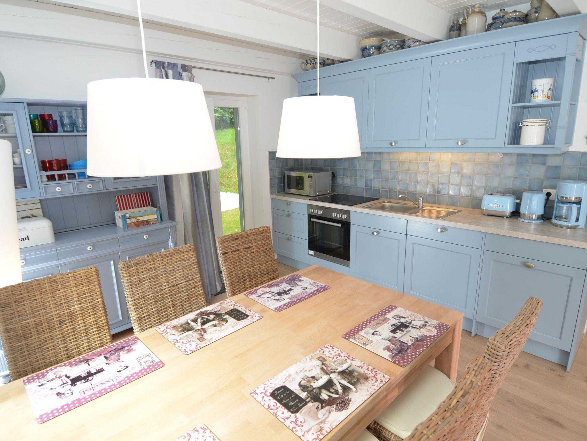 Vom Eingangsbereich aus gelangen Sie in den geräumigen, offenen und hellen Wohn-/Essbereich mit einer bequemen Couch, einem 105´´ Flachbild-TV sowie einem Radio mit CD-Player. Eine Fußbodenheizung sorgt hier auch in der kühleren Jahreszeit für eine behagliche Atmosphäre. Die komplett ausgestatte, integrierte Küchenzeile verfügt über ein Cerankochfeld mit Backofen, einen Geschirrspüler, eine Mikrowelle, Kaffeemaschine, Wasserkocher, Toaster und diverses Kleininventar.