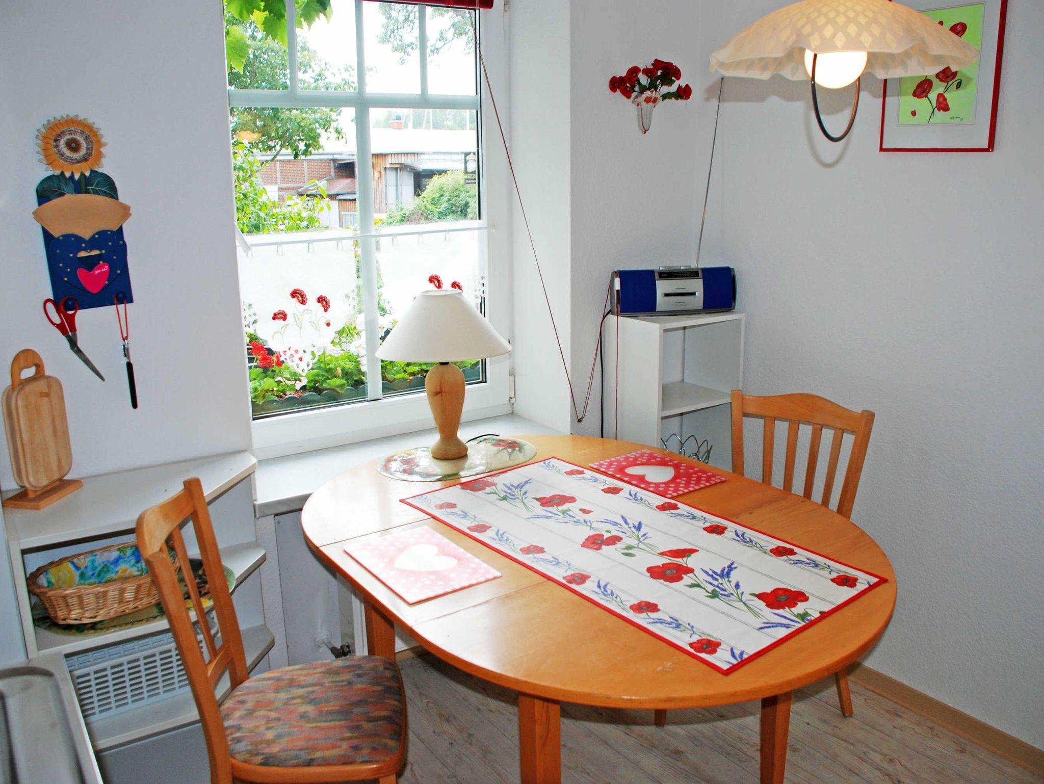 Es verfügt über einen separaten Eingang, der ins Hochparterre des Appartementhauses führt. Ein großer Kaminofen sorgt besonders in der kälteren Jahreszeit nach einem Strandspaziergang für Wärme und Gemütlichkeit. Das modern ausgestatte Appartement bietet einen kombinierten Wohn- und Schlafraum mit Doppelschlafcouch, zwei Sesseln und einem Tisch sowie TV. In der kleinen Küche stehen ein Herd, Kühlschrank, Spüle, Kaffeemaschine, Wasserkocher und ein Esstisch mit Stühlen zur Verfügung. Das Bad verfügt über Dusche, Waschbecken und WC.
