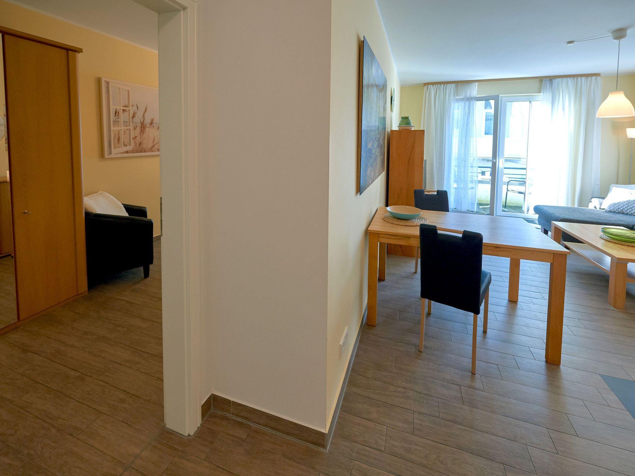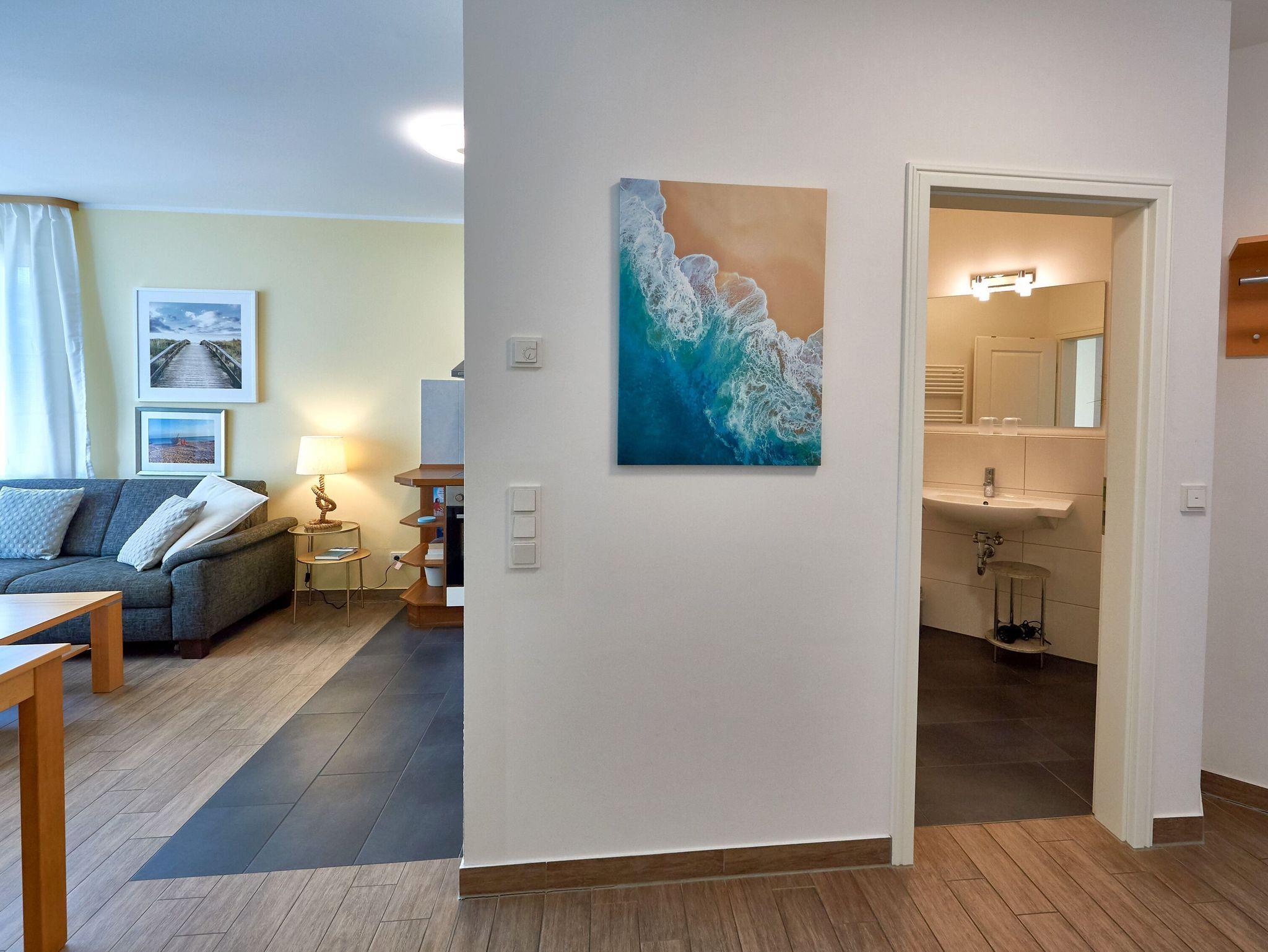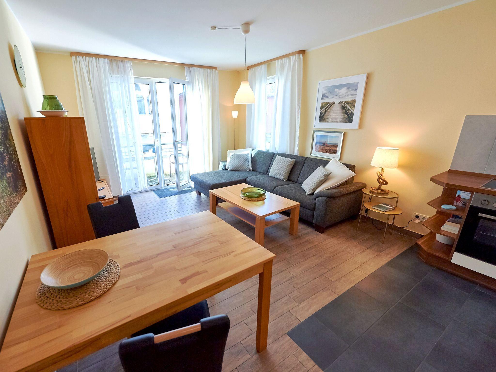 Vom Eingangsbereich gelangen Sie durch die großzügige Diele in den modern eingerichteten Wohn- und Essbereich, der mit einem großen SMART-TV, einem DVD-Player und einer Stereoanlage mit CD-Player ausgestattet ist. Machen Sie es sich auf der gemütlichen Couch (Aufbettungsmöglichkeit für eine Person) bequem. Wer seine Lieblingsfilme streamen oder mobil arbeiten möchte, wird sich darüber hinaus über das schnelle W-LAN von bis zu 50 Mbit/s freuen.