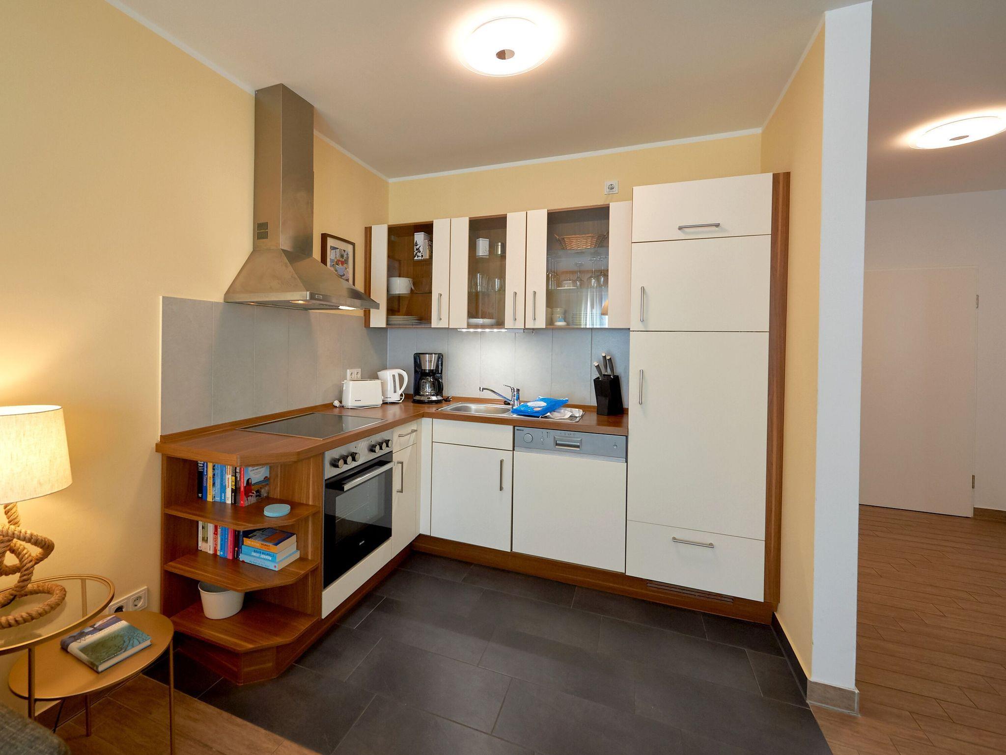 Die harmonisch im Wohnbereich integrierte Küchenzeile ist mit einem Kühlschrank mit Gefrierfach, einem Backofen, einem 4-Zonen-Cerankochfeld sowie einer Spülmaschine und diversem Kleininventar, das die Küchenausstattung komplettiert, eingerichtet. Bis zum nächsten Bäcker und zum Edeka-Einkaufsmarkt sind es nur jeweils ein paar Gehminuten. Speisen können Sie wahlweise am Esstisch im Wohnzimmer oder nach Belieben gern auch draußen auf dem möblierten Balkon.