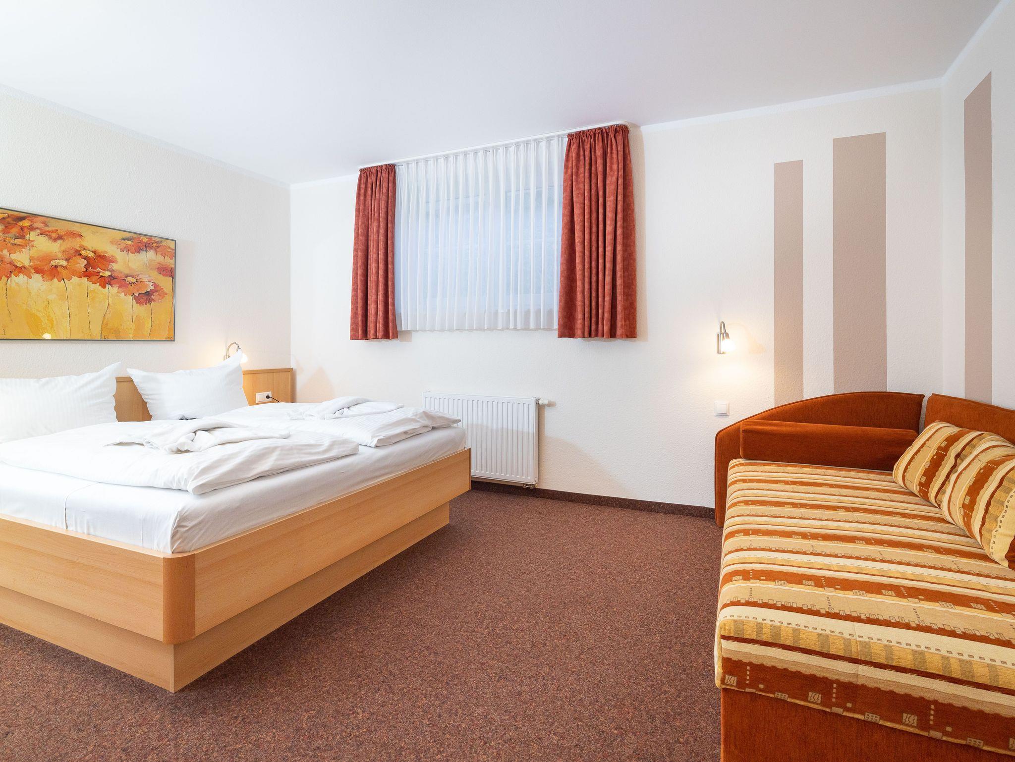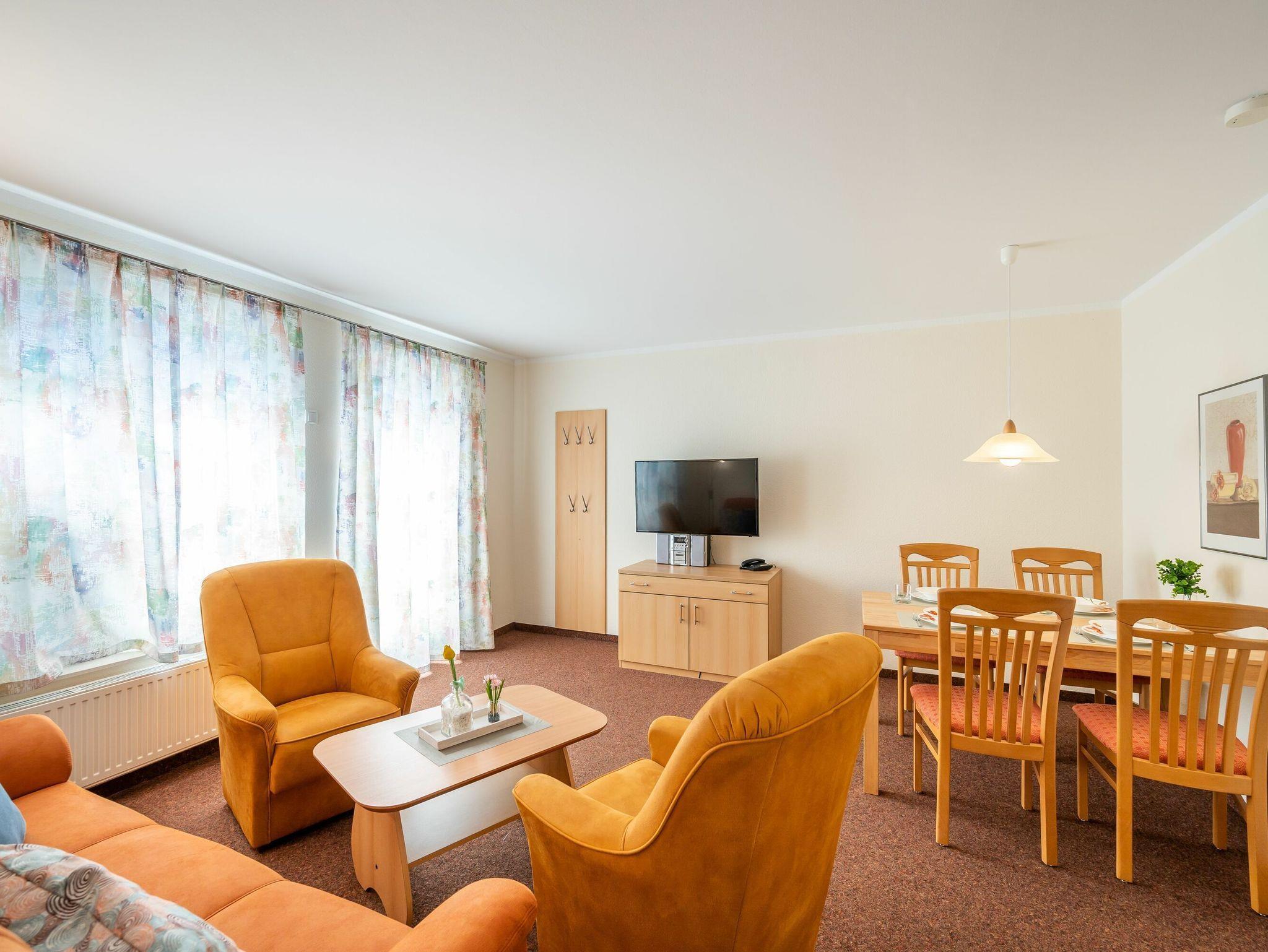 Das helle Wohnzimmer verfügt über eine Couchgarnitur, einen TV und einen kostenfreien WLAN-Zugang. Zudem erreichen Sie von hier aus die sonnige Terrasse inkl. Terrassenmöbel.