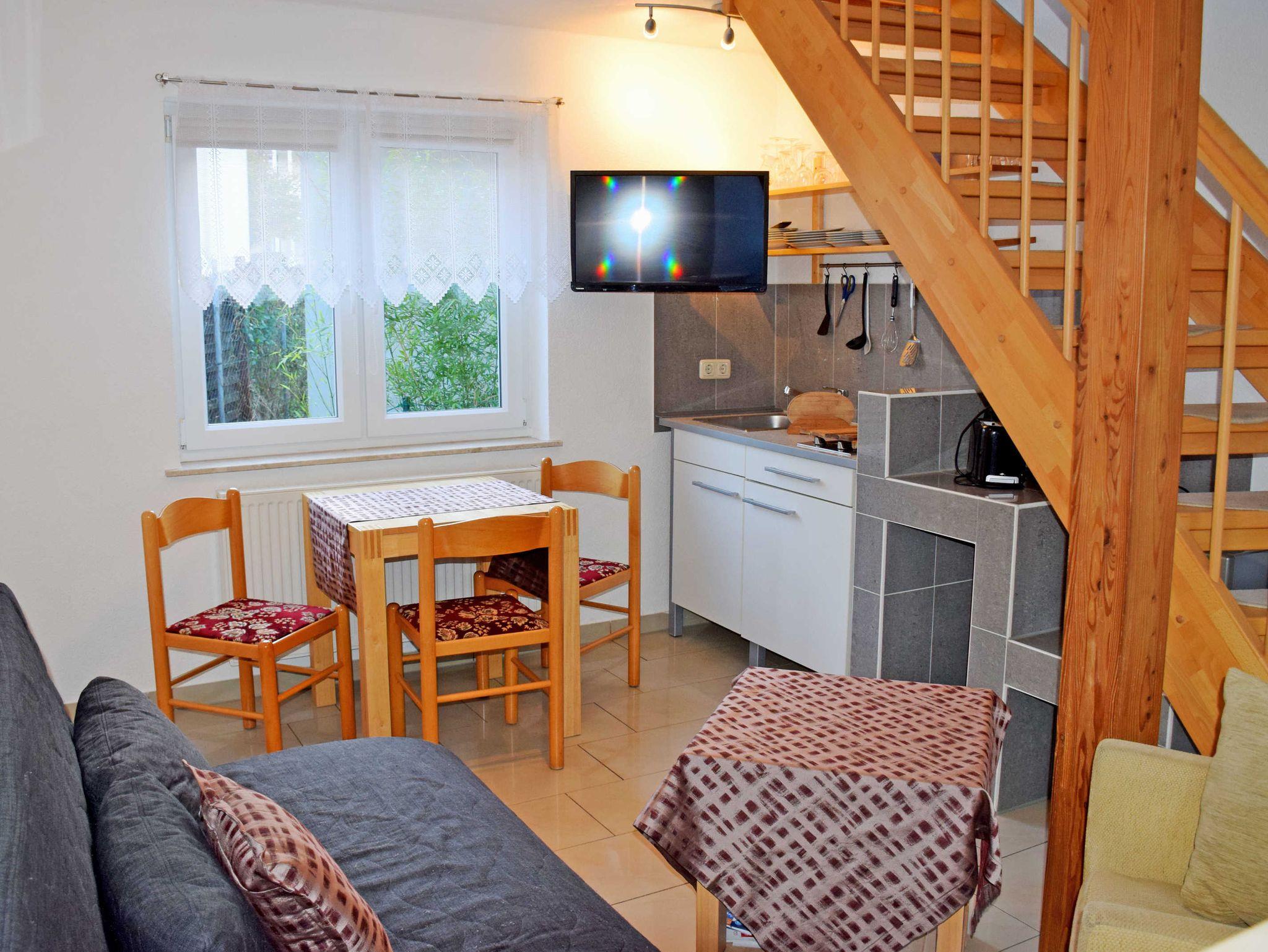 Das Ferienappartement ist ca. 35 qm groß und ist für maximal 2 Erwachsene geeignet. Es wurde liebevoll sowie komfortabel eingerichtet. In diesem Appartement befindet sich das Wohnzimmer im Erdgeschoss mit einer Couch welche auch als zusätzliche Schlafgelegenheit bietet, einer Küchenzeile (zwei Plattenherd) sowie einer Essecke. Diese Wohnung ist nach oben hin offen. Im Obergeschoß befindet sich ein Schlafzimmer mit einem Doppelbett, Bad / Dusche und WC welche durch eine Treppe zu erreichen sind. Dieses verleiht dieser Wohungen ein offenes Wohungsgefühl.