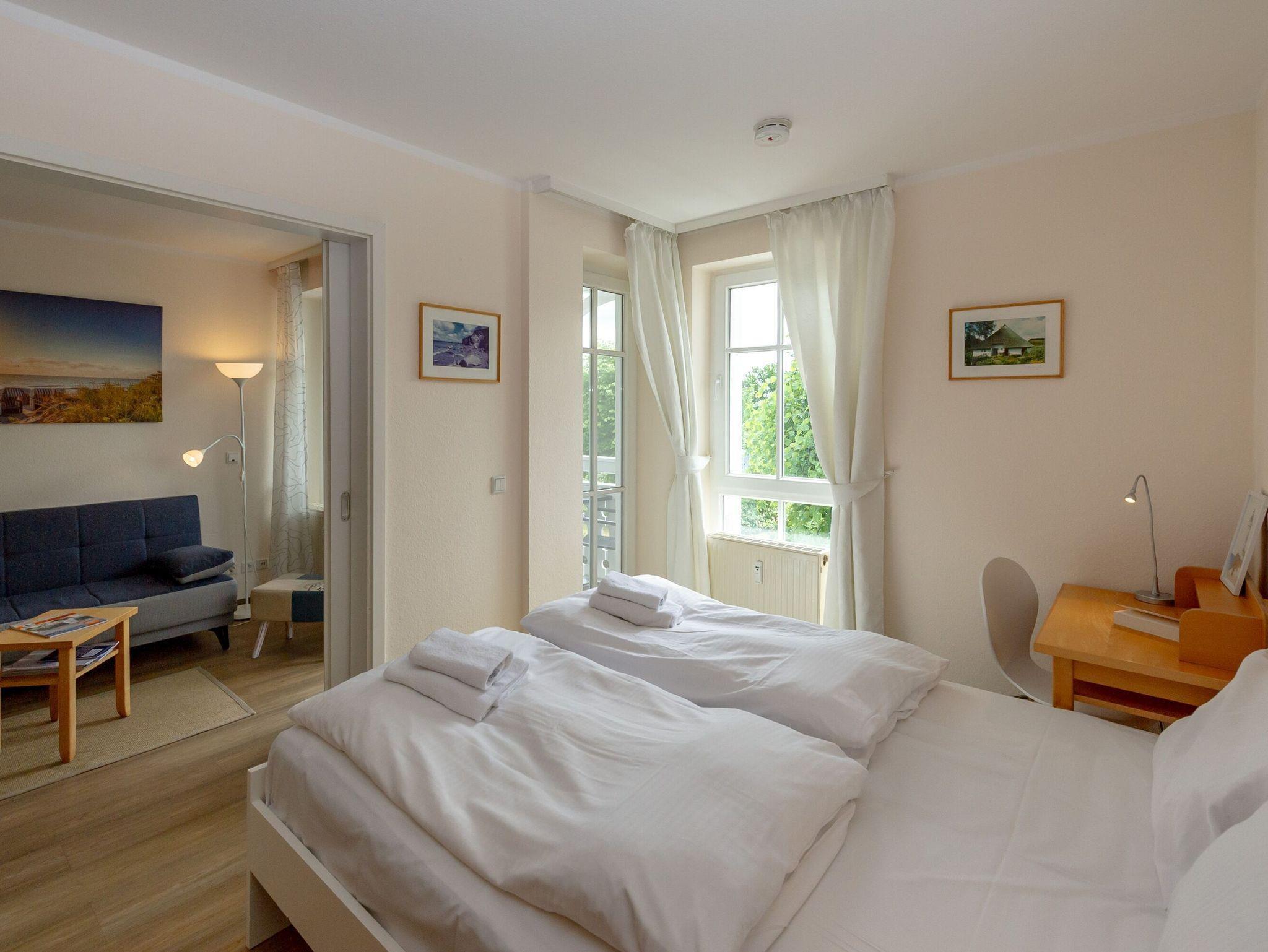 Das Schlafzimmer kann durch eine Schiebetür vom Wohnbereich getrennt werden. So bietet es auch auf kleinem Raum eine Rückzugsmöglichkeit. Für Ihren erholsamen Schlaf steht ein Doppelbett (160 x 200 cm) mit getrennten Matratzen bereit. Der geräumige Kleiderschrank und ein kleiner Schreibtisch mit Stuhl komplettieren den Komfort.